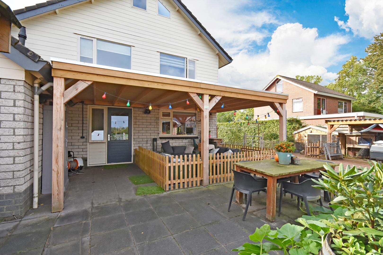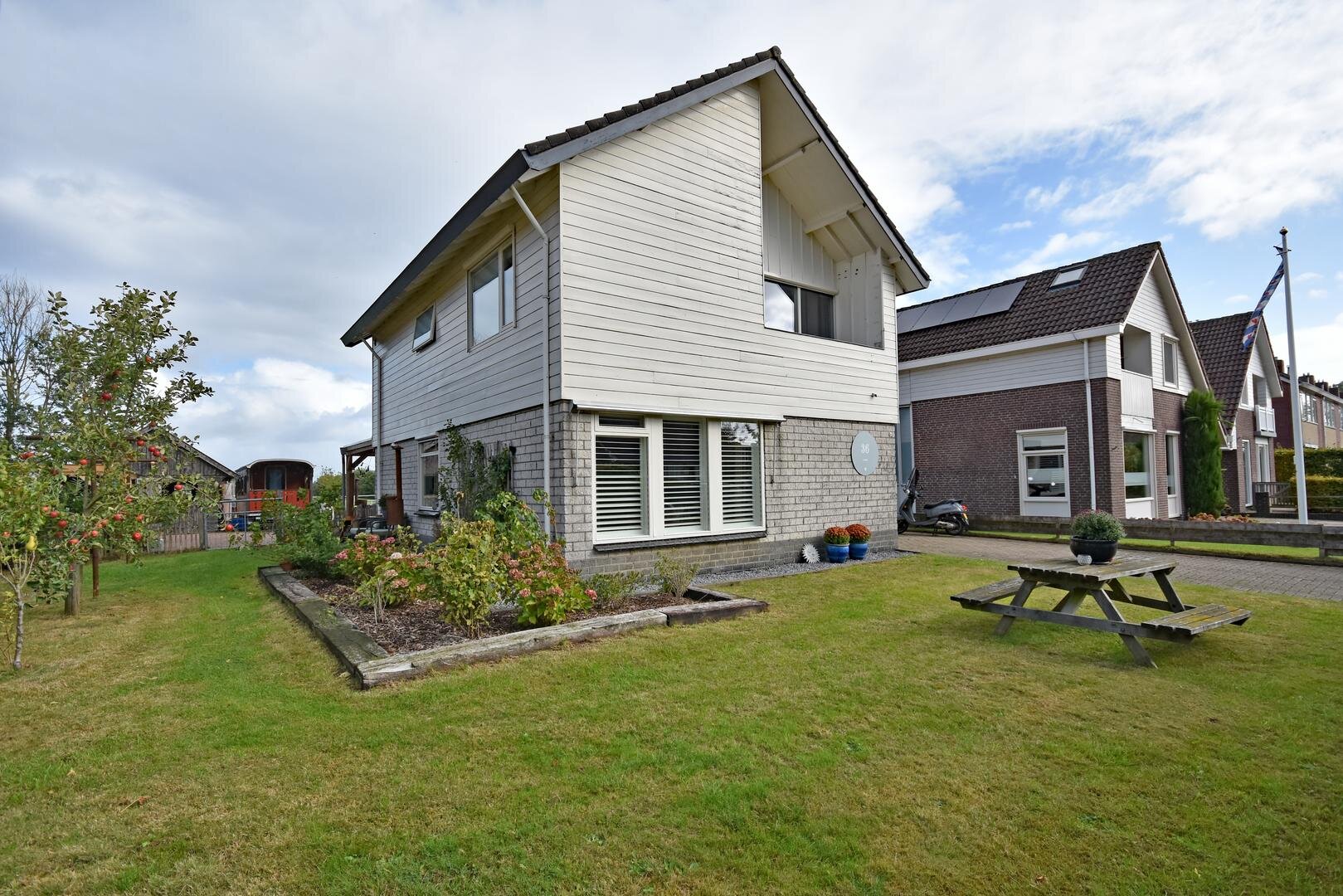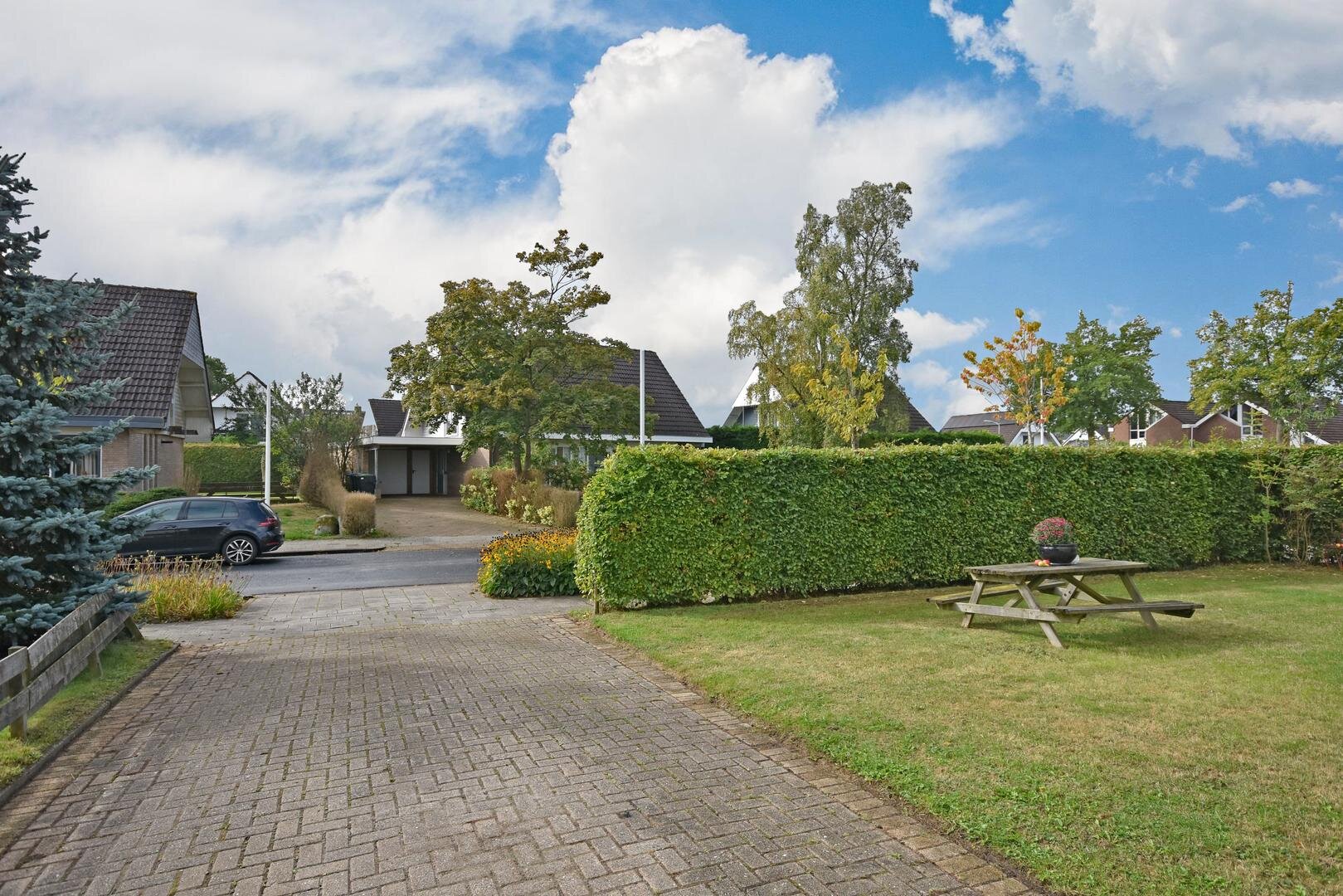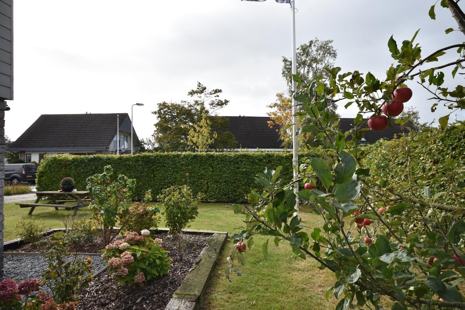 De zonnige voortuin is groen en privacy vol ingericht met o.a. fruitboompjes, een grasveldje, een ruime oprit en een praktische carport.