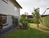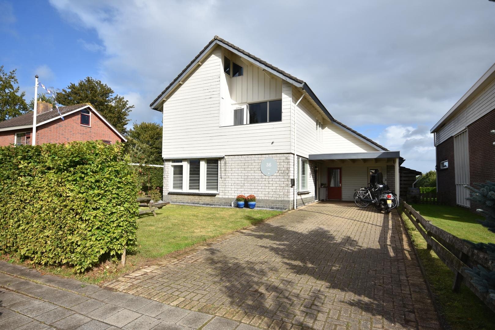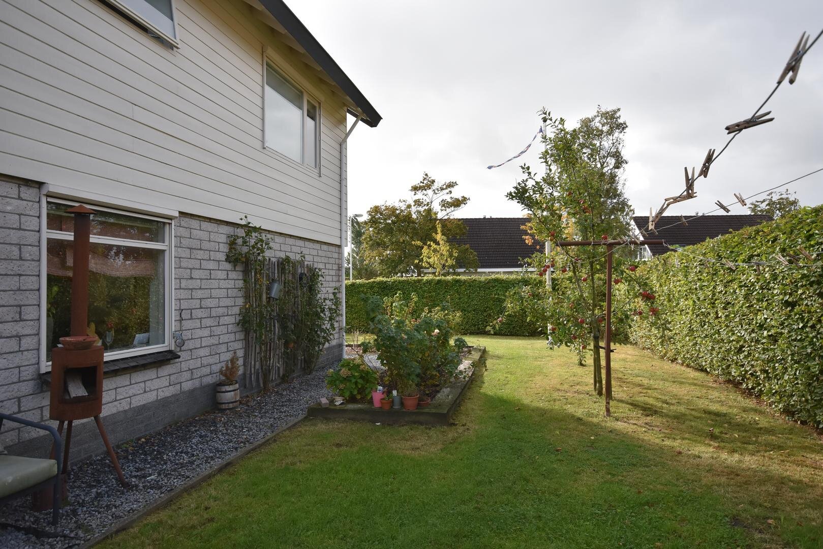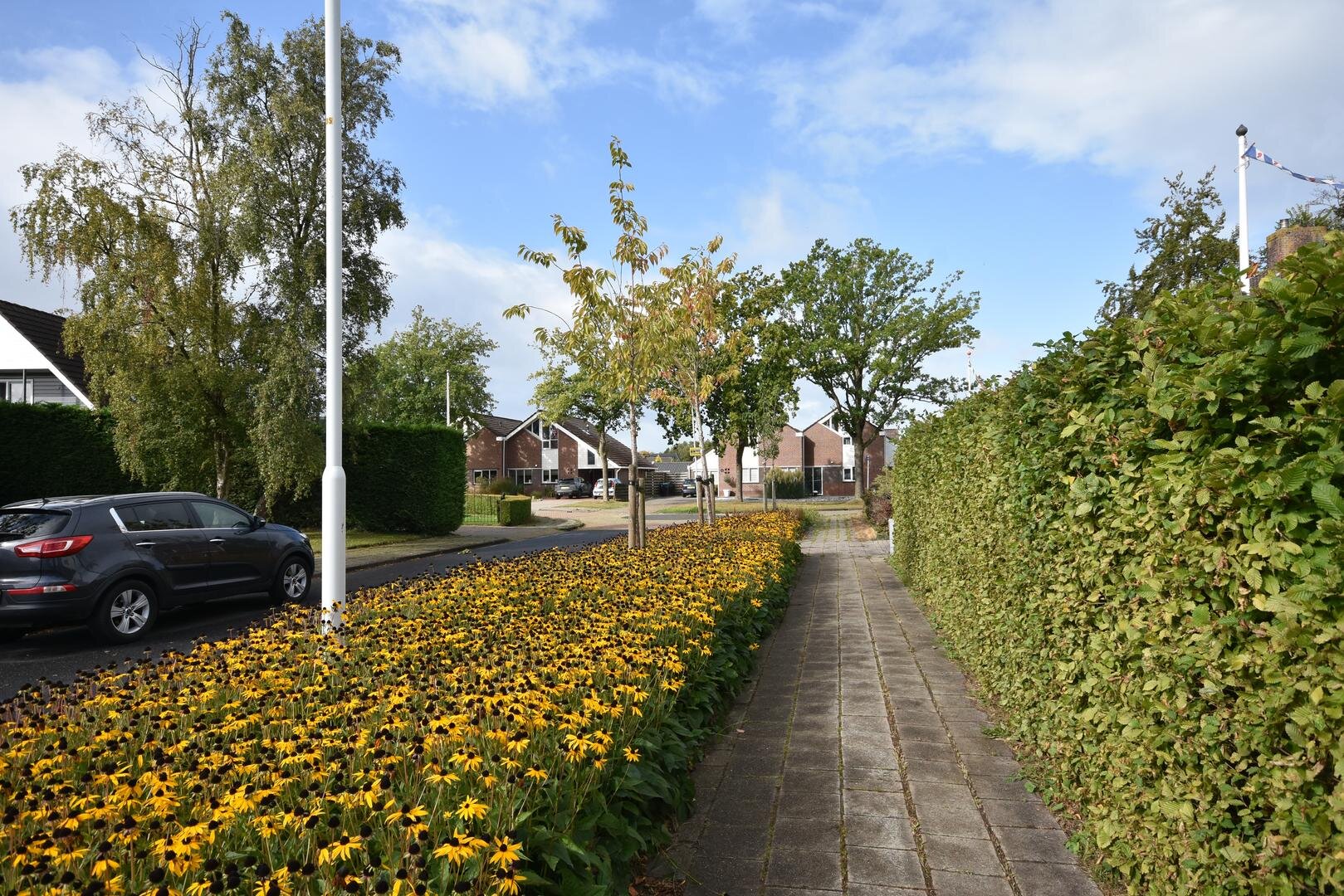 De zonnige voortuin is groen en privacy vol ingericht met o.a. fruitboompjes, een grasveldje, een ruime oprit en een praktische carport.