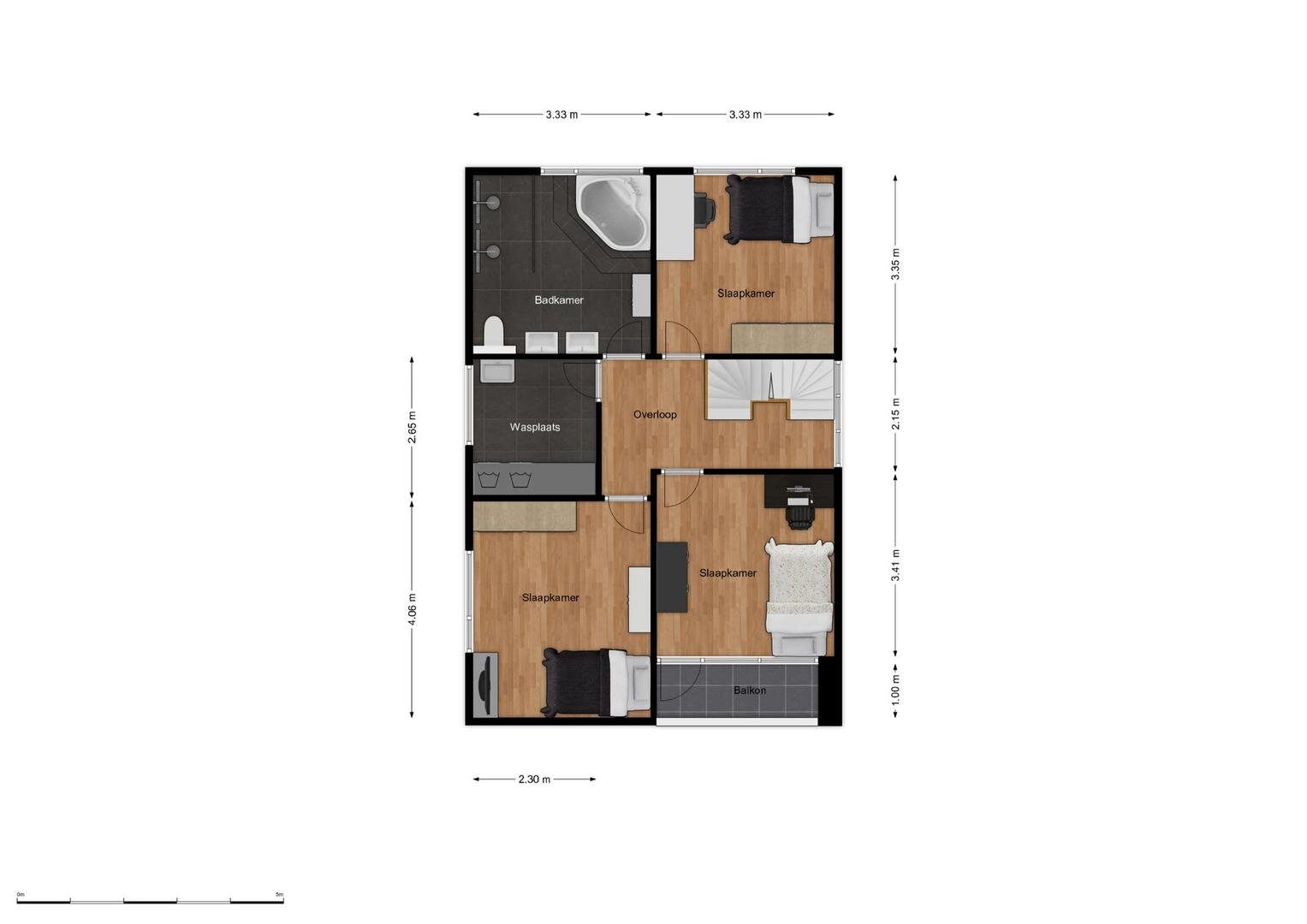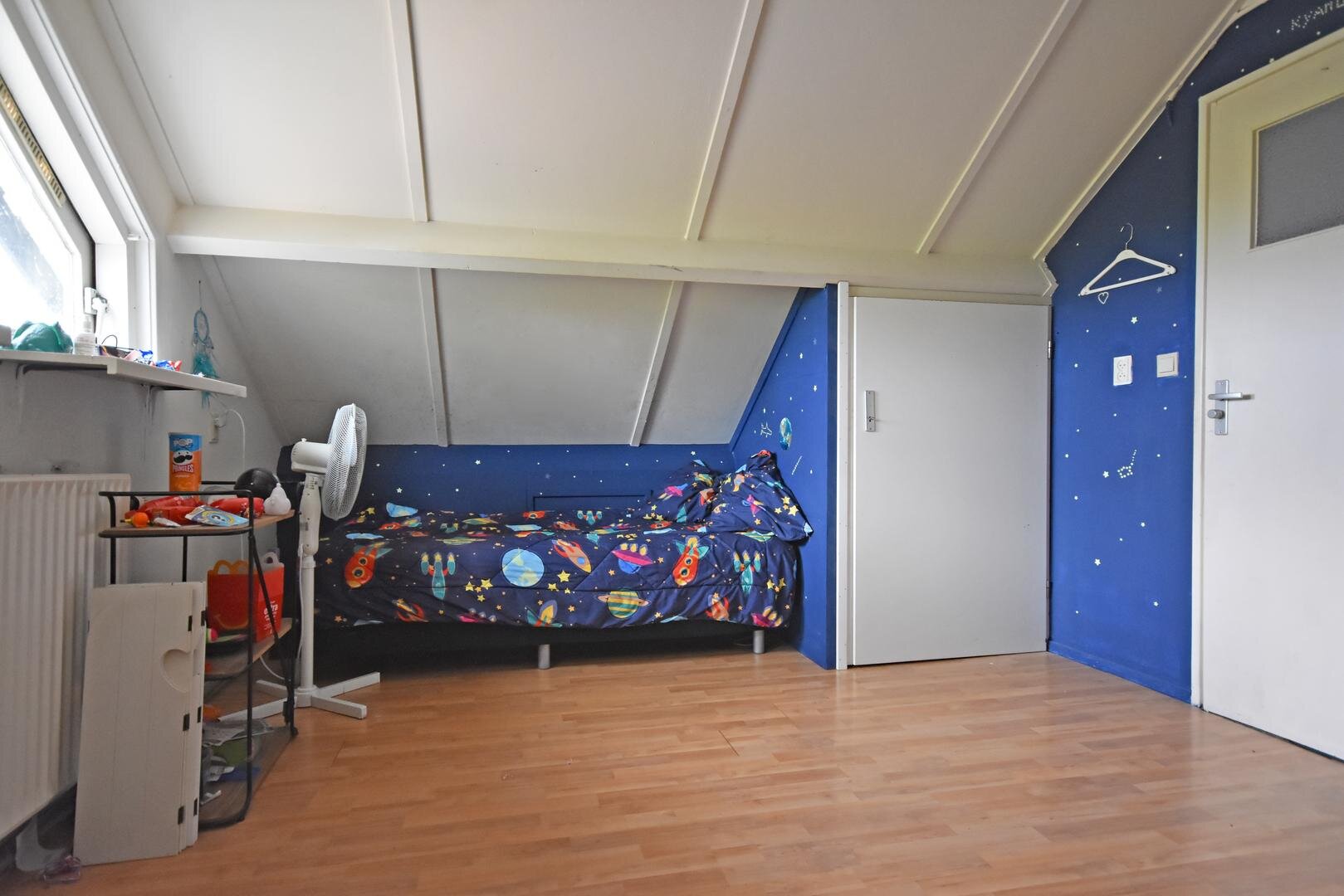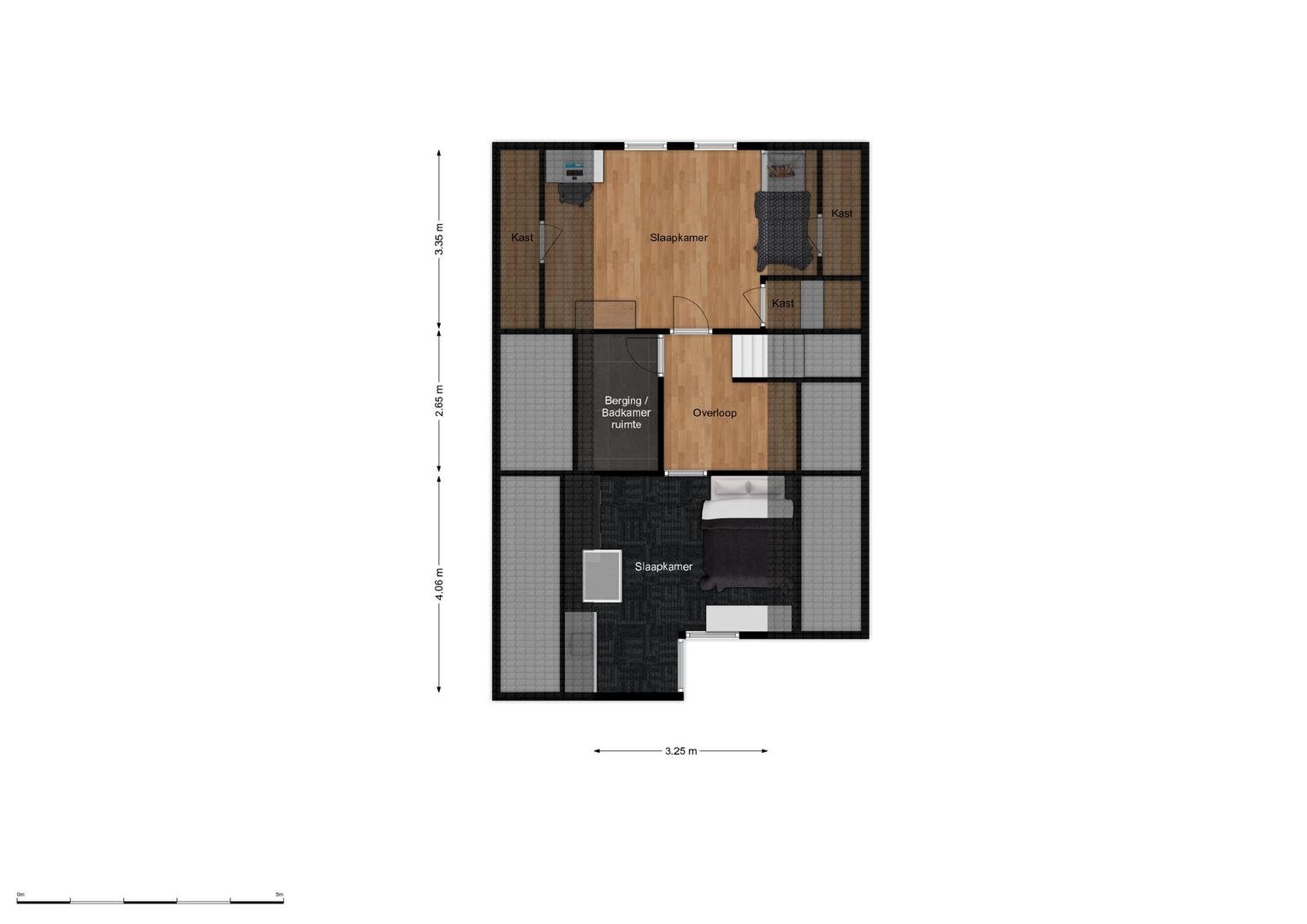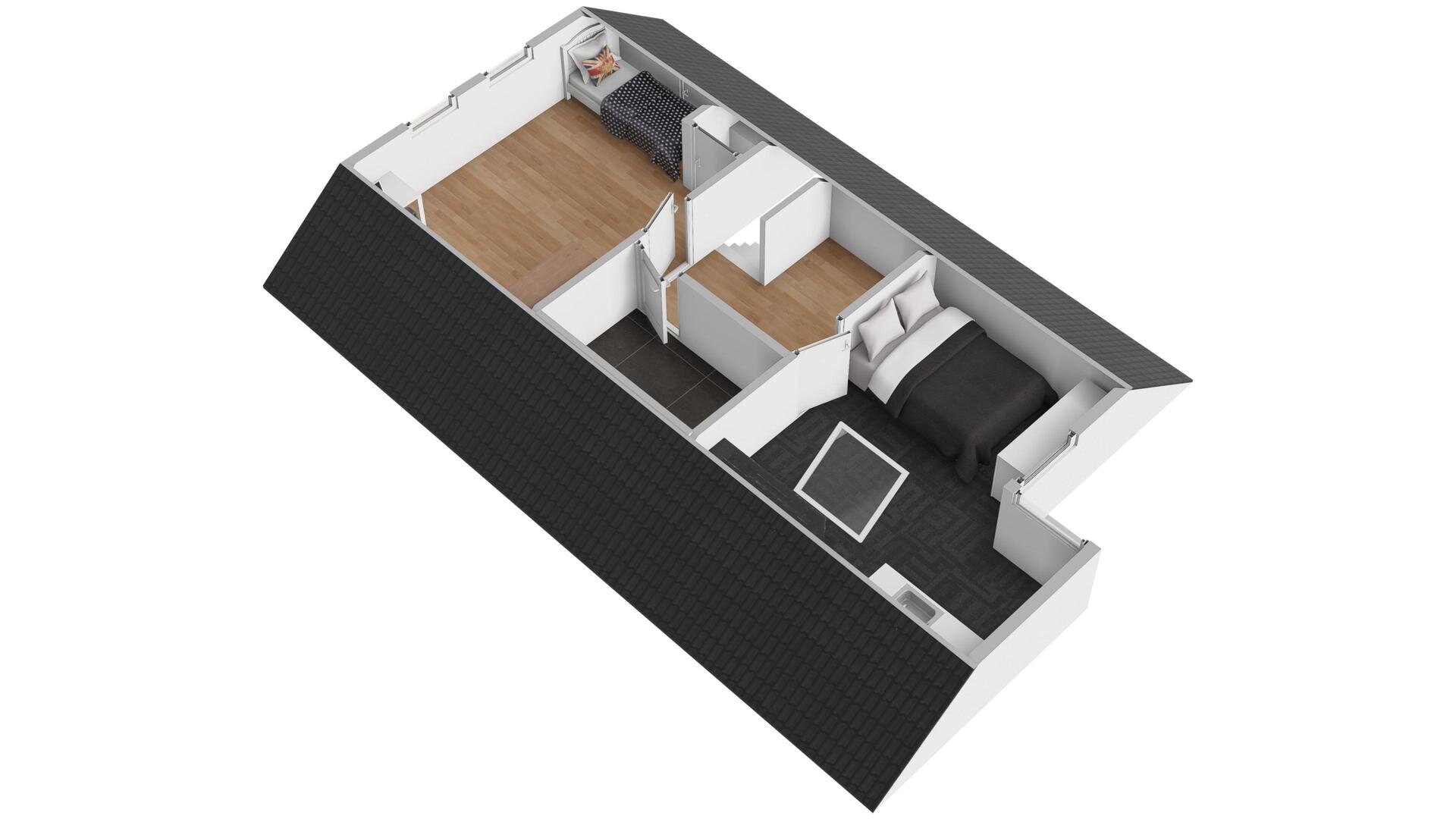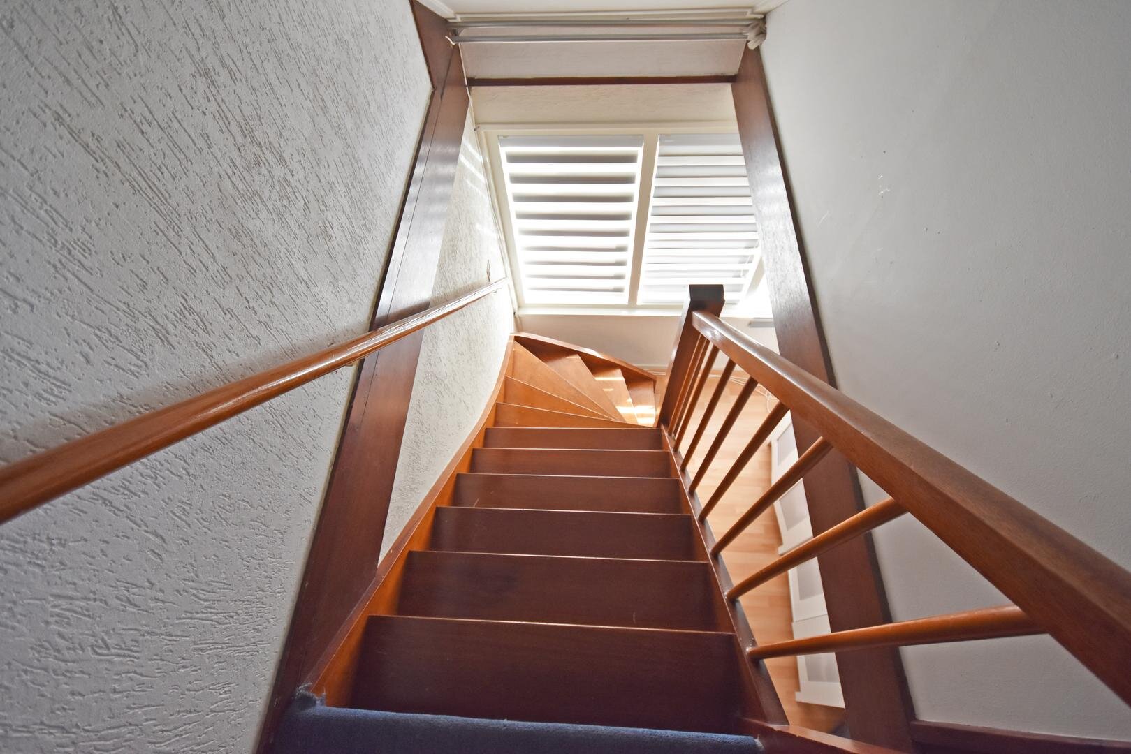 2e verdieping: hardhouten vaste trap naar overloop met bergruimte (eerder in gebruik als compacte 2e badkamer), 2 slaapkamers waarvan 1 met laminaatvloer en bergruimte.