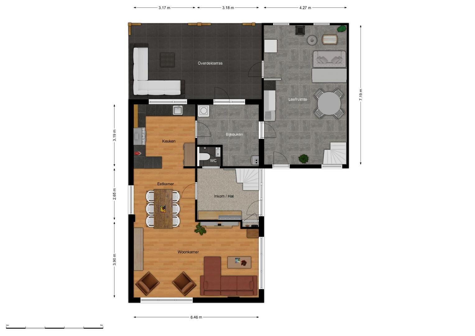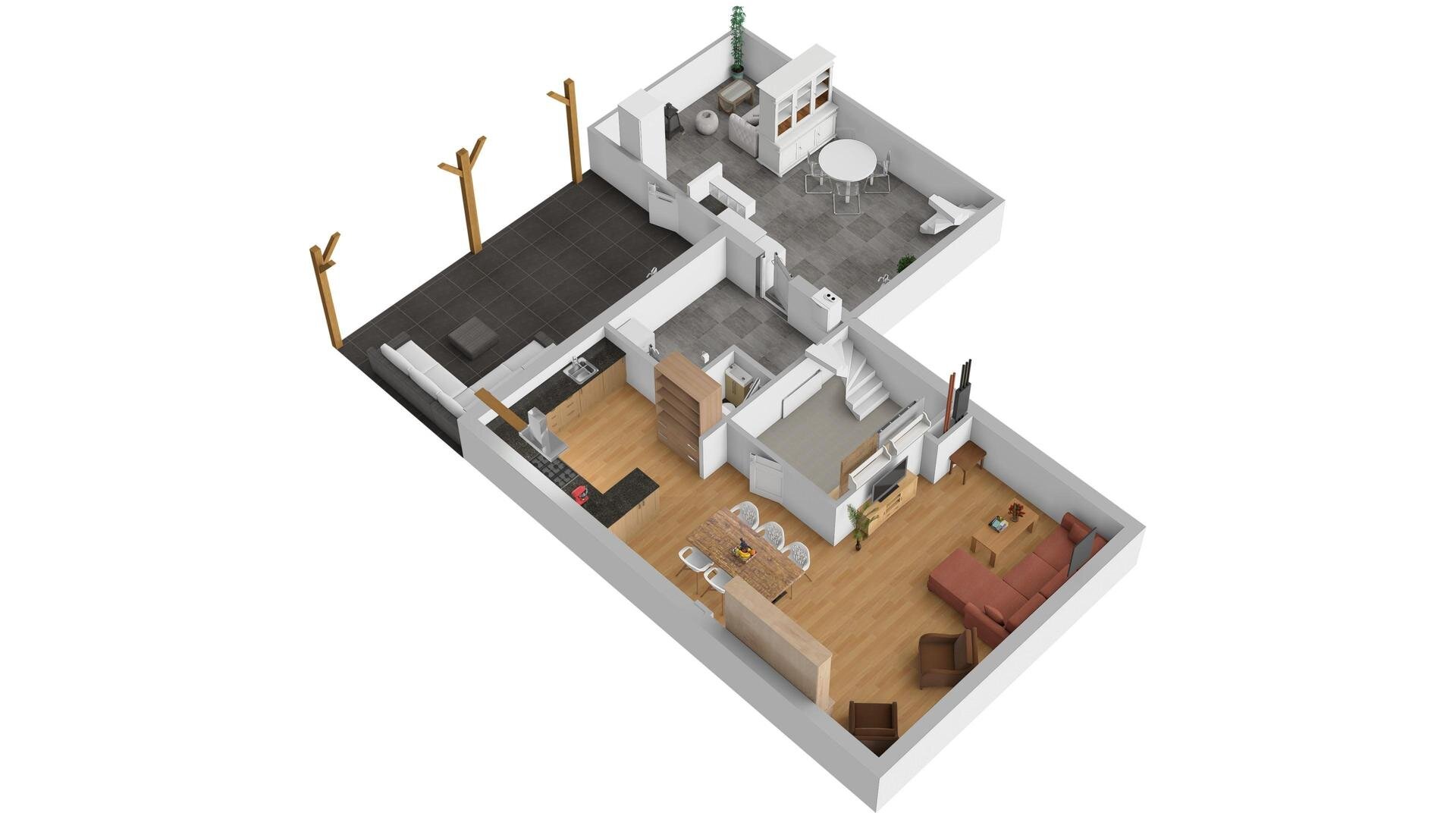 Begane grond: zij-entree, ruime hal met hardhouten trap naar verdieping, modern vrijdragend toilet met fonteintje, zonnige en sfeervolle woonkamer met duurzame PVC vloer (2023), open keuken met duurzame PVC vloer (2023) en luxe modern landelijk ‘handgemaakte’ opstelling (massief eikenhout, 2023) voorzien van diverse inbouwapparatuur en veel kastruimte, bijkeuken met witgoed-aansluitingen, tuindeur en doorgang naar separate sfeervolle woonstudio (voormalige garage) met eigen voor-entree, woonkamer met PVC vloer, pantry, c.v.- en bergruimte en smalle vaste trap naar slaapzolder (beperkte stahoogte) met PVC vloer en groot dakraam.
