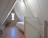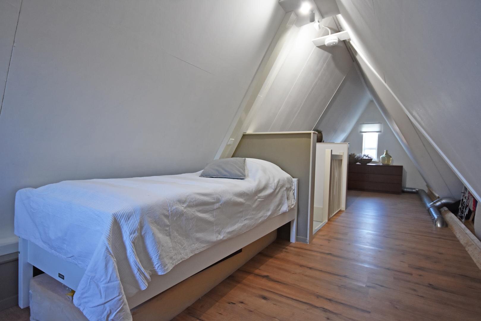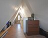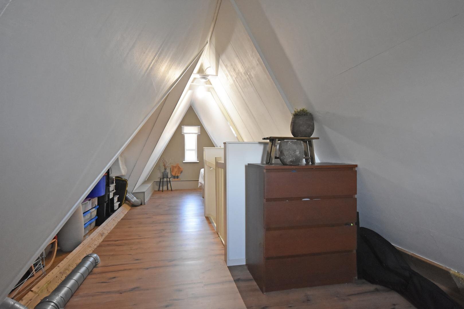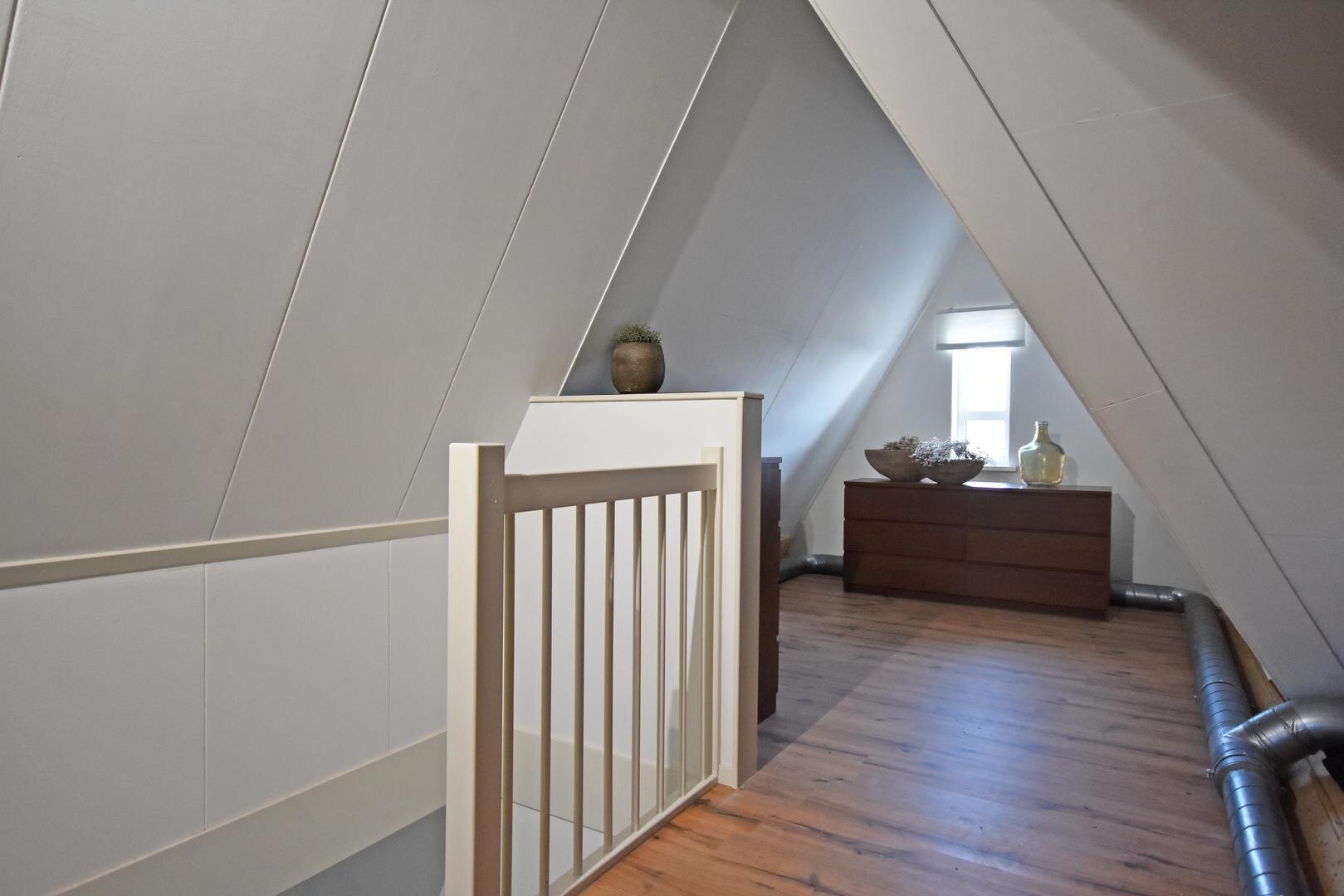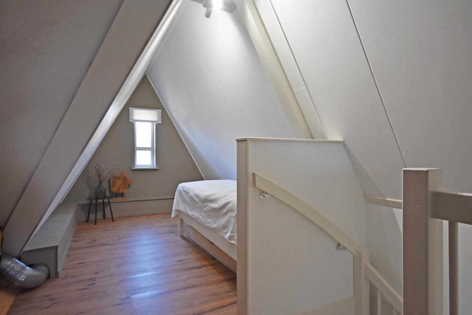 2e verdieping: vaste trap naar zolderkamer met laminaatvloer, berg- en technische ruimte.