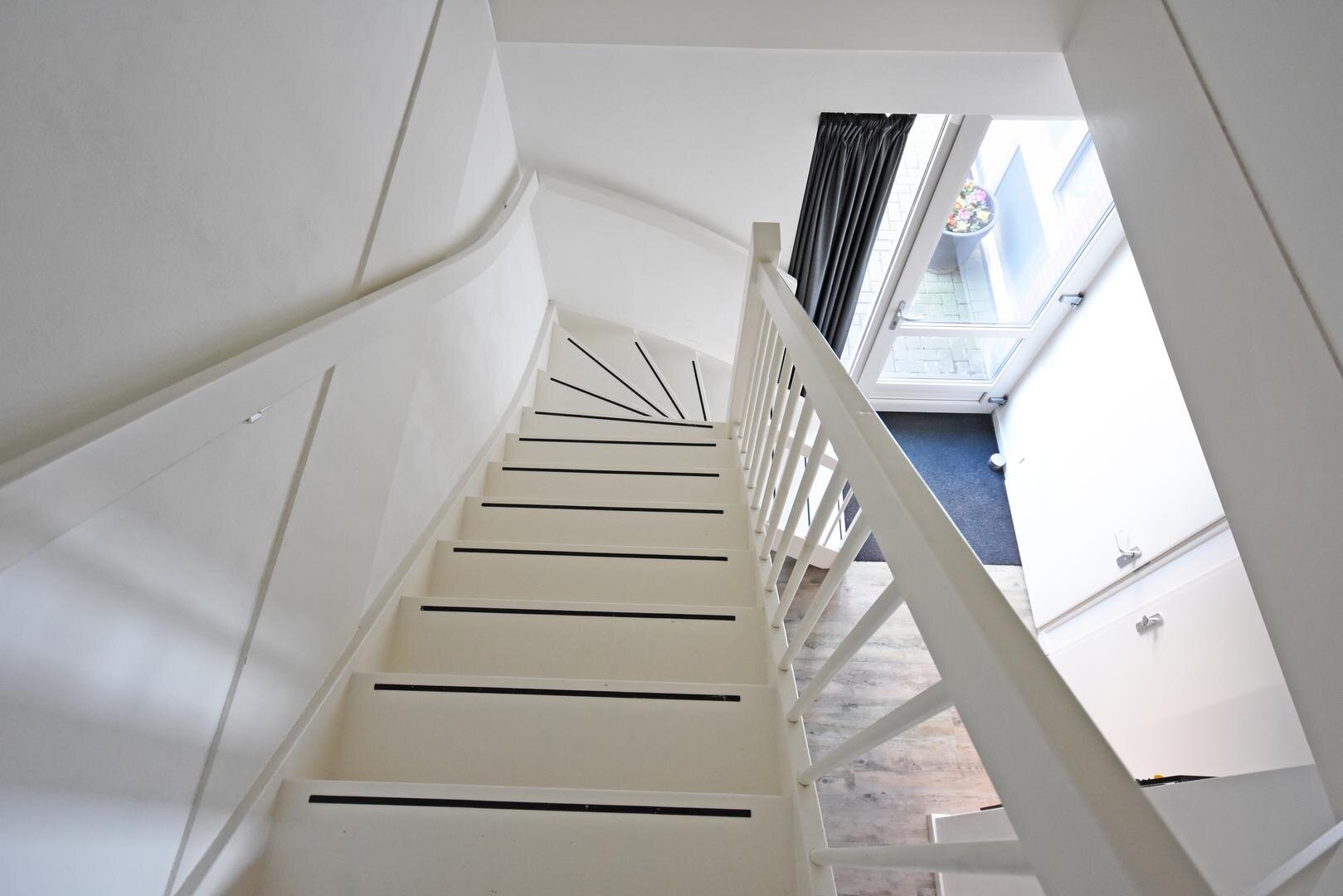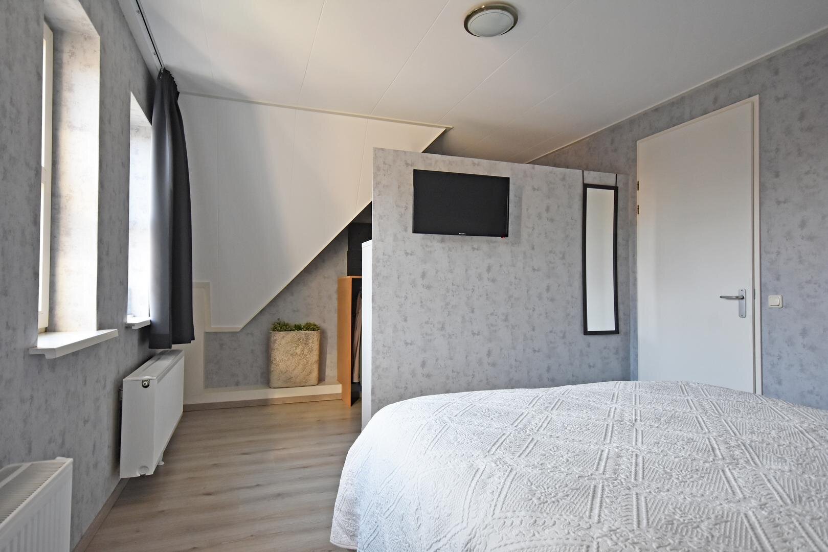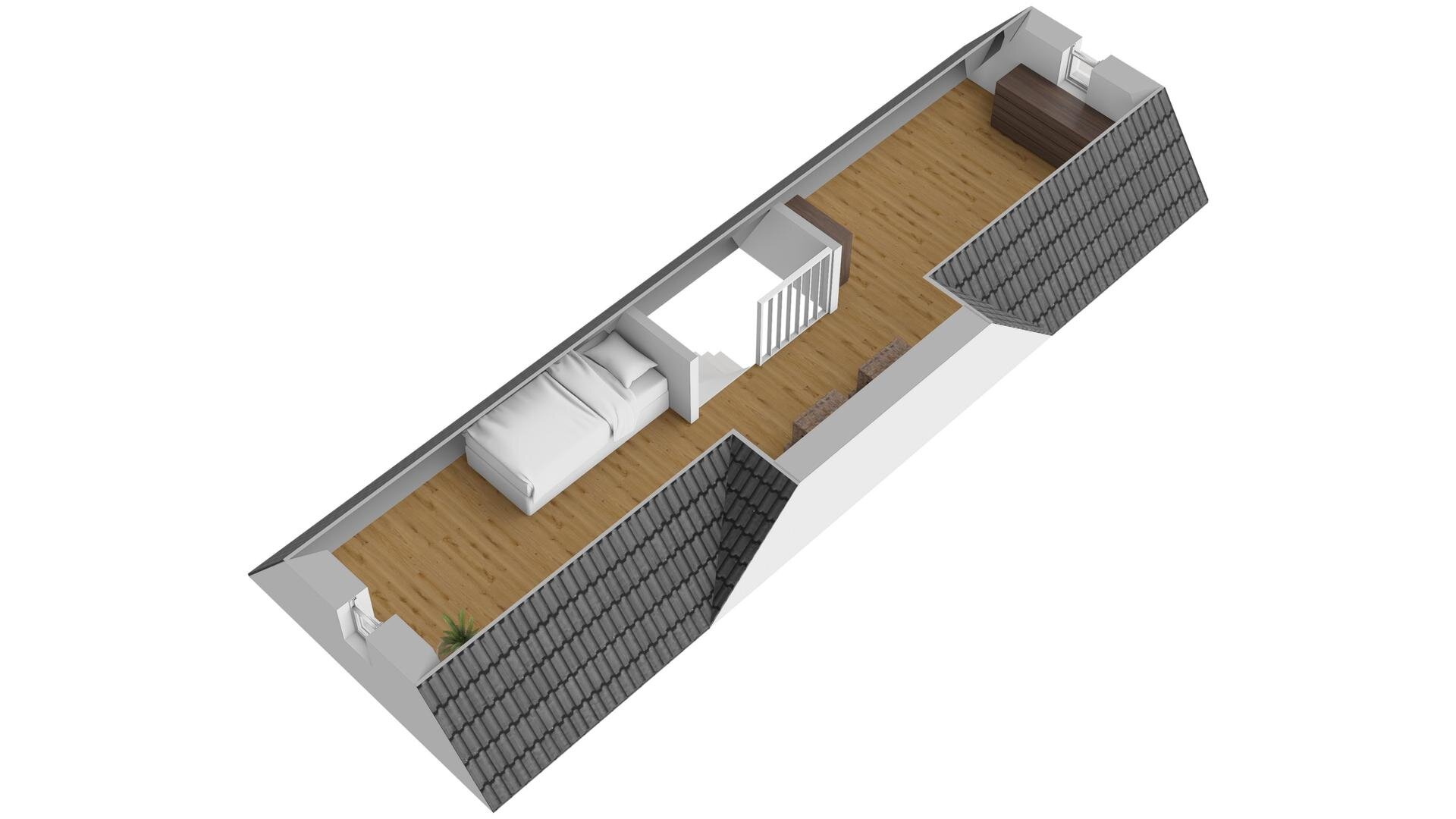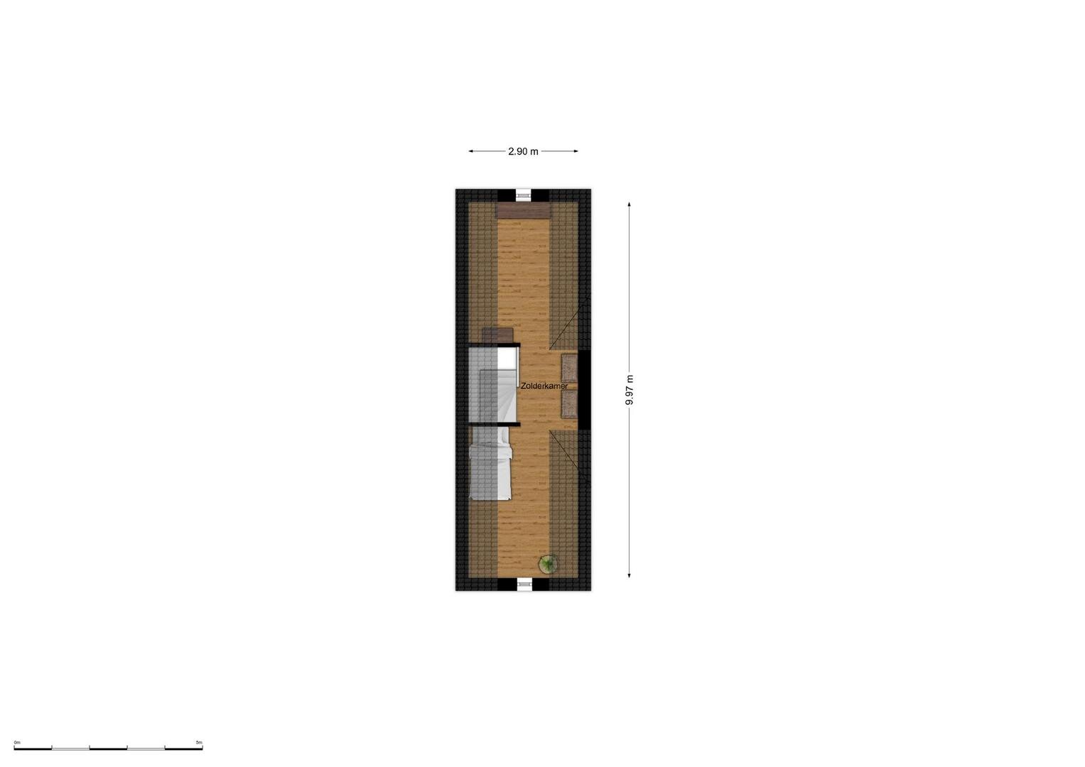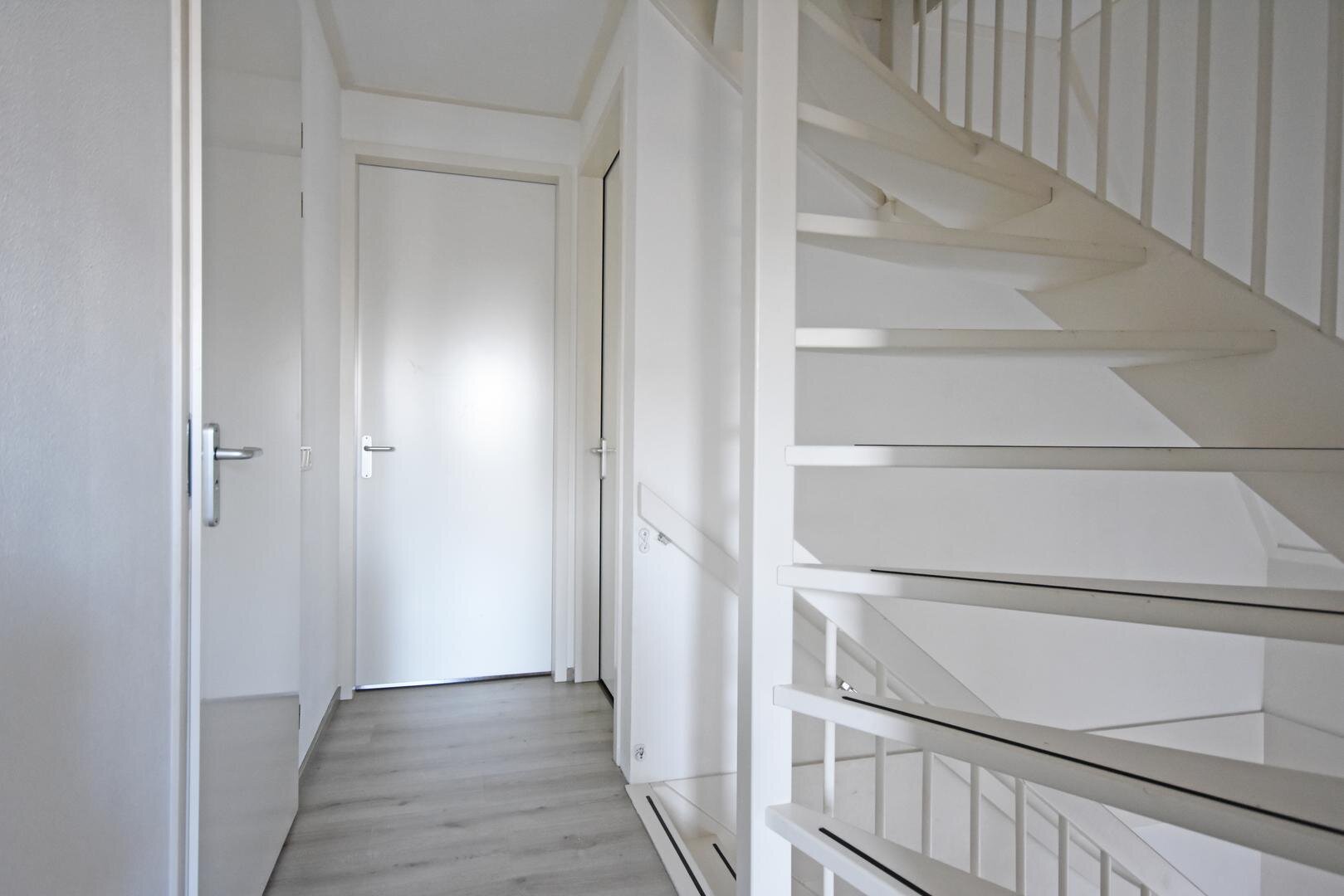 2e verdieping: vaste trap naar zolderkamer met laminaatvloer, berg- en technische ruimte.