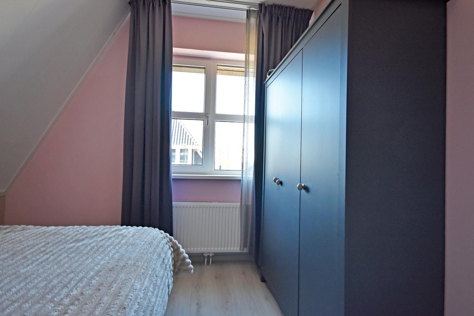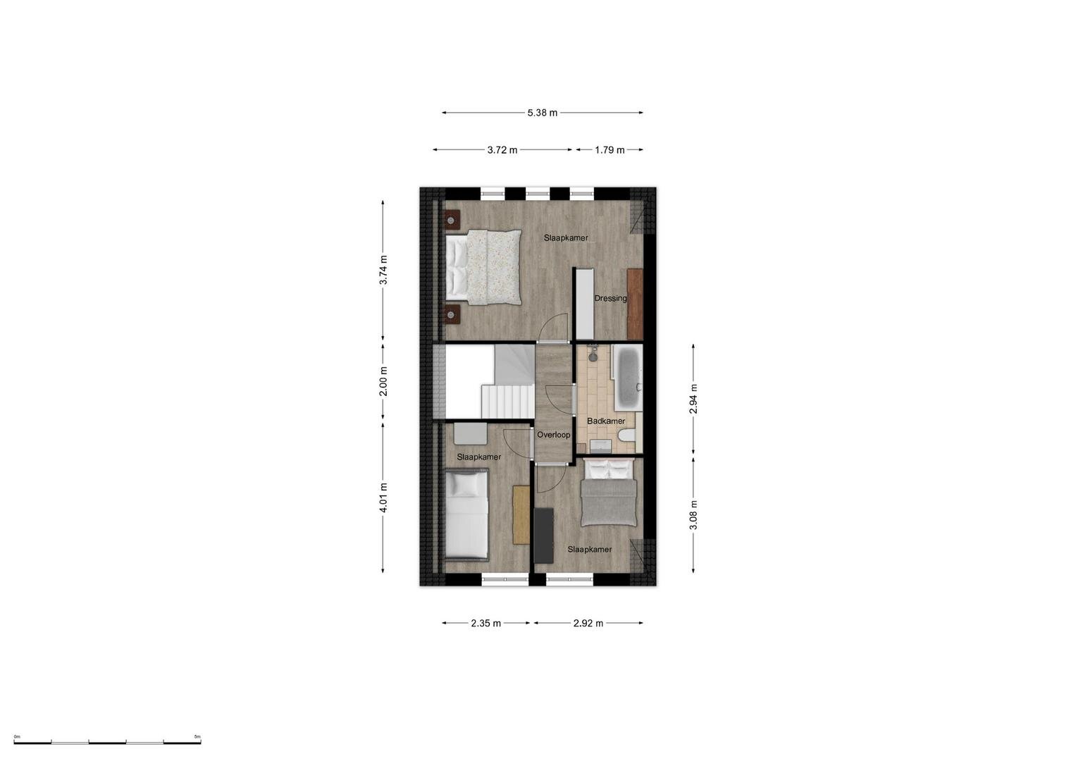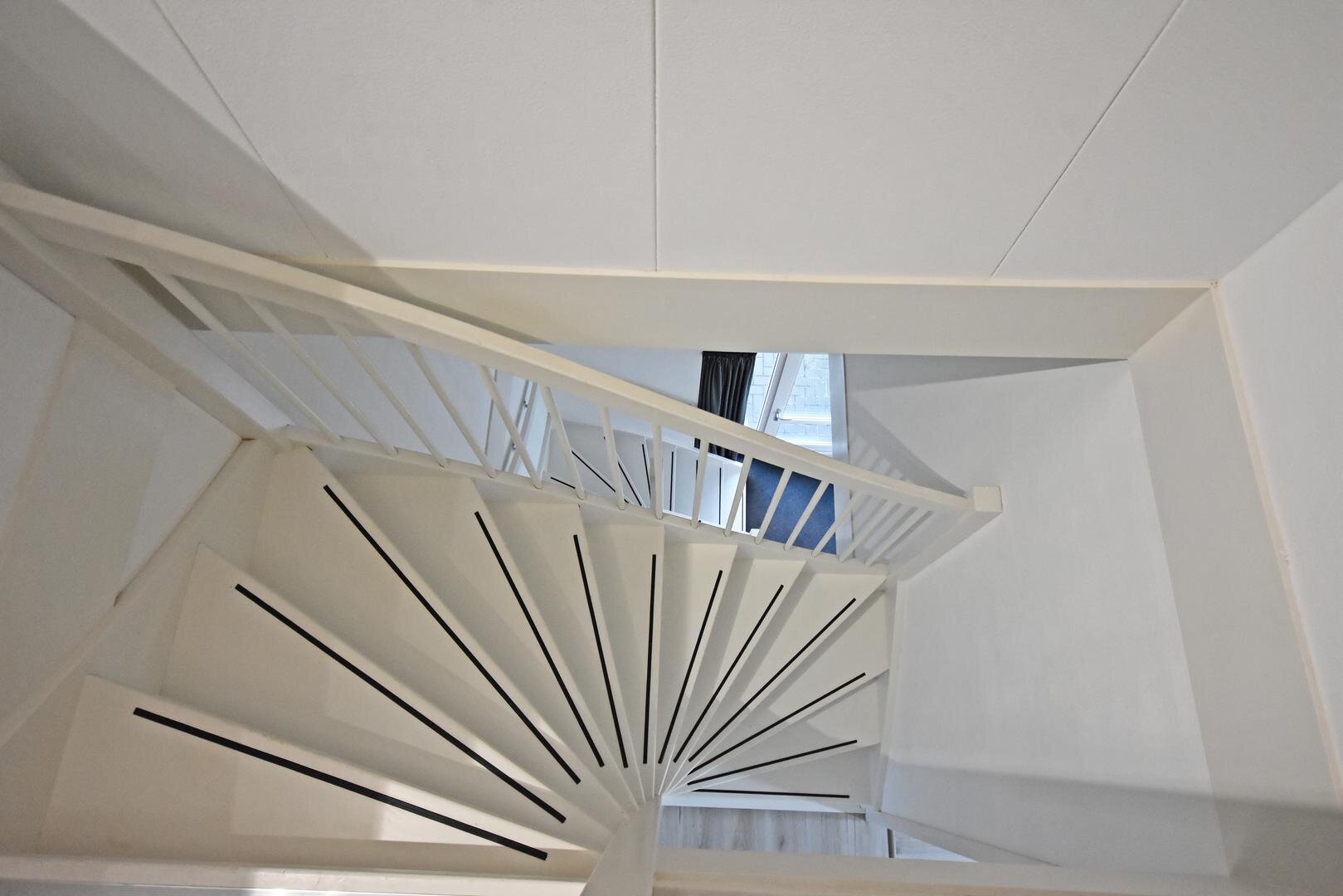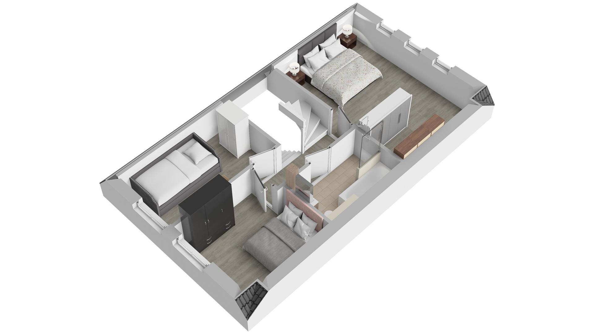 2e verdieping: vaste trap naar zolderkamer met laminaatvloer, berg- en technische ruimte.
