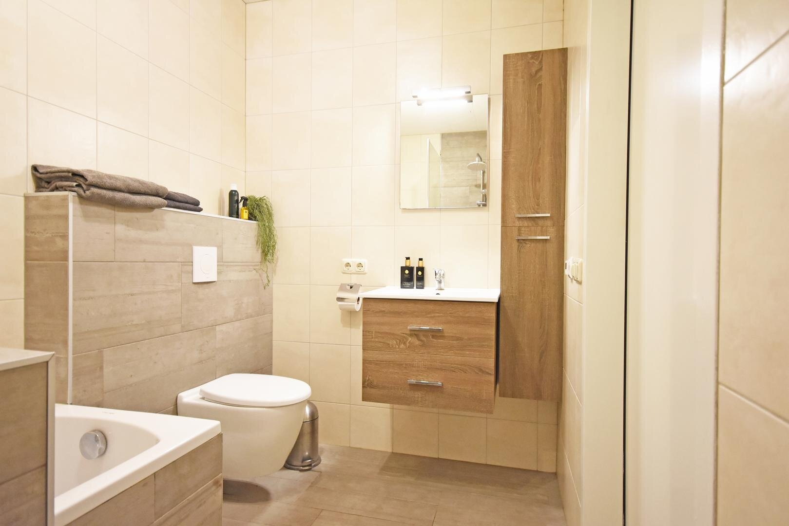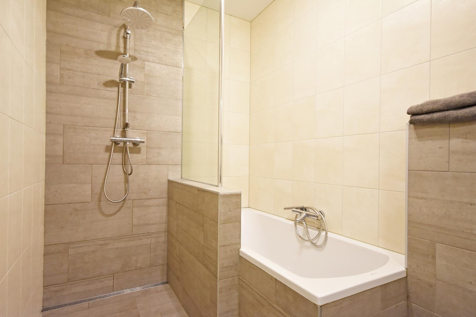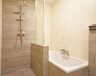 1e verdieping: overloop met laminaatvloer, 3 slaapkamers met laminaatvloer waarvan 1 met (halfopen) inloopkast, moderne en complete badkamer met inloopdouche, ligbad, vrijdragend toilet en wastafelmeubel.