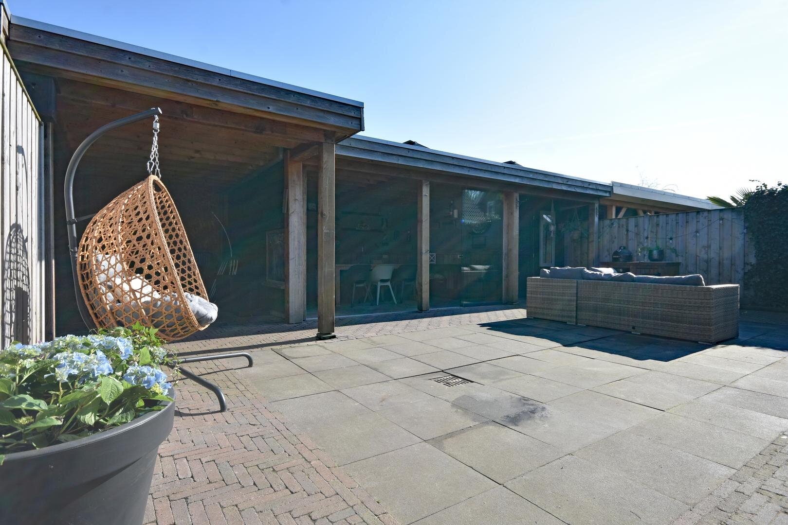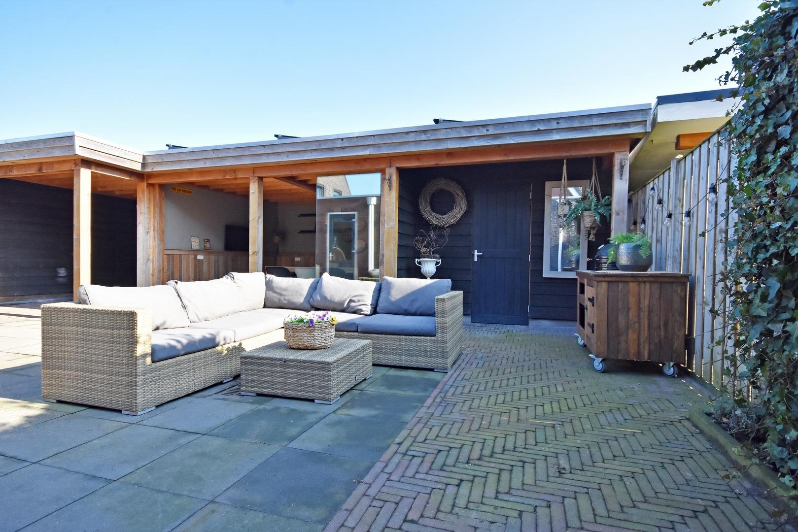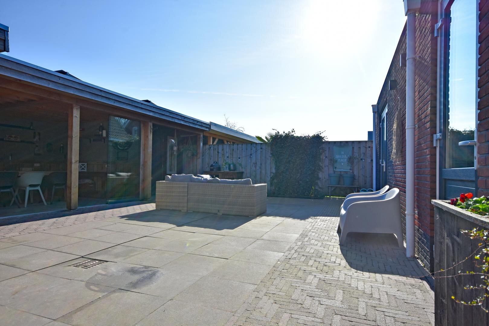 De zonnige, onderhoudsarme en afsluitbare achtertuin vormt een heerlijke plek om te ontspannen. Hier vindt u een ruim zonneterras, een praktische overkapping, een bergschuur en een sfeervolle tuinkamer/veranda waar u het hele jaar door van het buitenleven kunt genieten.