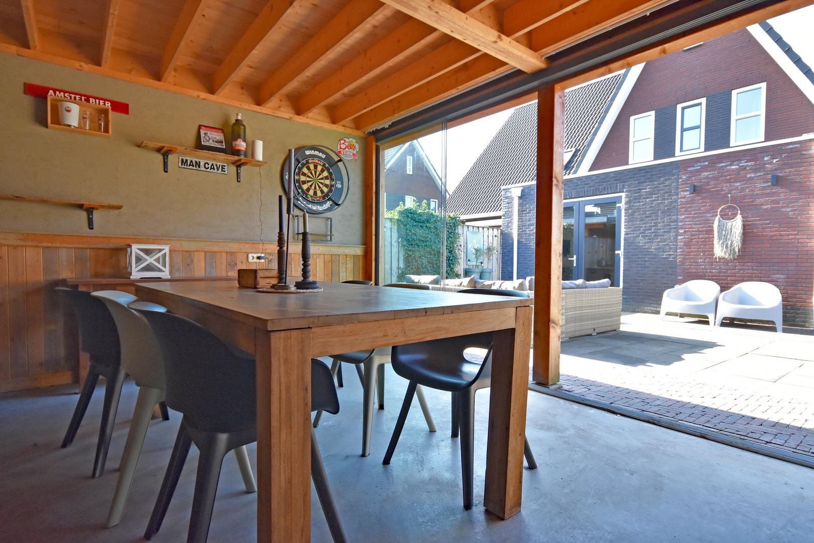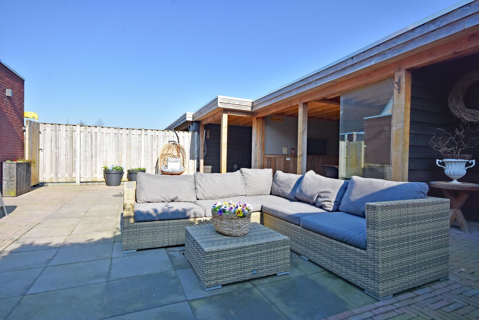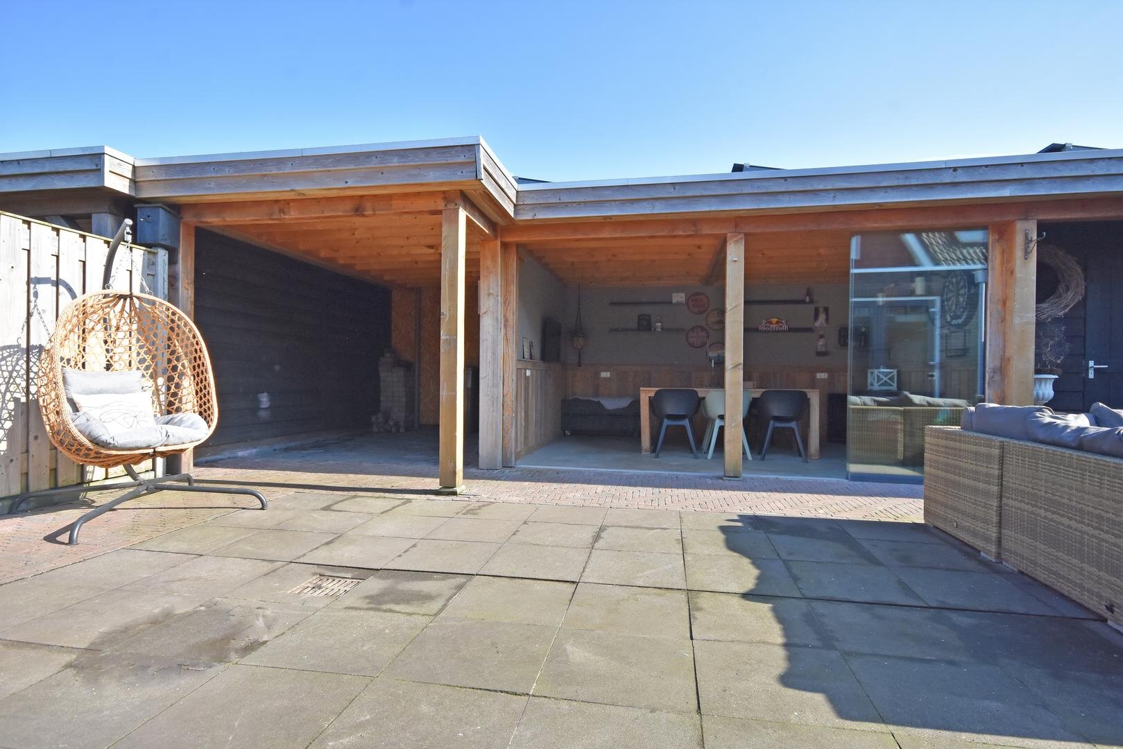De zonnige, onderhoudsarme en afsluitbare achtertuin vormt een heerlijke plek om te ontspannen. Hier vindt u een ruim zonneterras, een praktische overkapping, een bergschuur en een sfeervolle tuinkamer/veranda waar u het hele jaar door van het buitenleven kunt genieten.