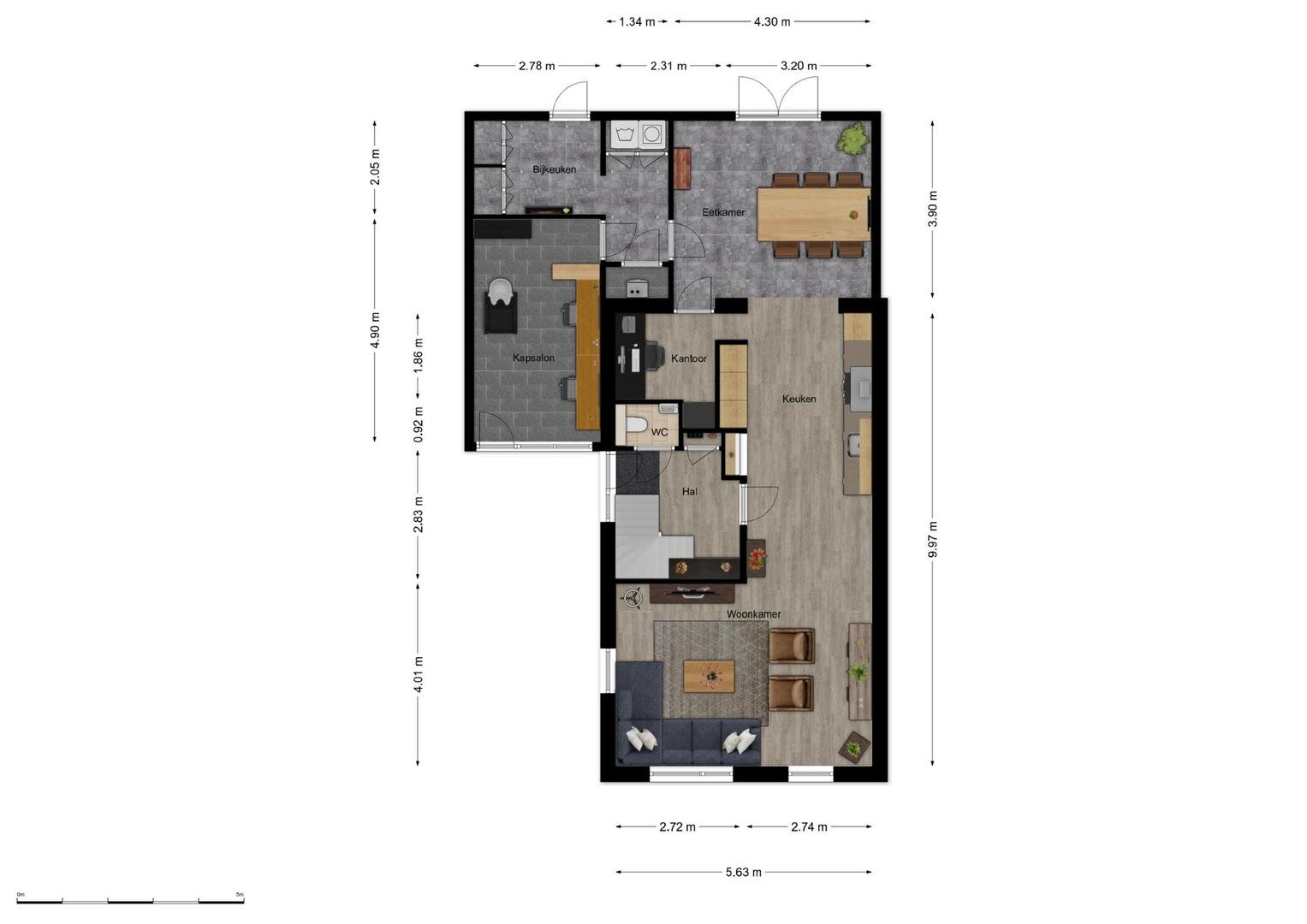 De aangebouwde praktijkruimte met eigen entree is momenteel in gebruik als kapsalon, maar biedt tal van mogelijkheden. Denk bijvoorbeeld aan een kantoor aan huis, hobbyruimte of een slaapkamer met compacte badkamer, waardoor de woning ook levensloopbestendig kan worden ingericht.