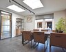 Begane grond: zij-entree, ruime hal, vrijdragend toilet met fonteintje, L-vormige woonkamer, open keuken met moderne speelse opstelling voorzien van diverse inbouwapparatuur, veel kastruimte en gezellige ‘koffie nis’, werk/speelhoek, ruime aangebouwde eetkamer met tuindeuren, ruime bijkeuken met technische ruimte/kast, vaste kastenwand met witgoed-aansluitingen, achter-entree en doorgang naar praktijkruimte (ook geschikt als bijv. kantoor of slaapkamer) met eigen entree.