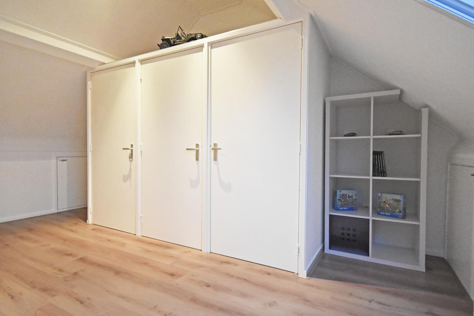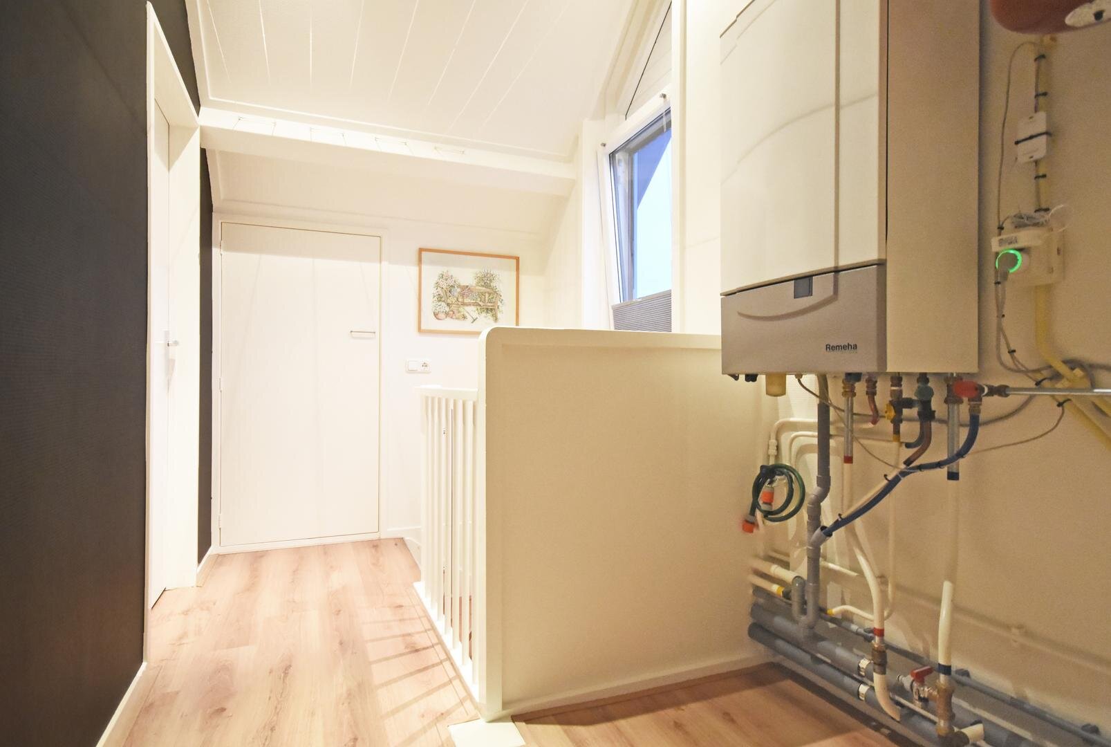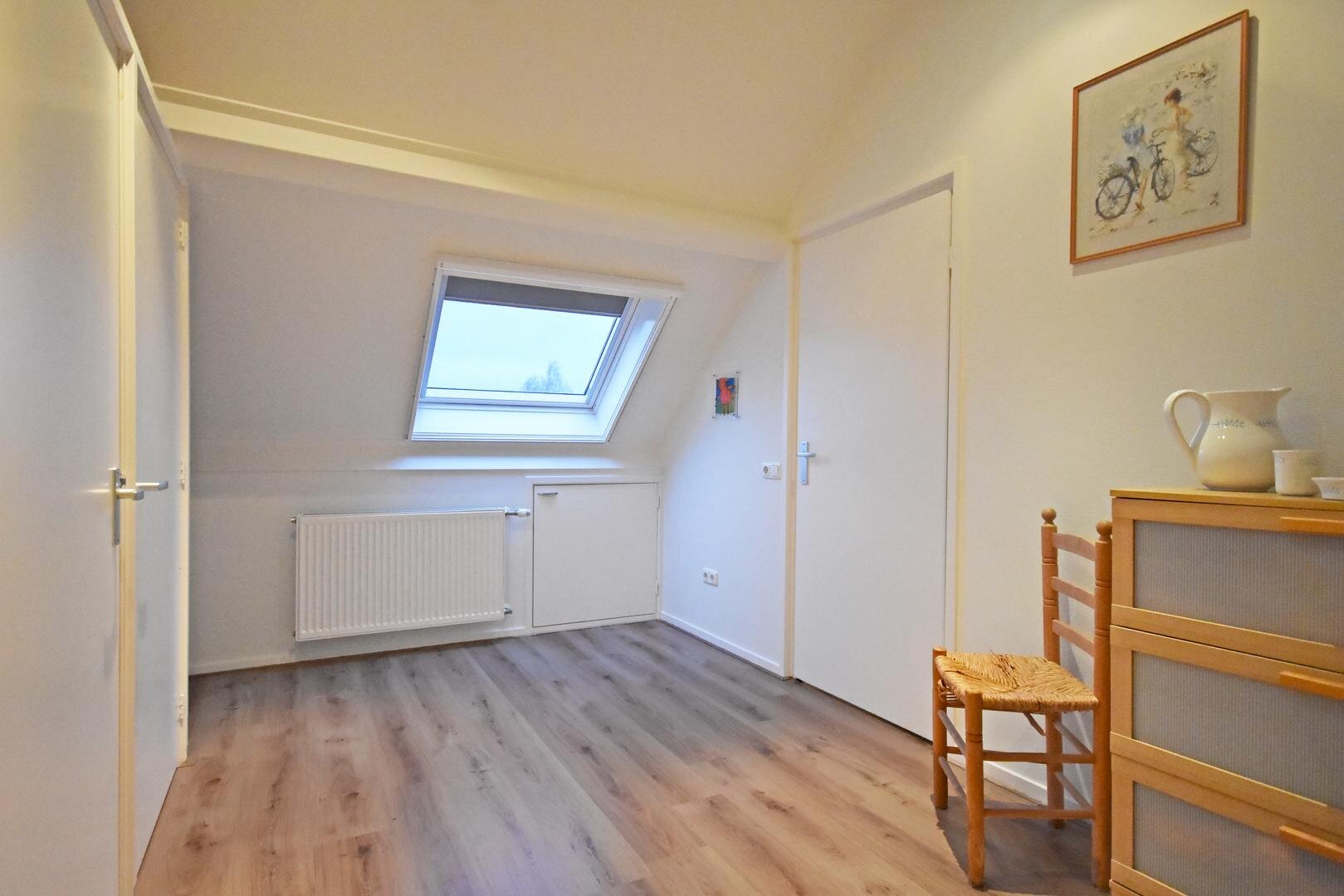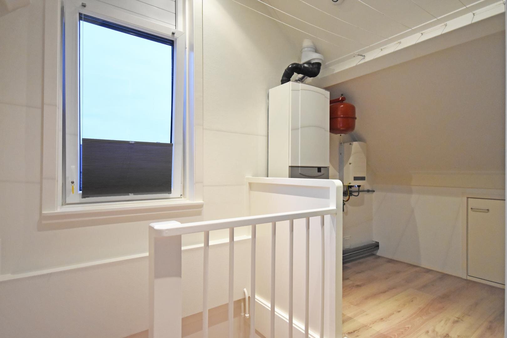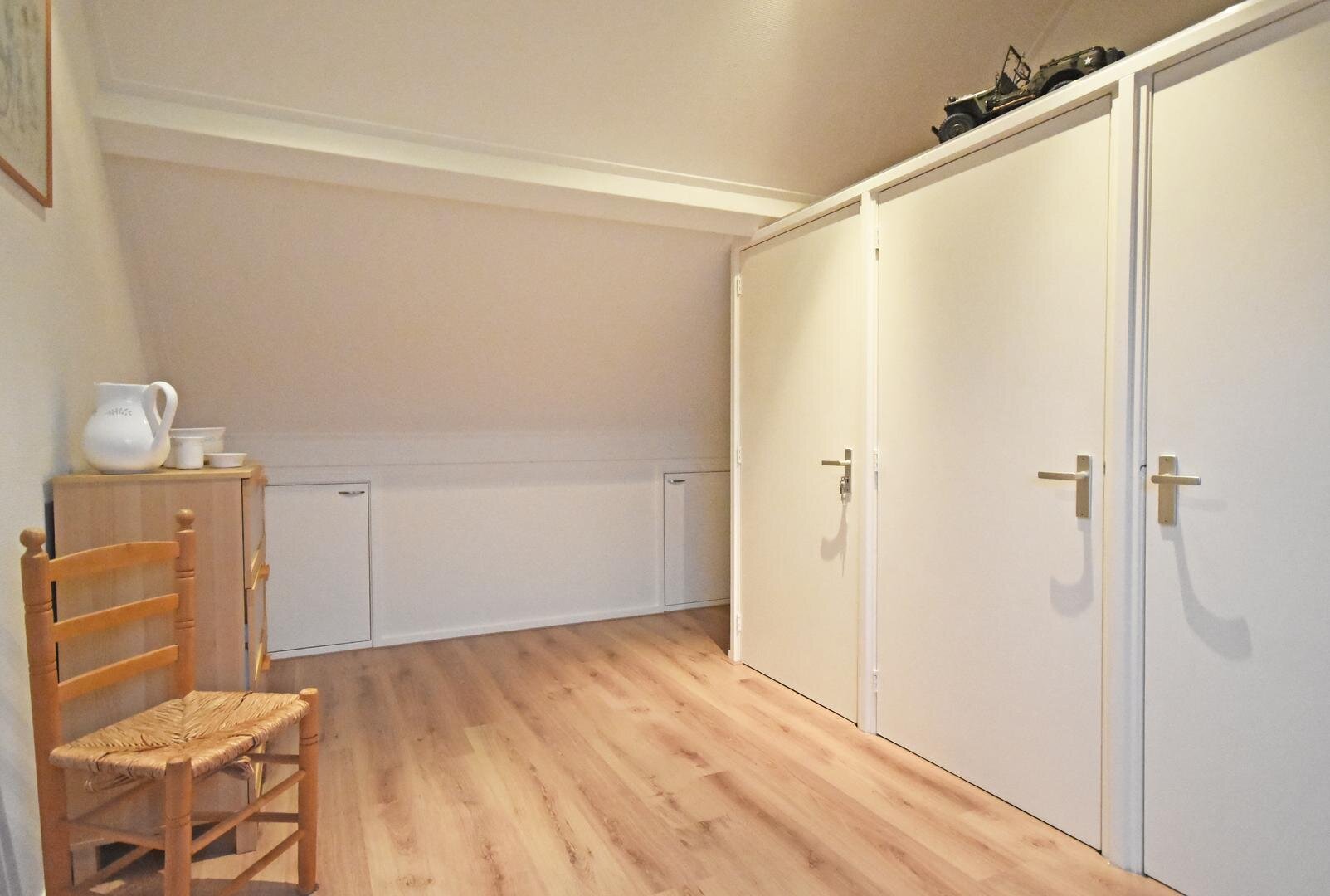 2e verdieping: vaste trap naar overloop met laminaatvloer en c.v.- en bergruimtes, ruime 4e slaapkamer met laminaatvloer, groot vernieuwd dakraam, vaste kasten en bergruimtes.