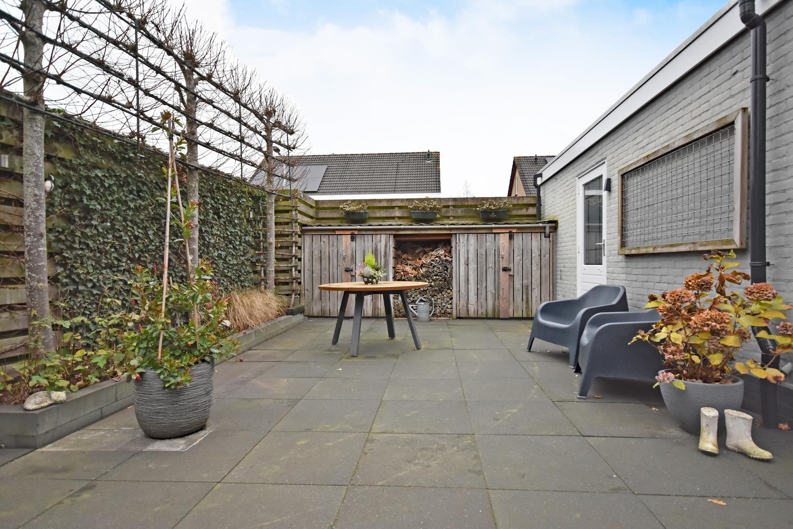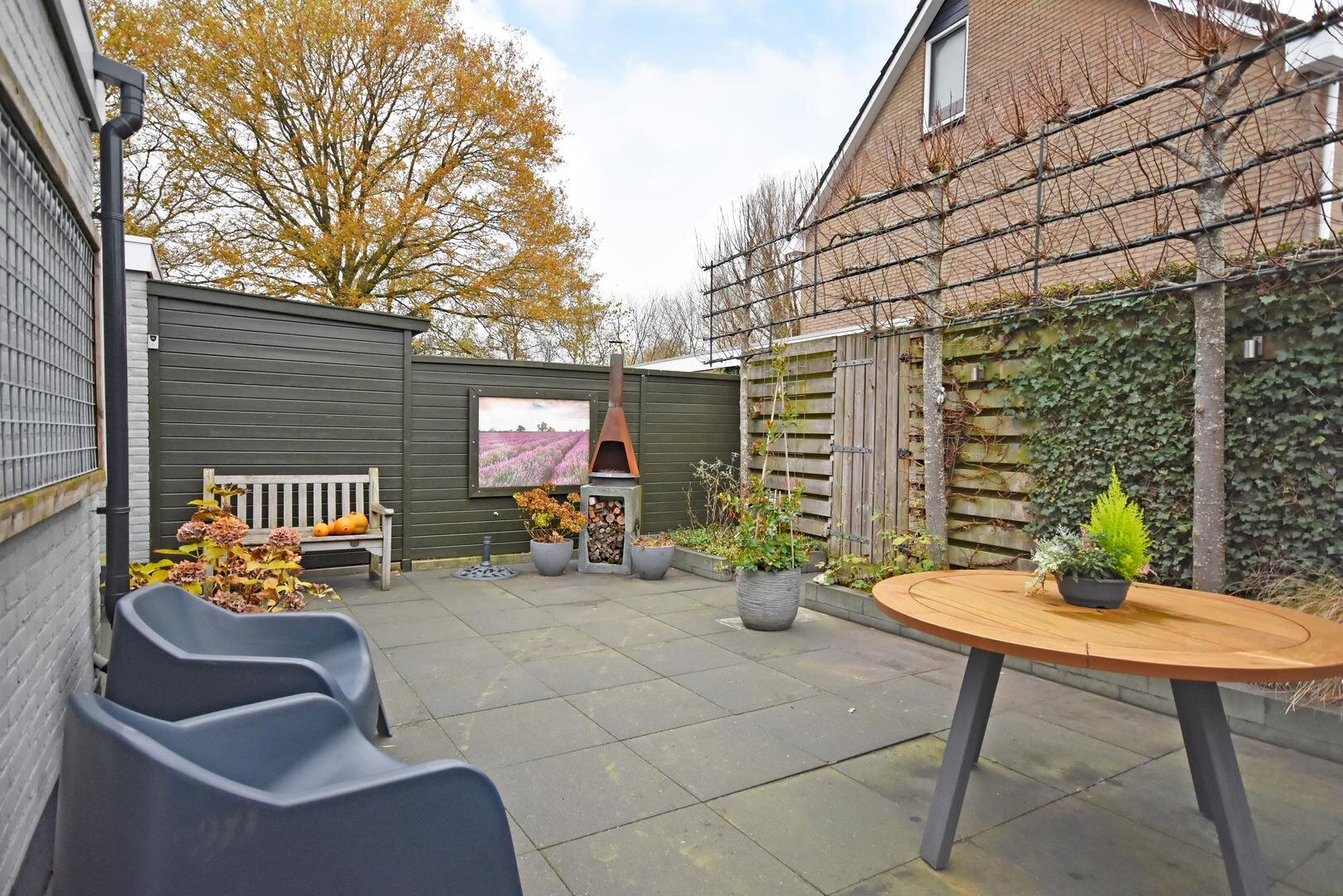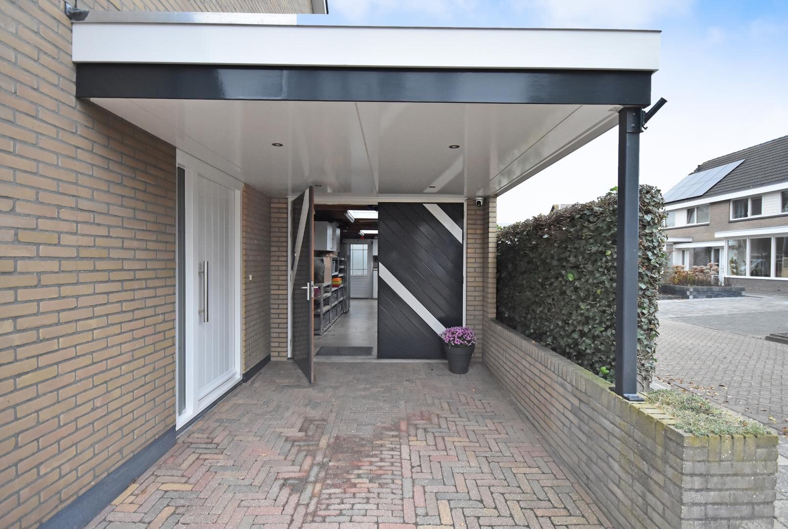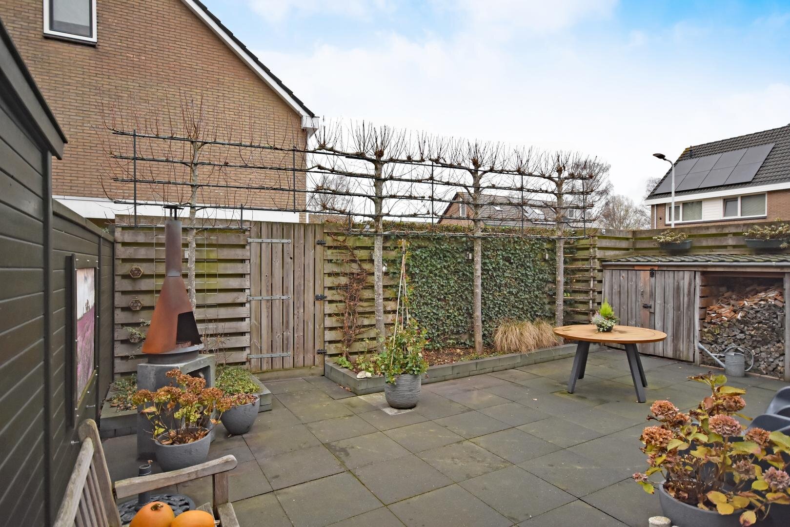 De onderhoudsarme tuin biedt een groot zonneterras, bergruimte en een afsluitbare achterom. Op de oprit, onder de carport en in de verlengde garage is ruime parkeergelegenheid voor meerdere auto's. De kavel meet 223 m² (incl. achterom/steeg) eigen grond.
