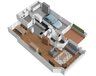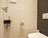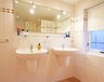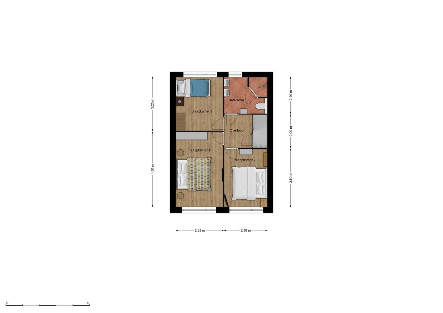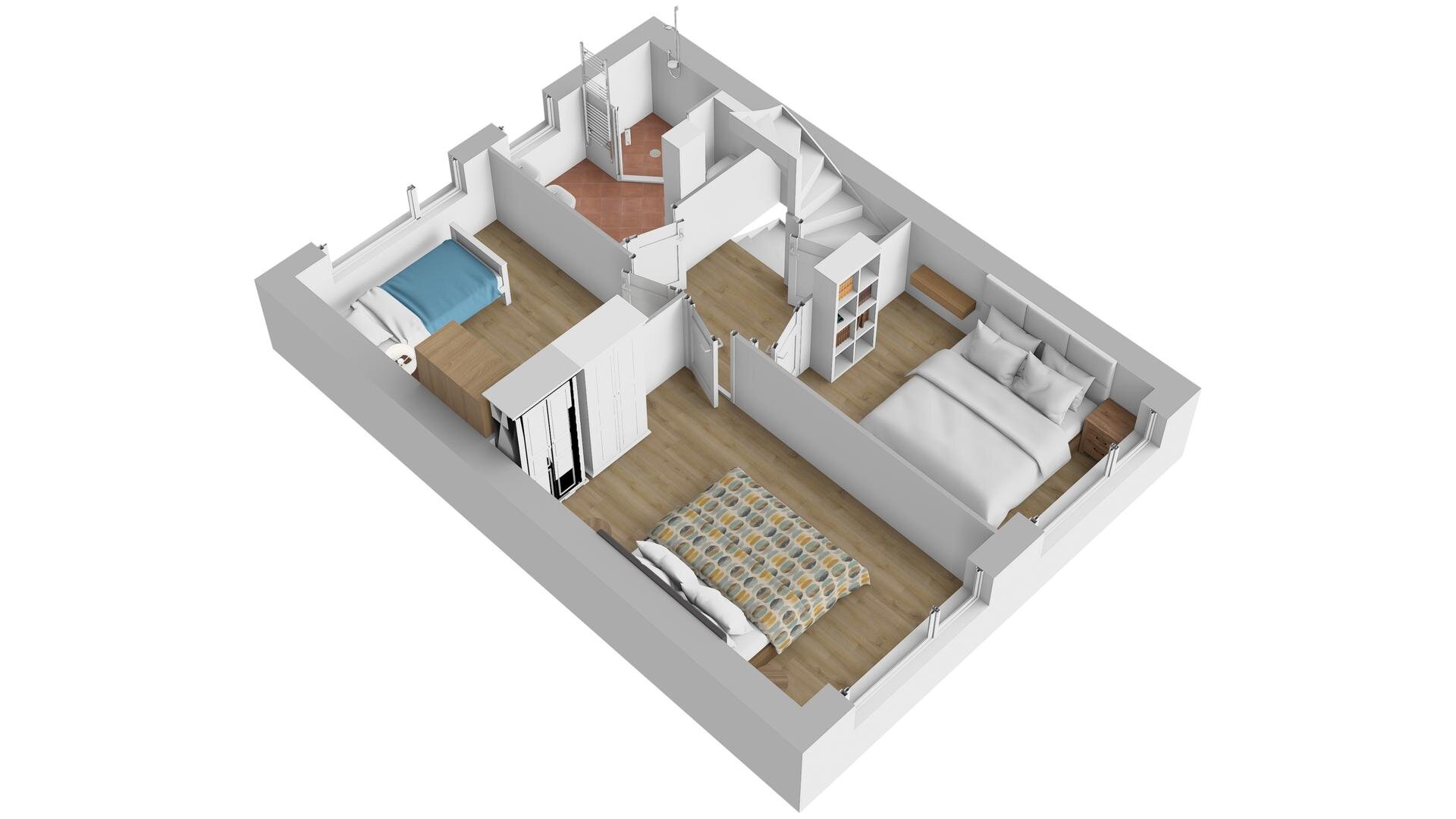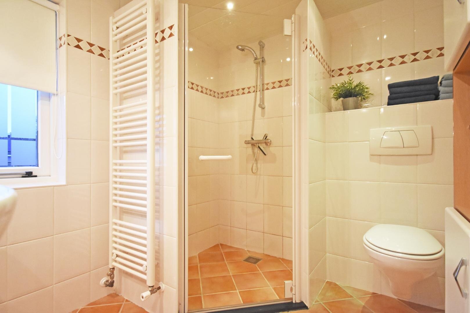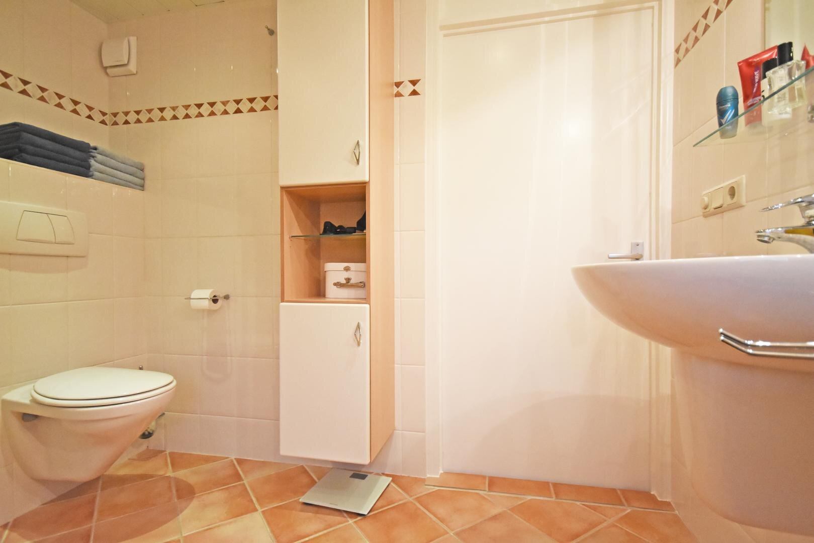 1e verdieping: overloop met PVC vloer, 3 slaapkamers met laminaatvloer waarvan 1 met vaste kasten, nette gemoderniseerde badkamer met douche, vrijdragend 2e toilet en dubbele wastafel.