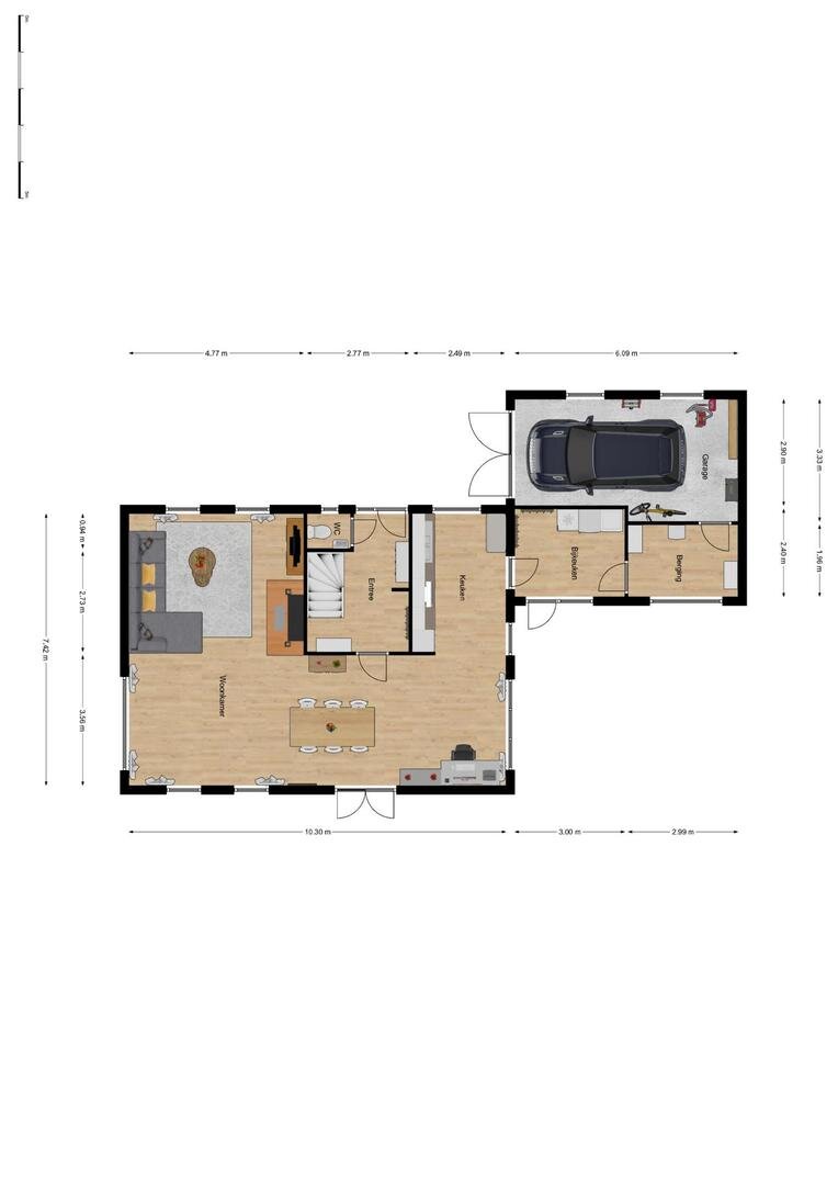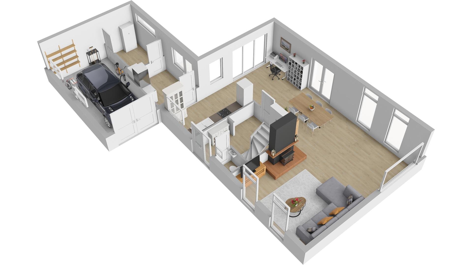 Begane grond: zij-entree, hal, toilet met fonteintje, ruime, strakke en zonnige L-vormige woonkamer met houtkachel, tuindeuren en open keuken met moderne lichte opstelling v.v. diverse inbouwapparatuur, uitpandige bijkeuken met witgoed-aansluitingen, tuindeur en doorgang naar ruime garage met luxe brede houten deuren.