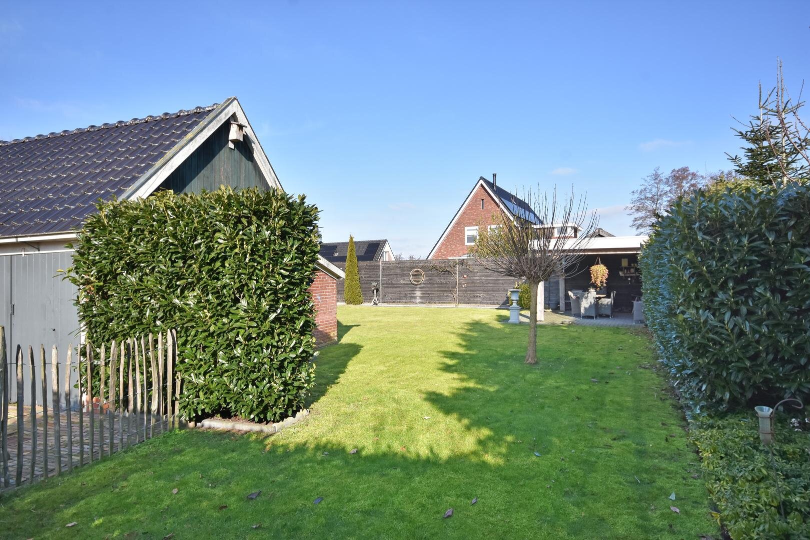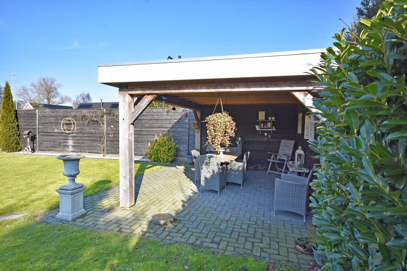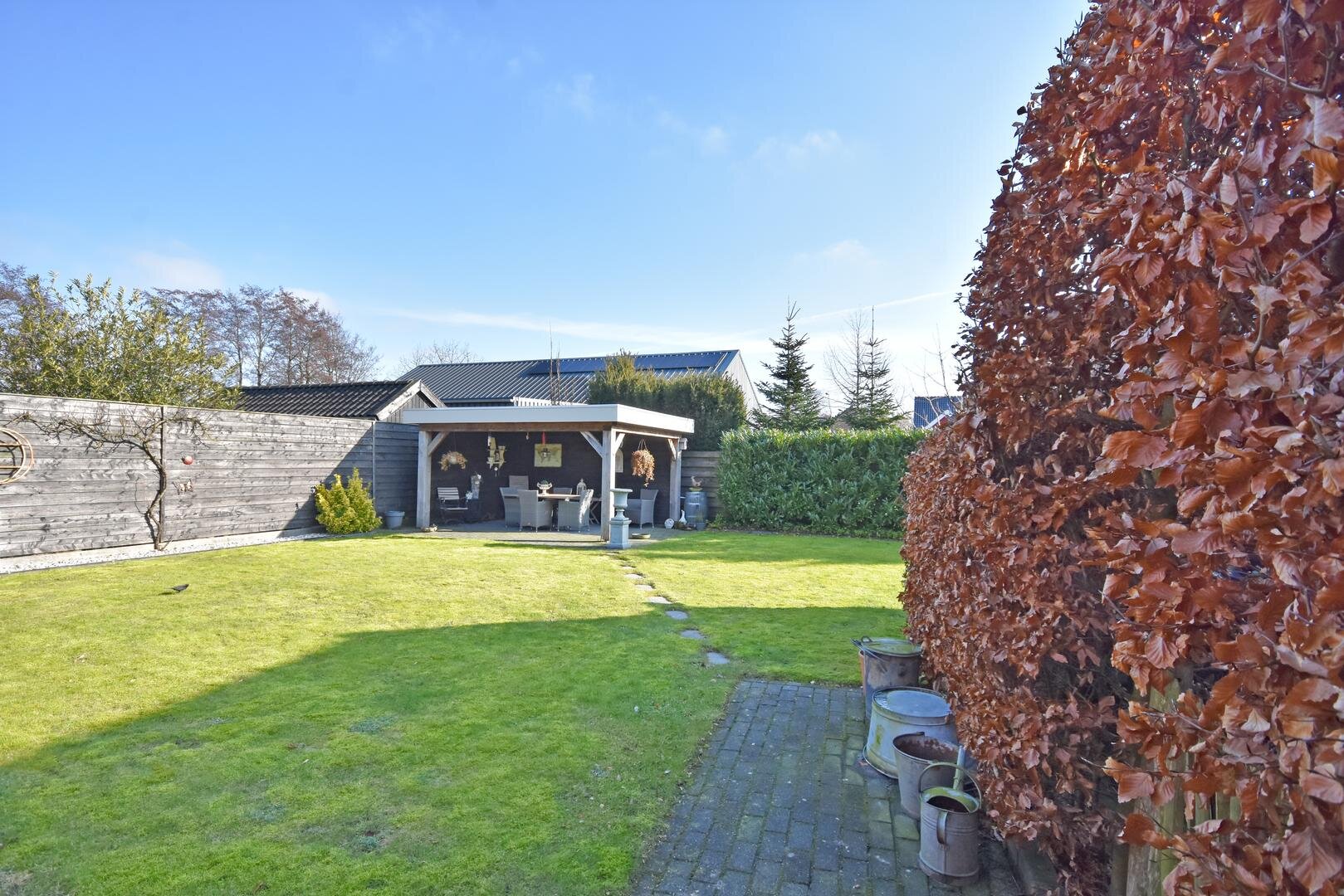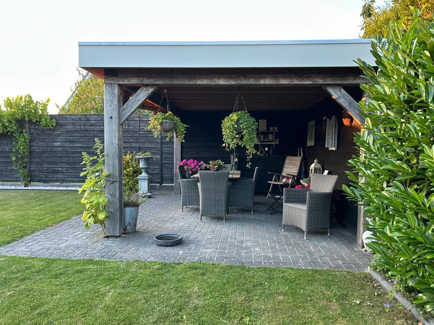 Aan de achterzijde ligt een royale, privacy volle en zonnige tuin met o.a. een groot terras, een sfeervolle overkapping en een fraai groen gazon. Ook bevindt zich hier een stenen garage met berging. De brede oprit biedt ruim voldoende parkeergelegenheid op eigen terrein. Het geheel staat op een ruime kavel van 780 m² eigen grond, waardoor je volop geniet van ruimte rondom de woning.