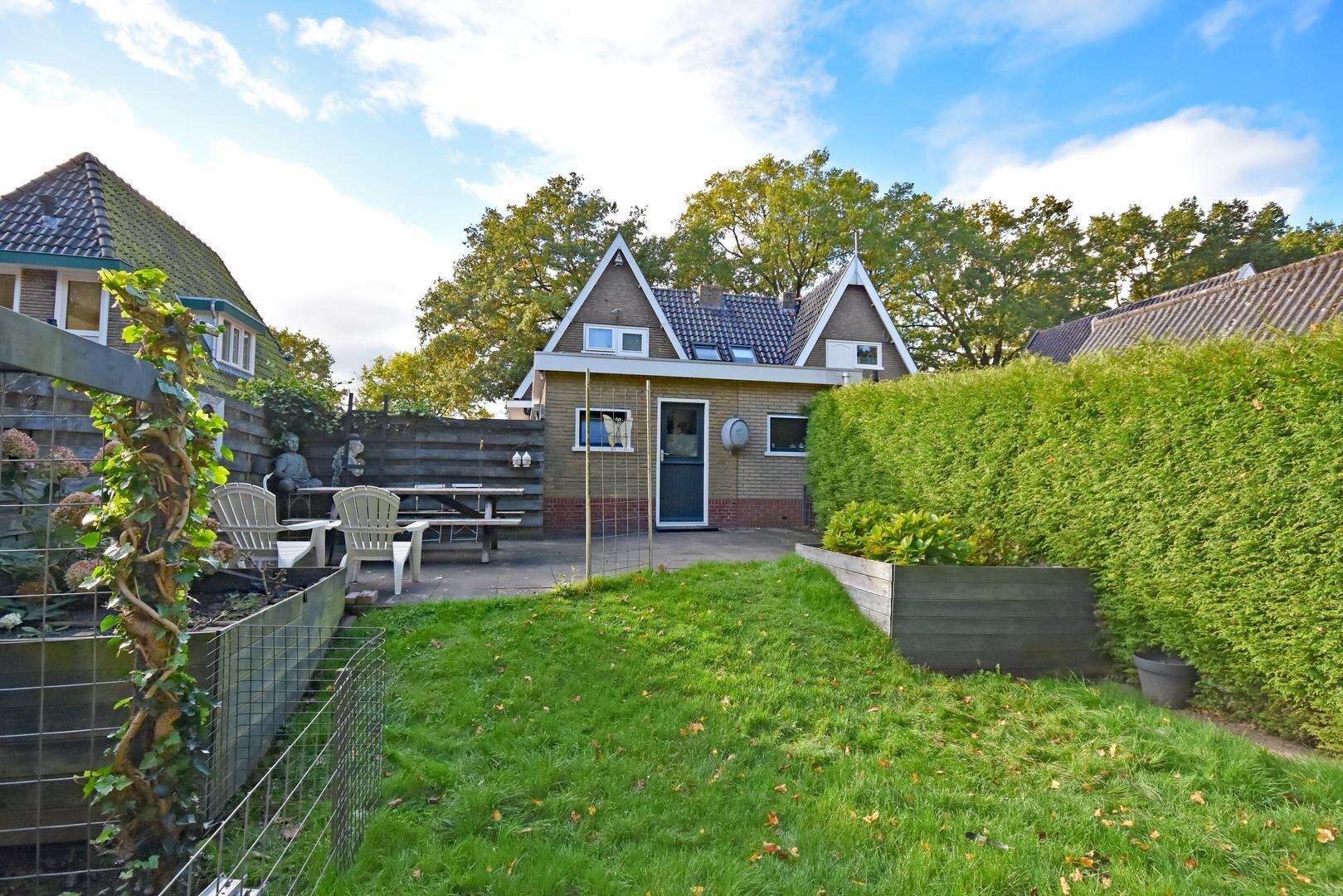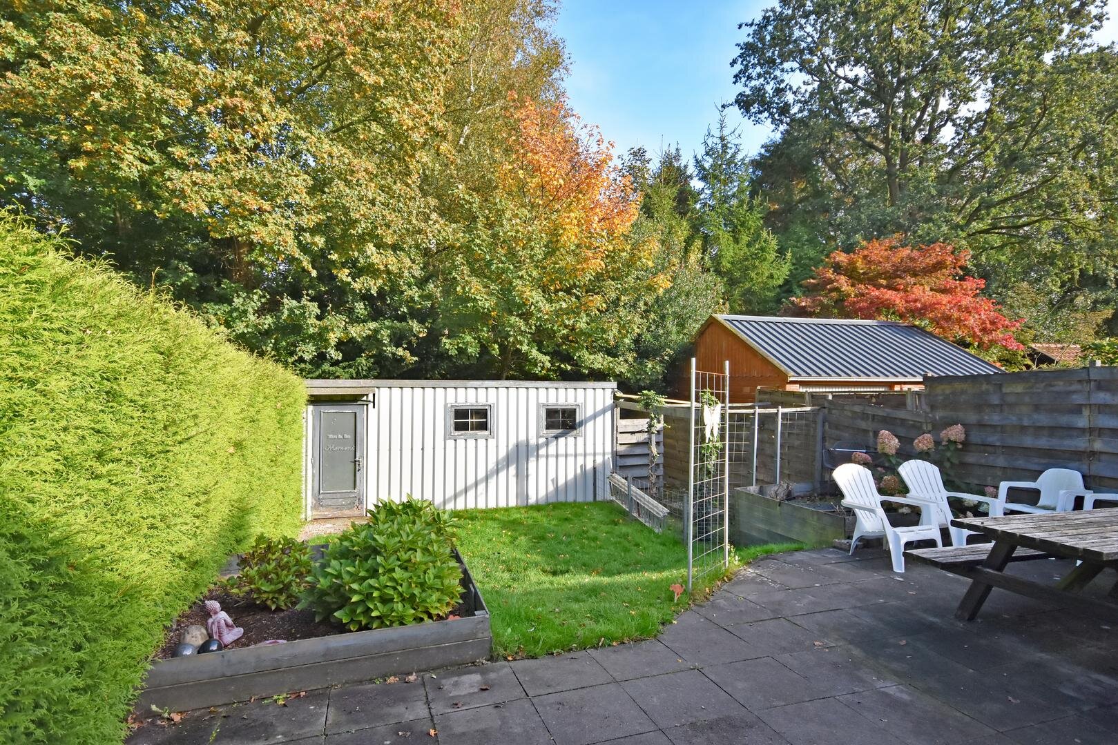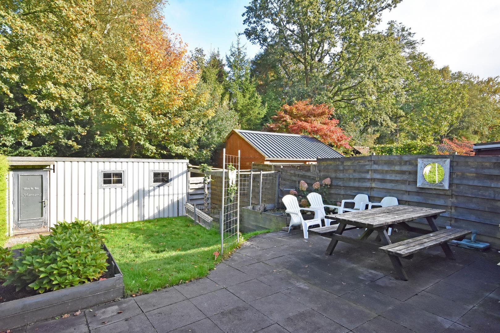 Aan de achterzijde bevindt zich een zonnige, diepe tuin van ca. 16 meter met een groot zonneterras, speel-/grasveld en een ruime (verouderde) schuur/berging. Hier geniet je de hele dag van rust en zon!