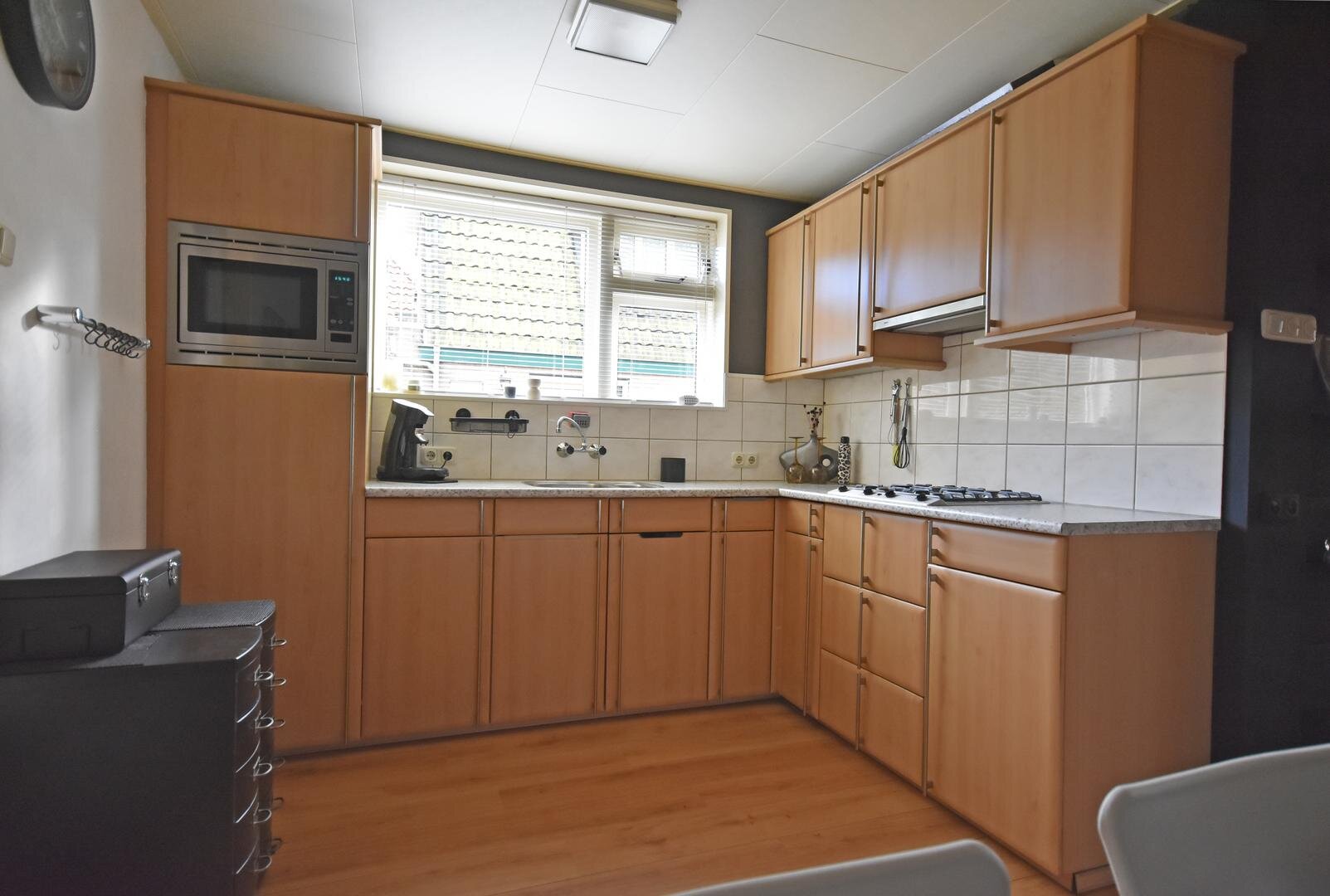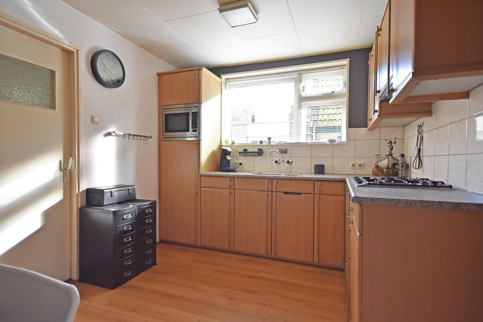 Begane grond: zij-entree, hal met kelder, zonnige woonkamer met laminaatvloer, ruim vrij en groen zicht in de straat en sfeerhaard, open keuken met laminaatvloer en nette hoekopstelling v.v. diverse inbouwapparatuur, hal met plavuizenvloer, vaste kast en achter-entree, witgoed-ruimte met