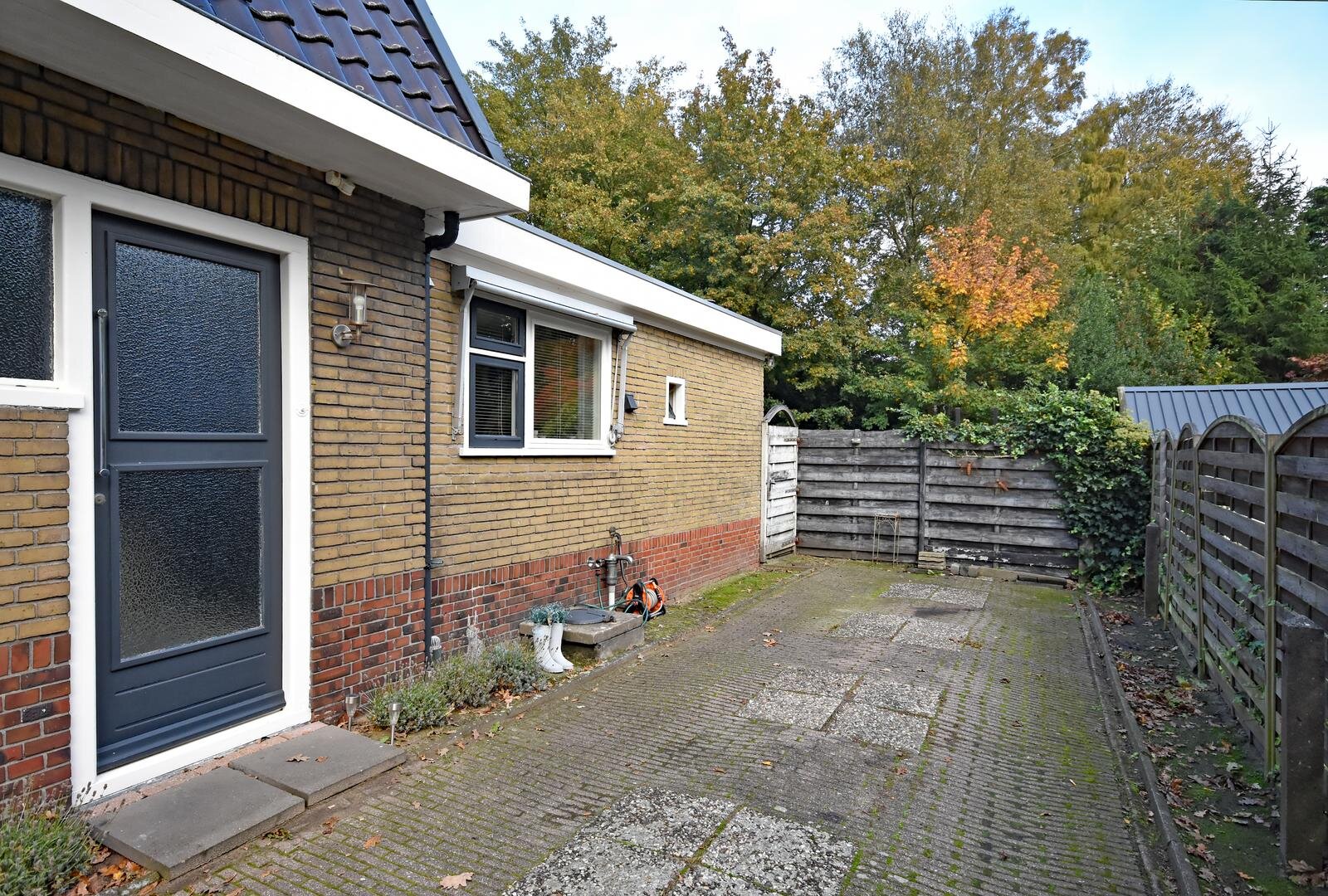 Het perceel meet 325 m² eigen grond, met een royale oprit die parkeergelegenheid biedt voor meerdere auto’s, en eventueel zelfs een caravan of camper.
