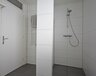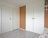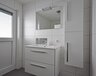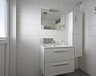 1e verdieping: overloop met laminaatvloer, 3 slaapkamers met laminaatvloer en vaste kasten, moderne badkamer met inloopdouche, wastafelmeubel en deur naar droogplat.