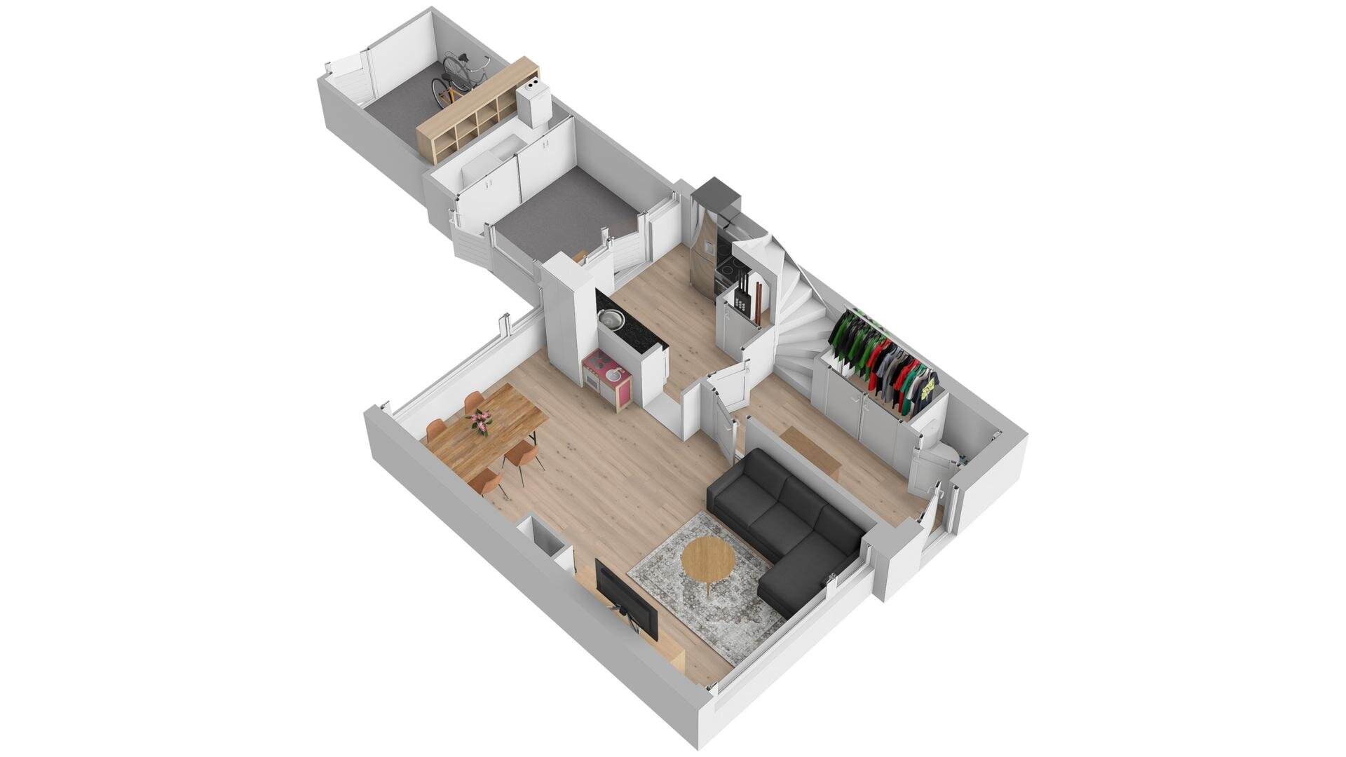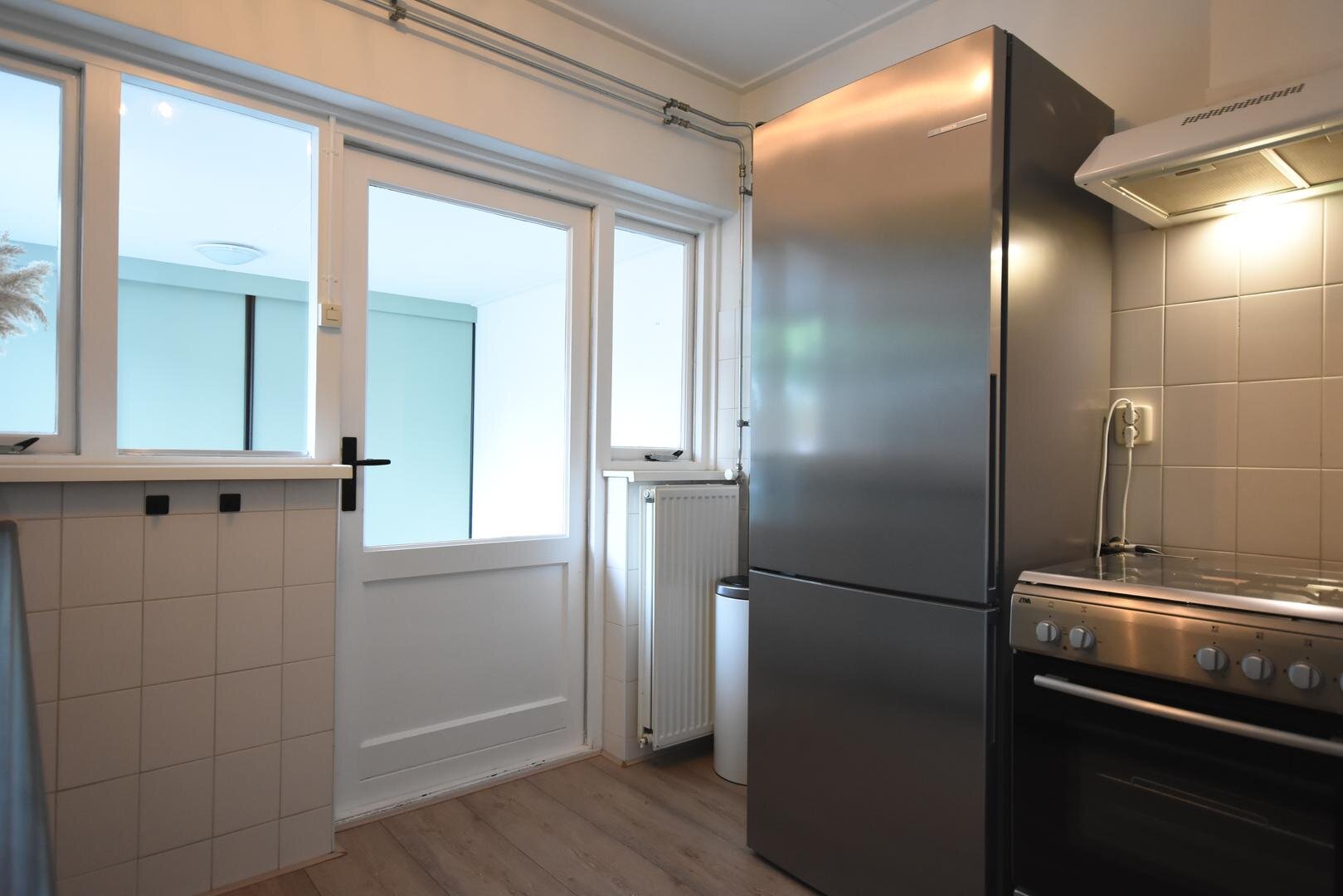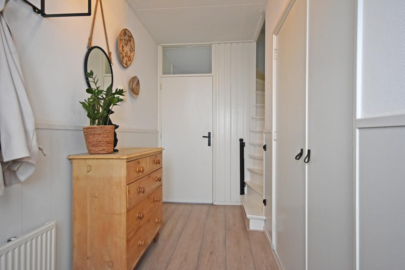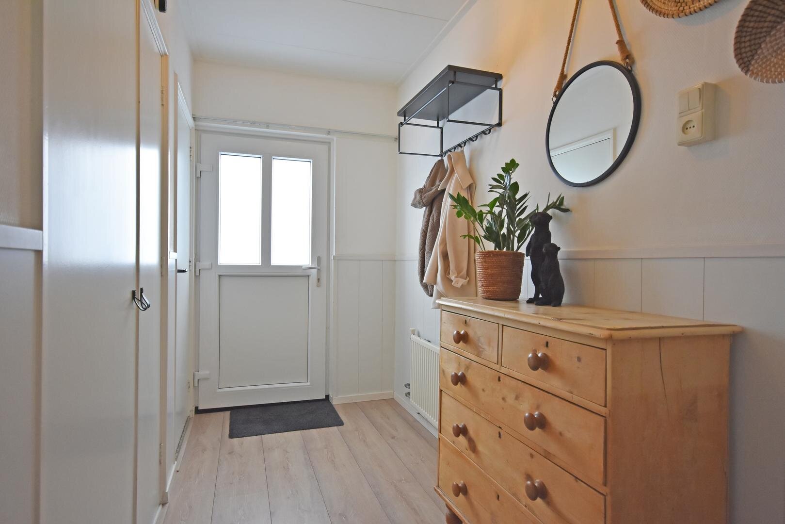 Begane grond: voor-entree, hal met laminaatvloer en vast kast, gemoderniseerd toilet, keuken met laminaatvloer, praktische kelderkast en nette opstelling, strakke woonkamer met laminaatvloer en sfeervolle houtkachel, aangebouwde ruime bijkeuken (2016) met vaste kastenwand (met witgoed-aansluitingen) en achter-entree.