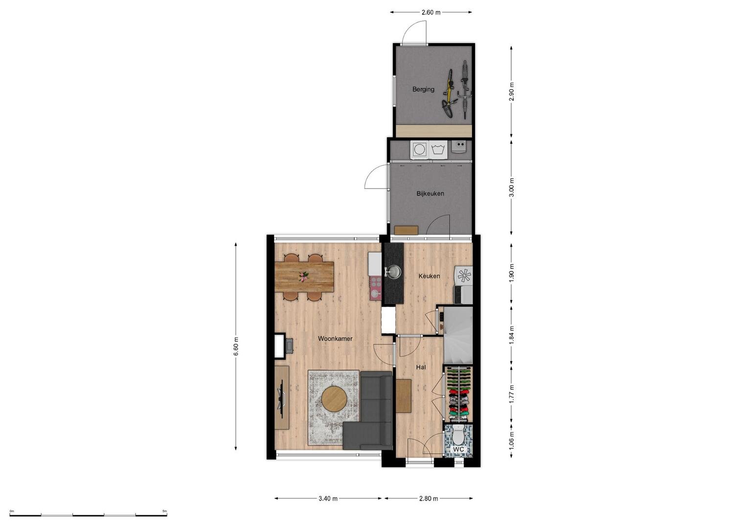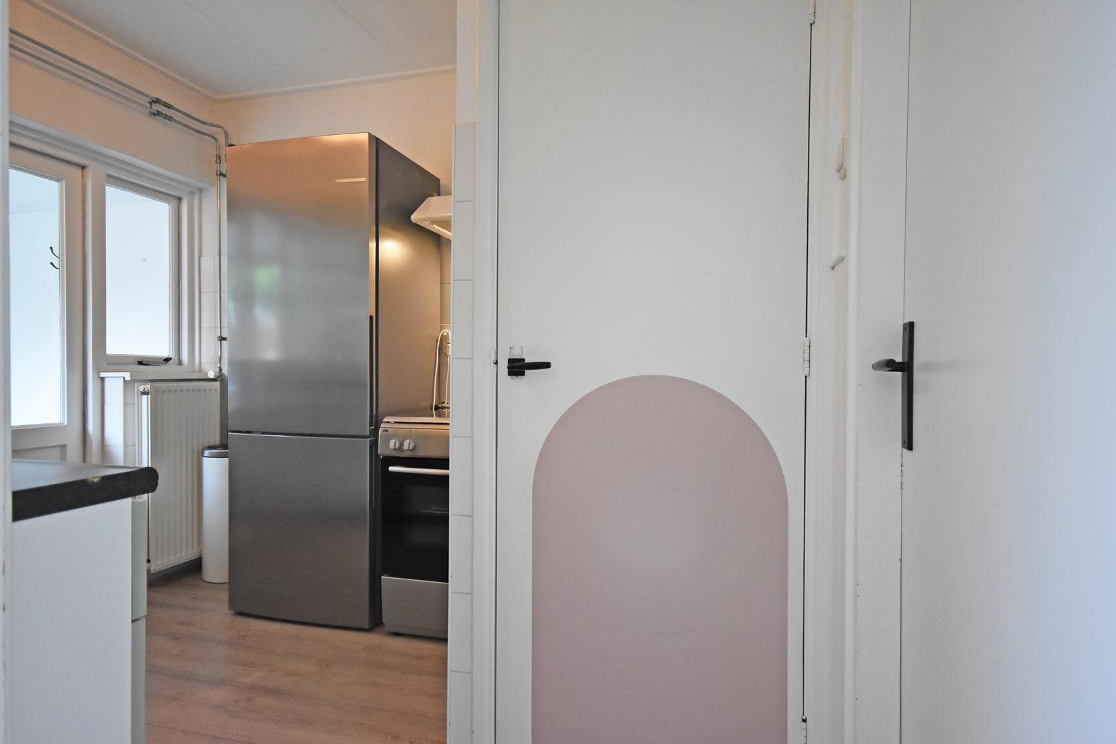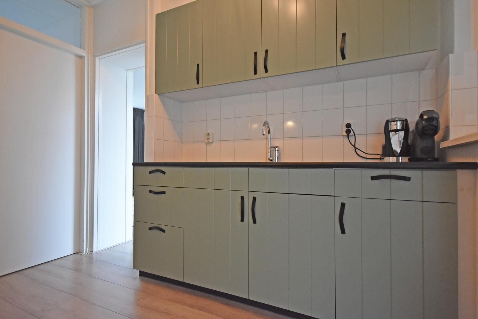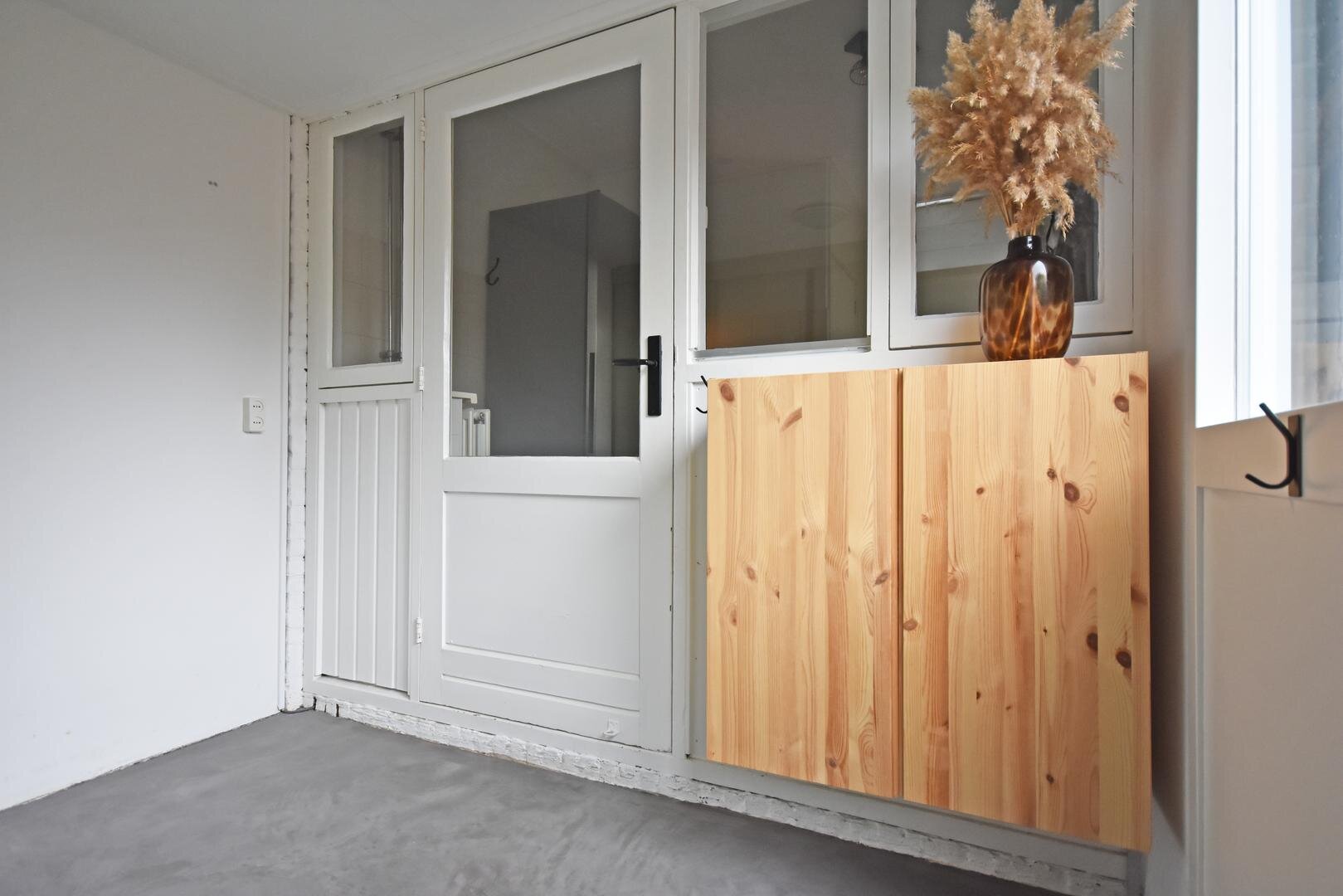 Begane grond: voor-entree, hal met laminaatvloer en vast kast, gemoderniseerd toilet, keuken met laminaatvloer, praktische kelderkast en nette opstelling, strakke woonkamer met laminaatvloer en sfeervolle houtkachel, aangebouwde ruime bijkeuken (2016) met vaste kastenwand (met witgoed-aansluitingen) en achter-entree.