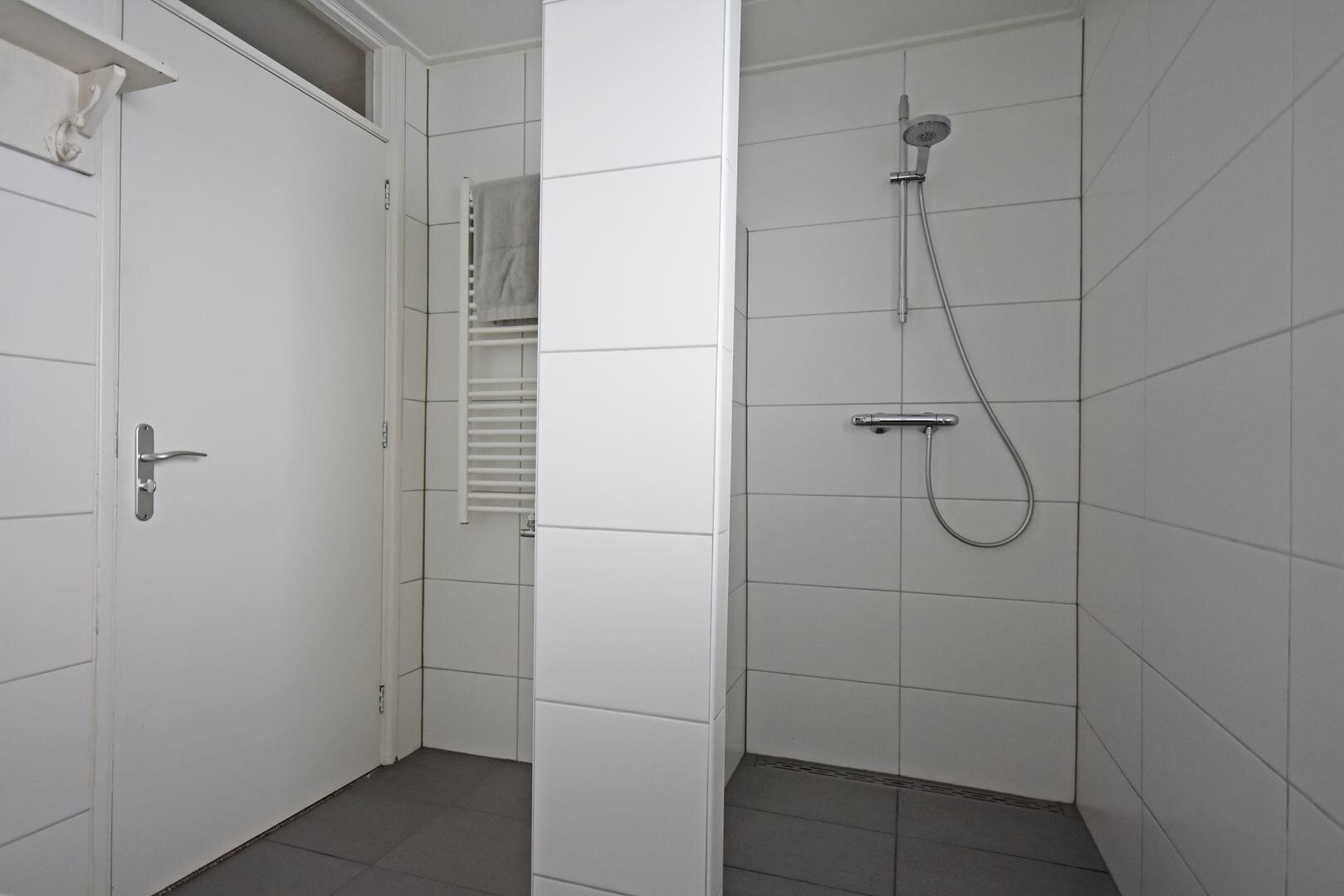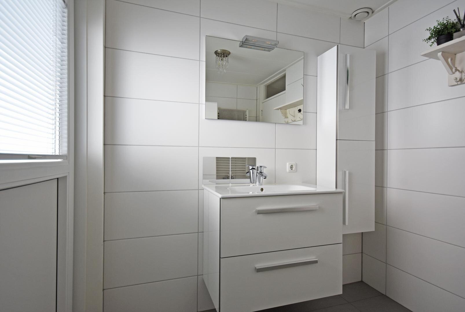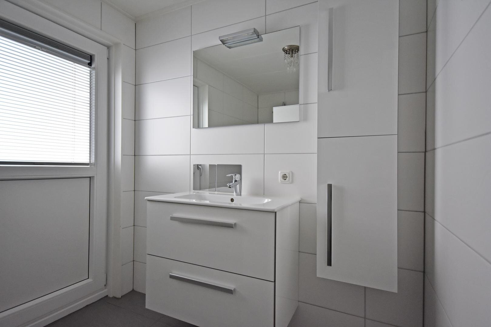 1e verdieping: overloop met laminaatvloer, 3 slaapkamers met laminaatvloer en vaste kasten, moderne badkamer met inloopdouche, wastafelmeubel en deur naar droogplat.