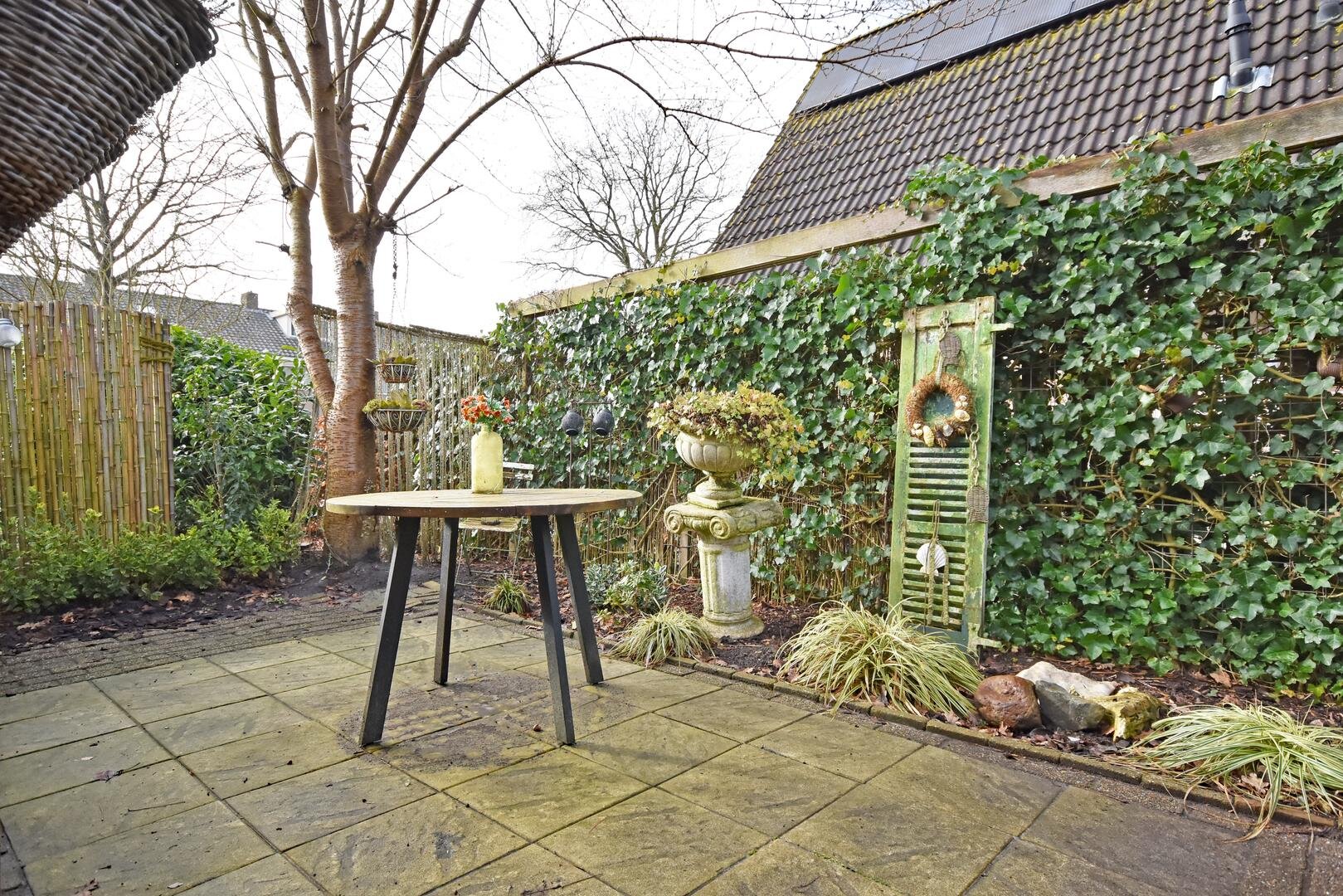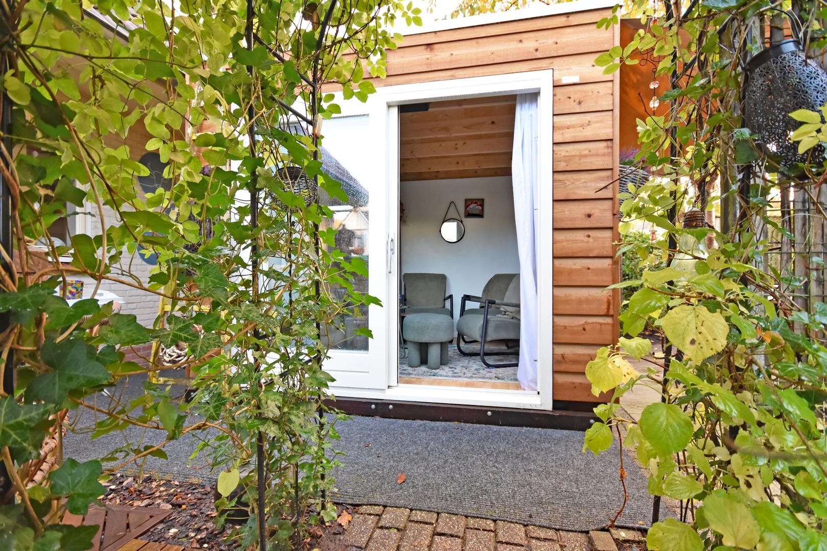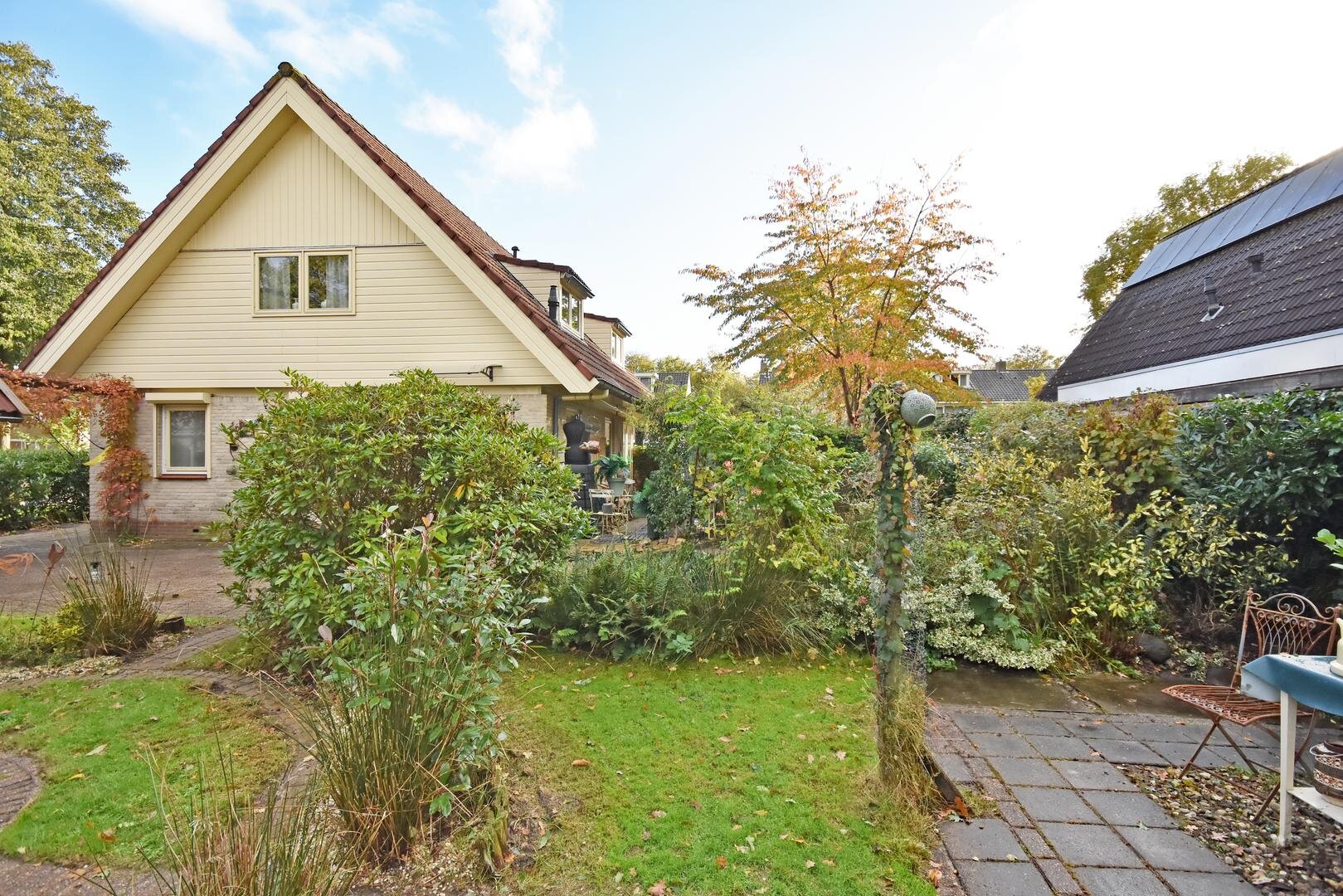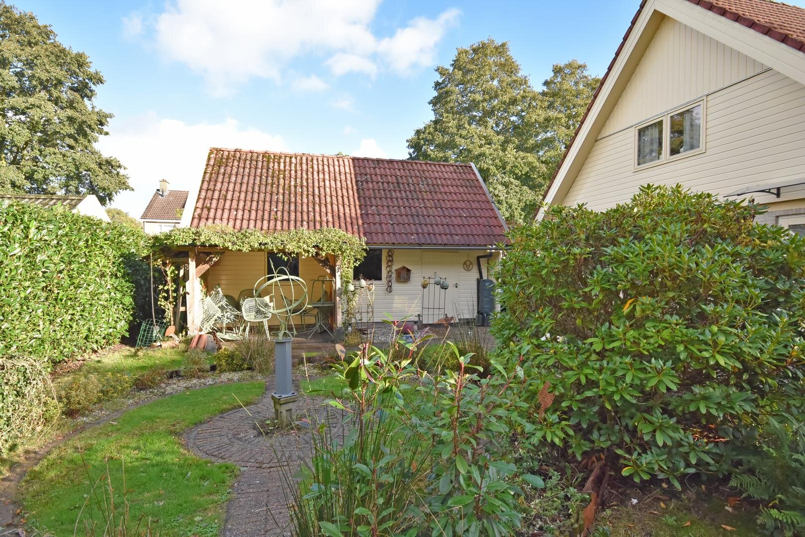 Rondom de woning ligt een zonnige tuin met meerdere terrassen, waardoor er altijd wel een fijne plek te vinden is om buiten te zitten. Onder de overkapping is het ook in de avonduren prettig verblijven. In de zijtuin is in 2022 een vrijstaande tuinkamer gerealiseerd. Deze ruimte is geschikt als praktijk- of kantoorruimte aan huis, maar kan ook dienen als hobbyruimte of rustige werkplek.
