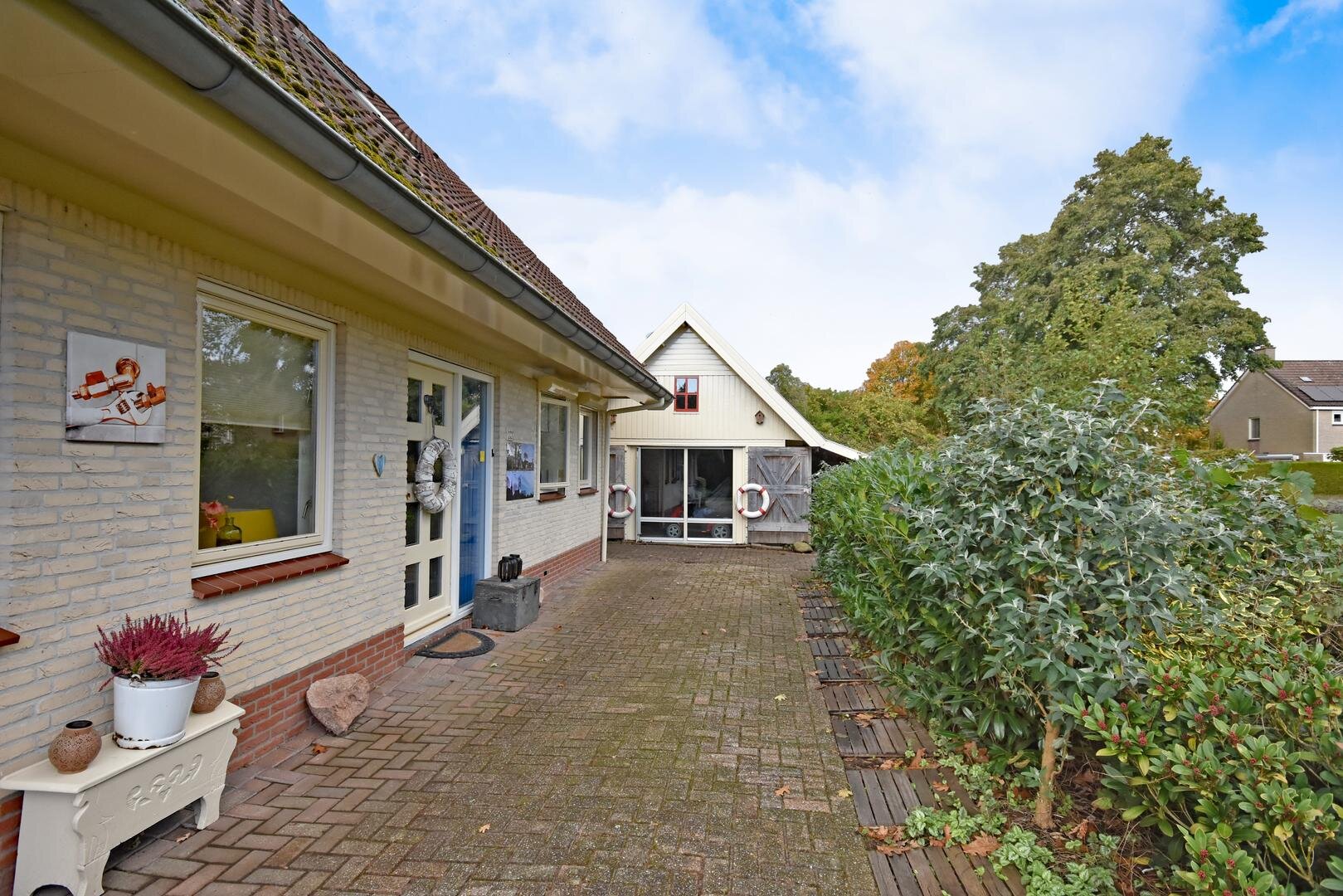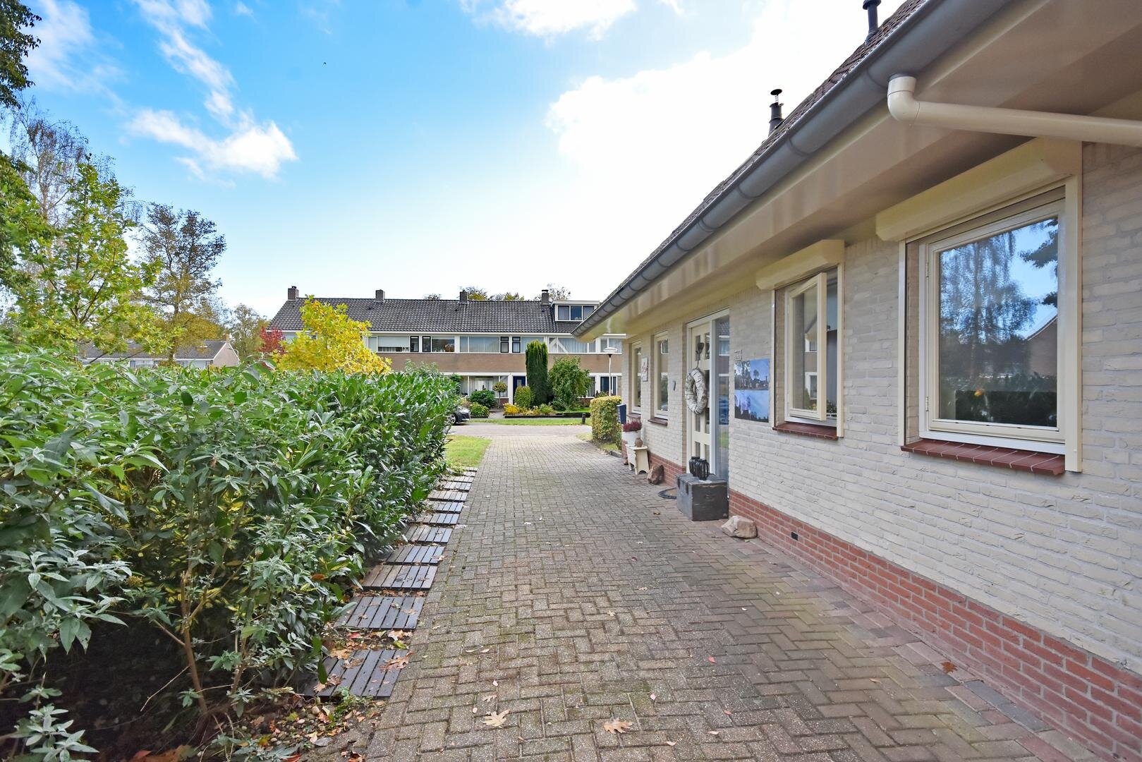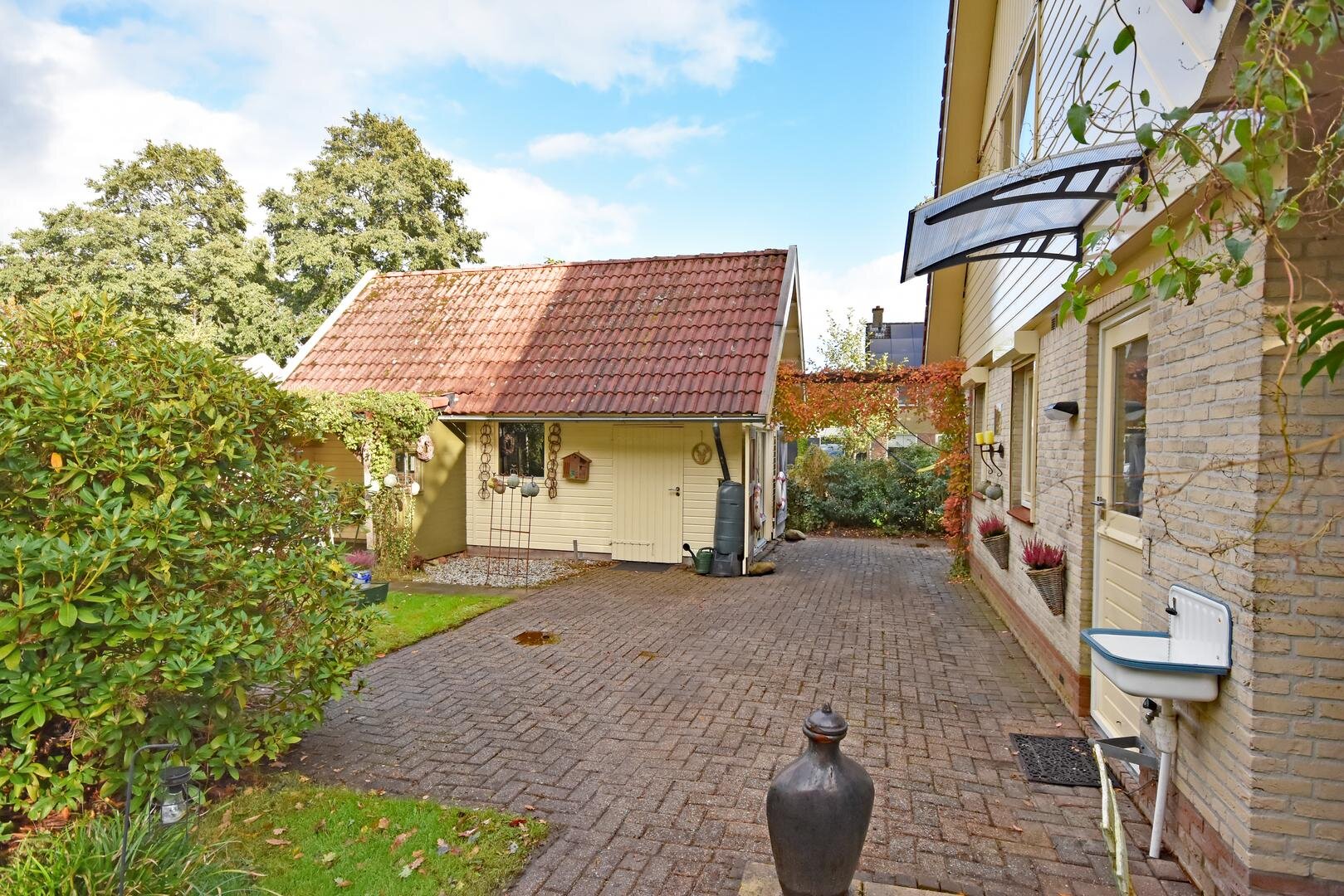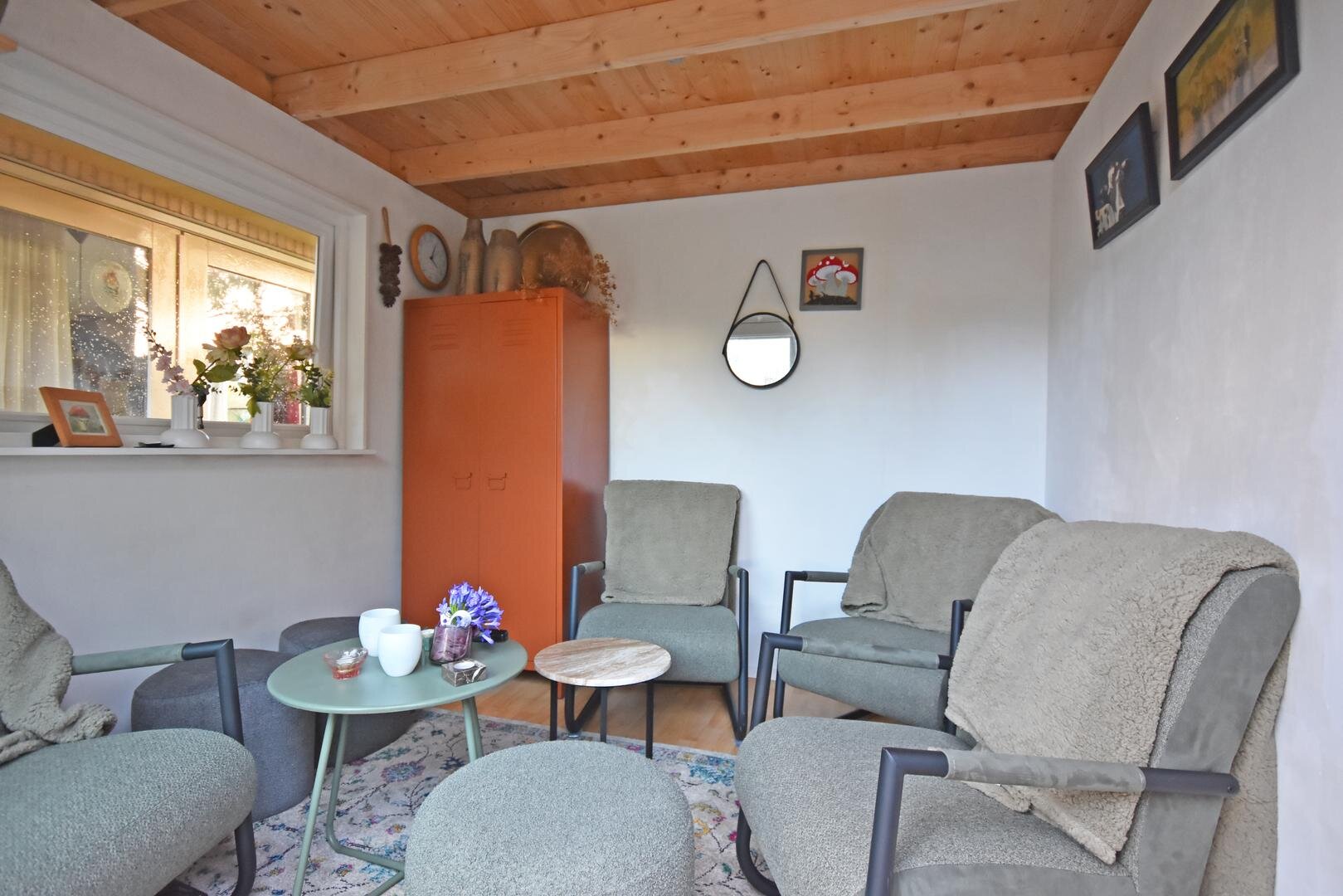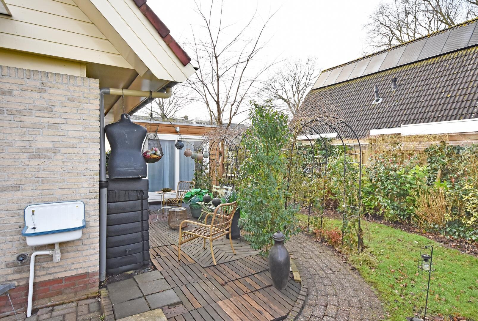 Rondom de woning ligt een zonnige tuin met meerdere terrassen, waardoor er altijd wel een fijne plek te vinden is om buiten te zitten. Onder de overkapping is het ook in de avonduren prettig verblijven. In de zijtuin is in 2022 een vrijstaande tuinkamer gerealiseerd. Deze ruimte is geschikt als praktijk- of kantoorruimte aan huis, maar kan ook dienen als hobbyruimte of rustige werkplek.