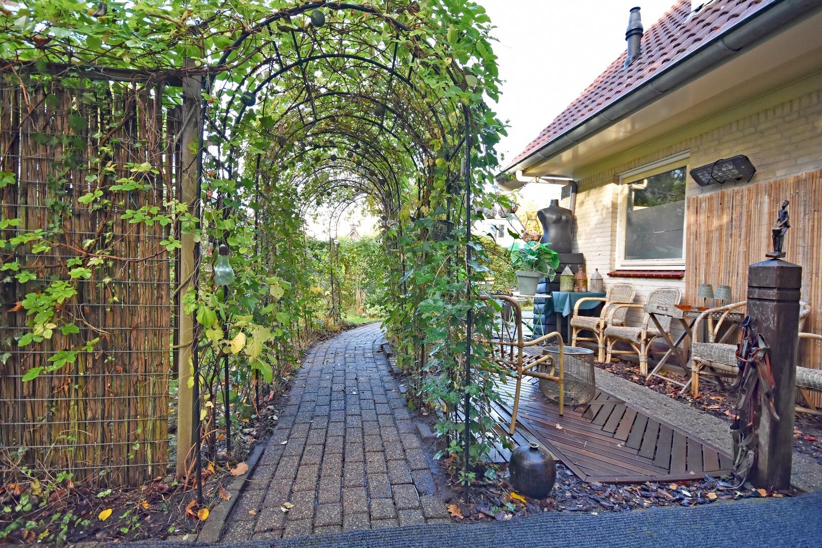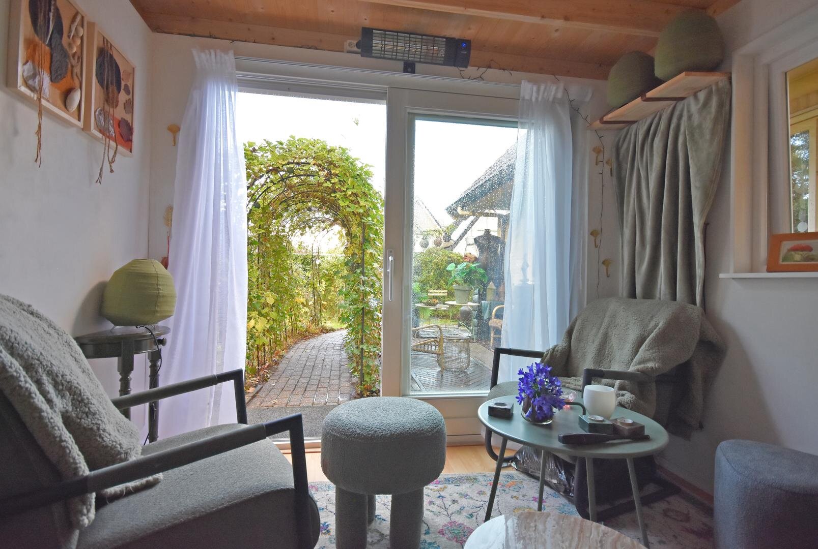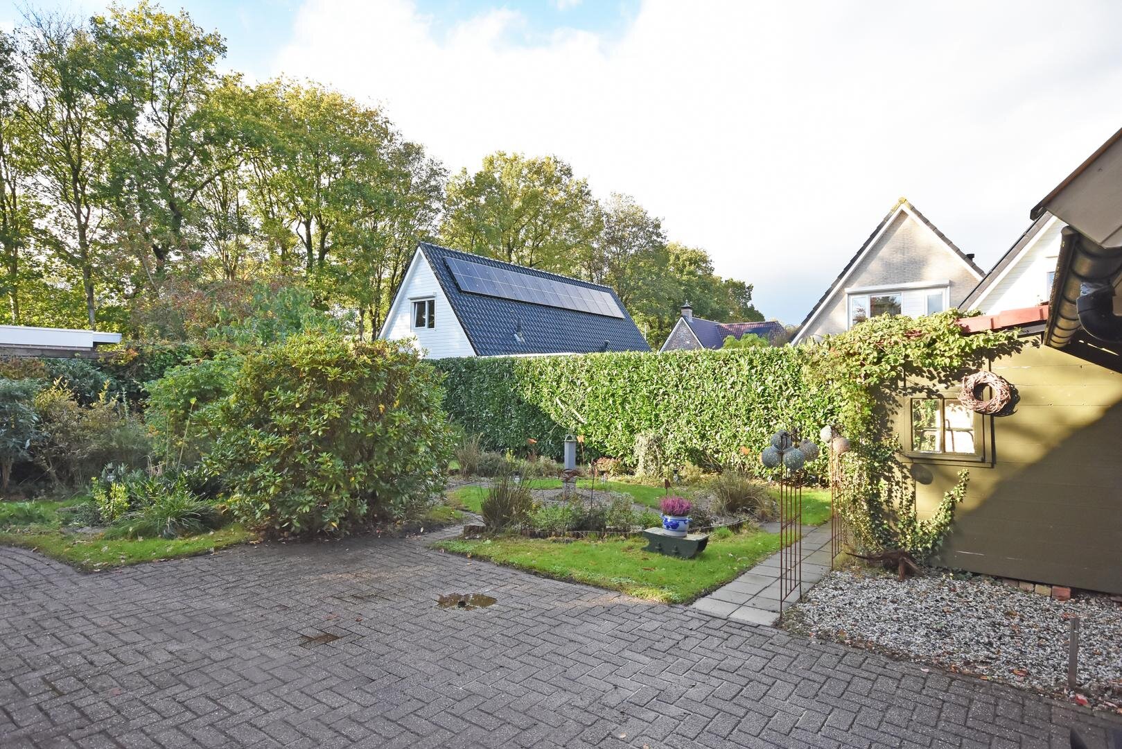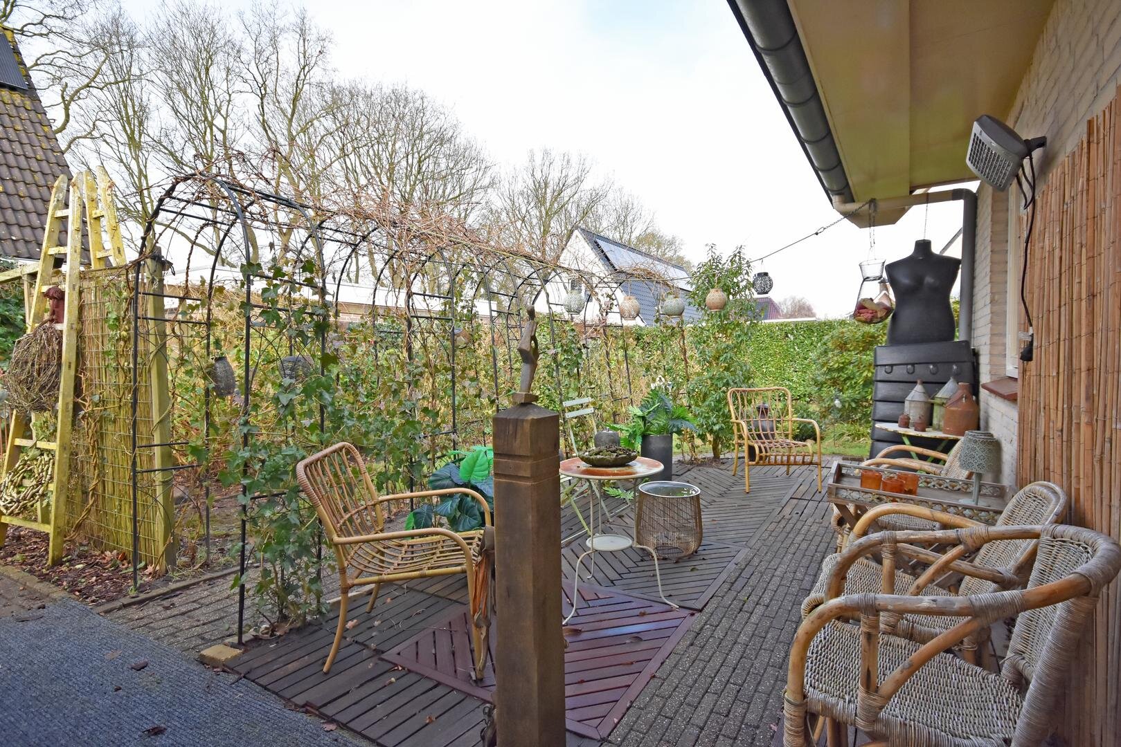Rondom de woning ligt een zonnige tuin met meerdere terrassen, waardoor er altijd wel een fijne plek te vinden is om buiten te zitten. Onder de overkapping is het ook in de avonduren prettig verblijven. In de zijtuin is in 2022 een vrijstaande tuinkamer gerealiseerd. Deze ruimte is geschikt als praktijk- of kantoorruimte aan huis, maar kan ook dienen als hobbyruimte of rustige werkplek.