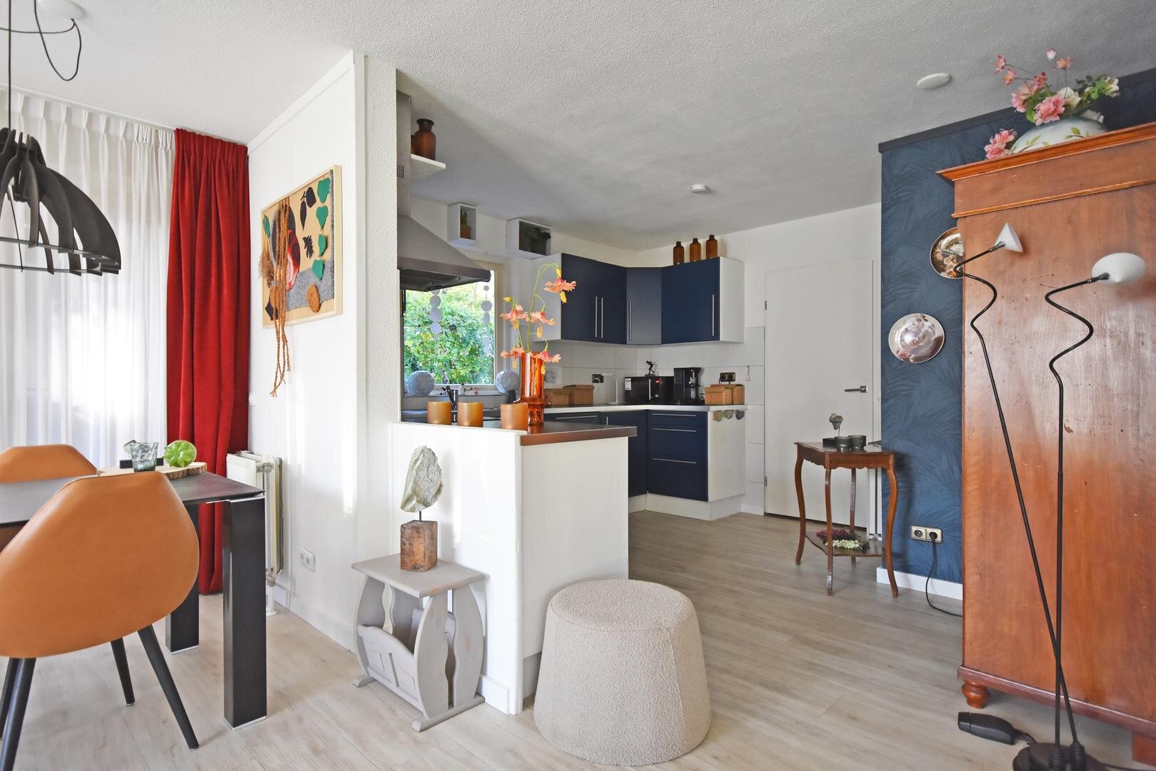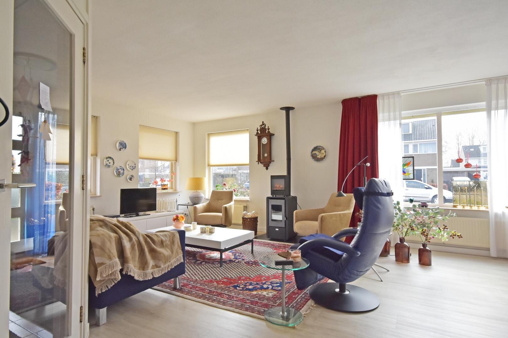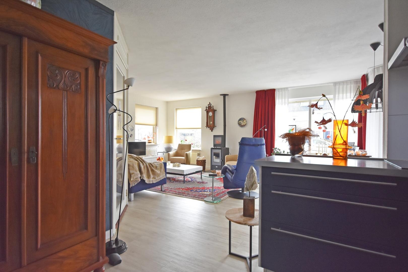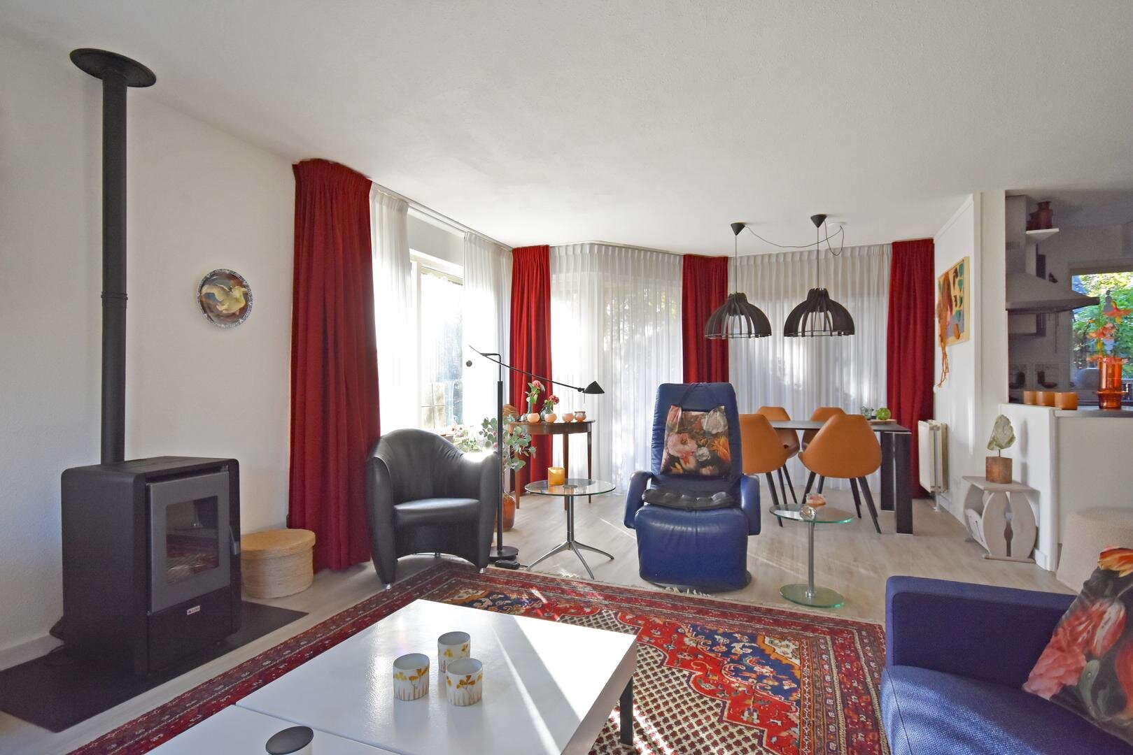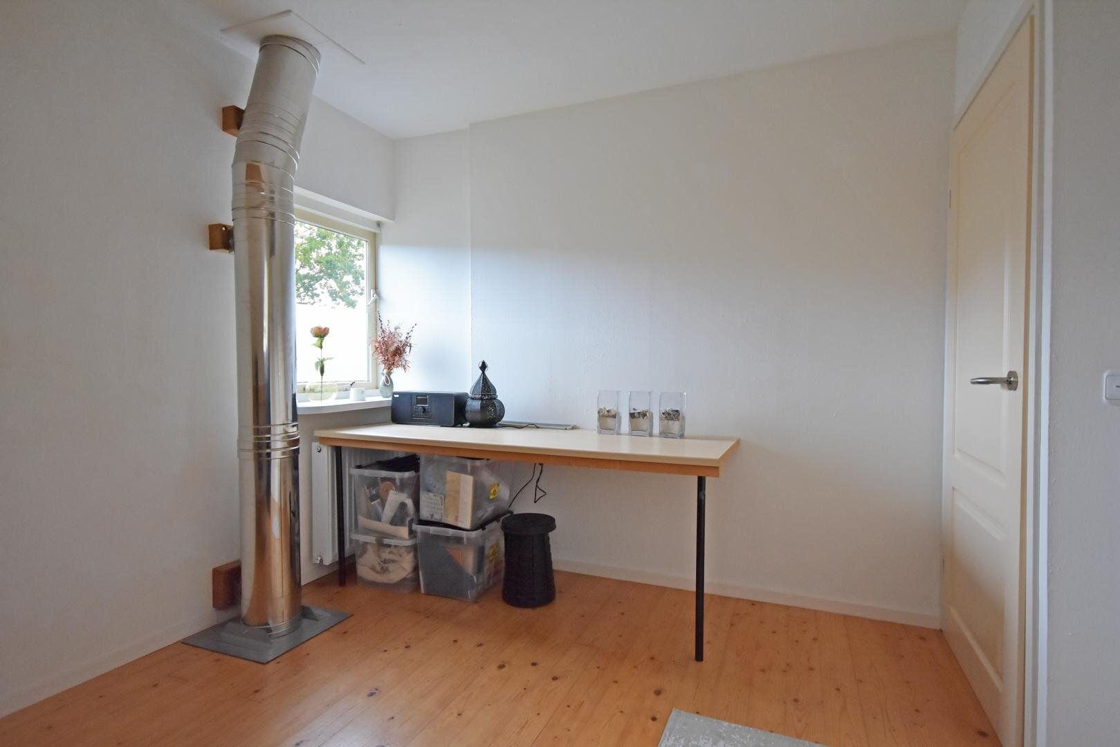 Binnen valt direct de prettige lichtinval op. Door de zuidelijke ligging is de woonkamer aangenaam licht en ontstaat er een open en ruimtelijk gevoel. Het aanwezige rookkanaal biedt de mogelijkheid om een hout- of pelletkachel te plaatsen, wat extra sfeer kan toevoegen in de koudere maanden.
