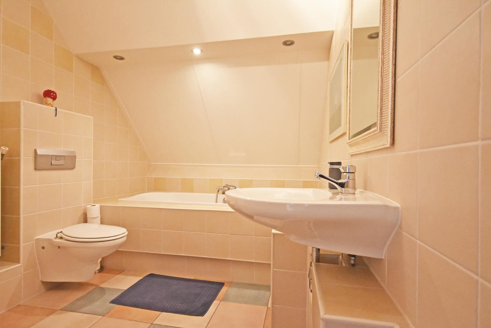 1e verdieping: ruime overloop, 3 ruime slaapkamers waarvan één met ingebouwde (infrarood)sauna en één over de volle breedte van de woning met inloop/bergkast, complete en ‘warme’ 2e badkamer met ligbad, douche, vrijdragend toilet en wastafel.