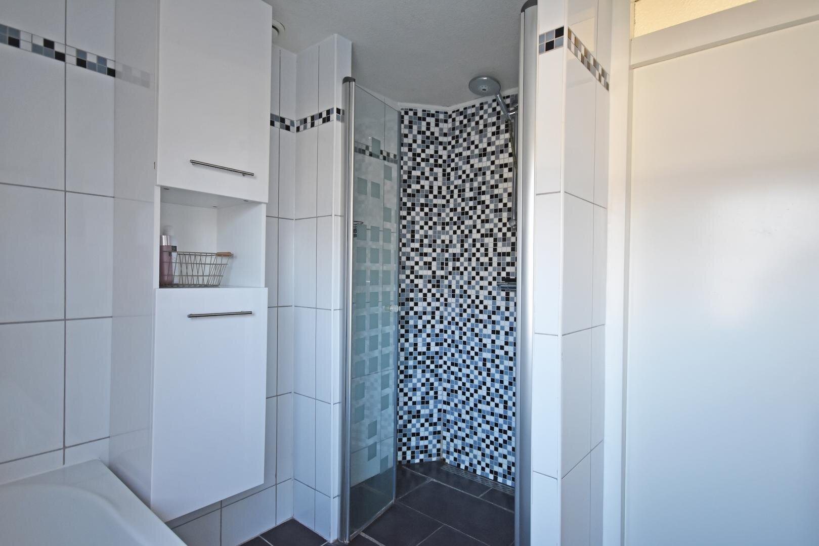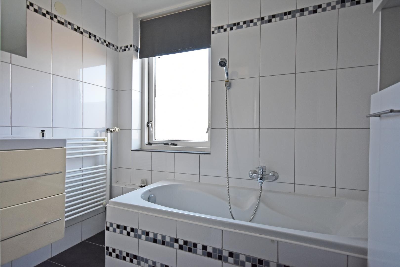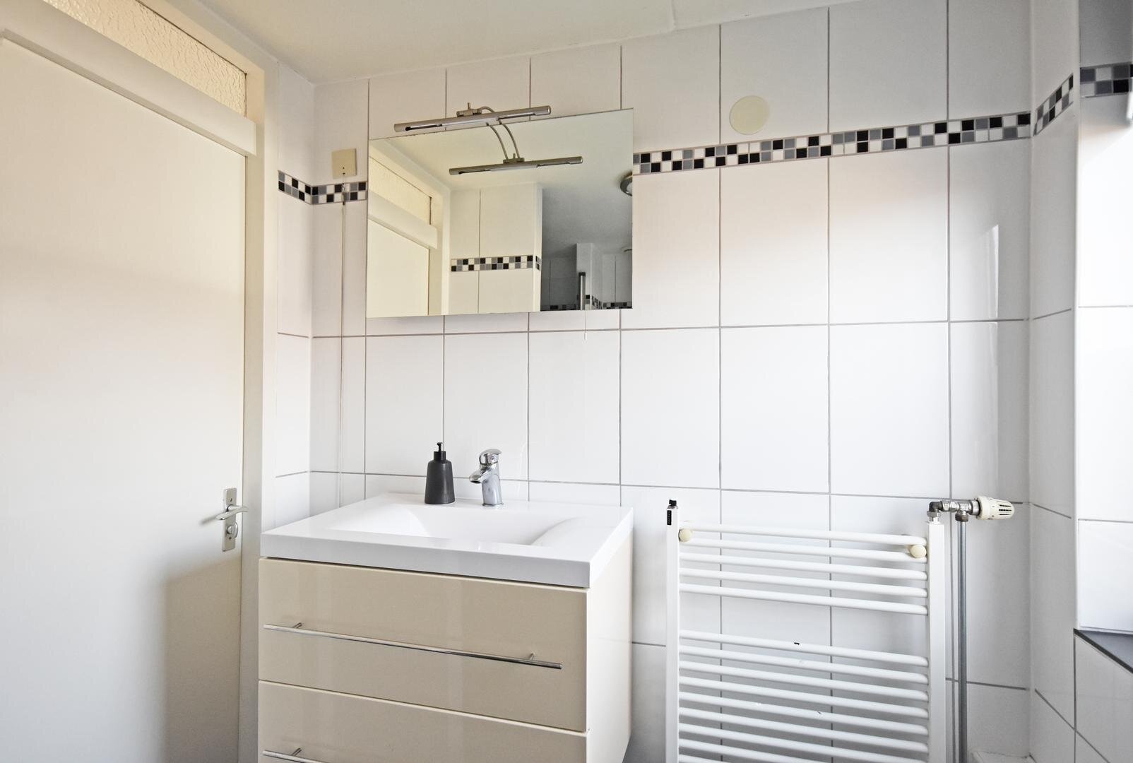 1e verdieping: overloop, 3 slaapkamers met laminaatvloer, gemoderniseerde badkamer met ligbad, douche en vaste wastafel.