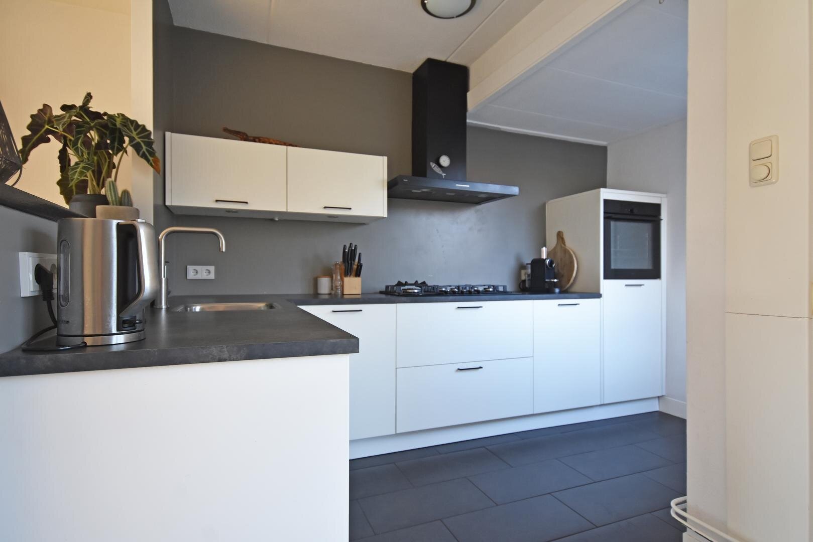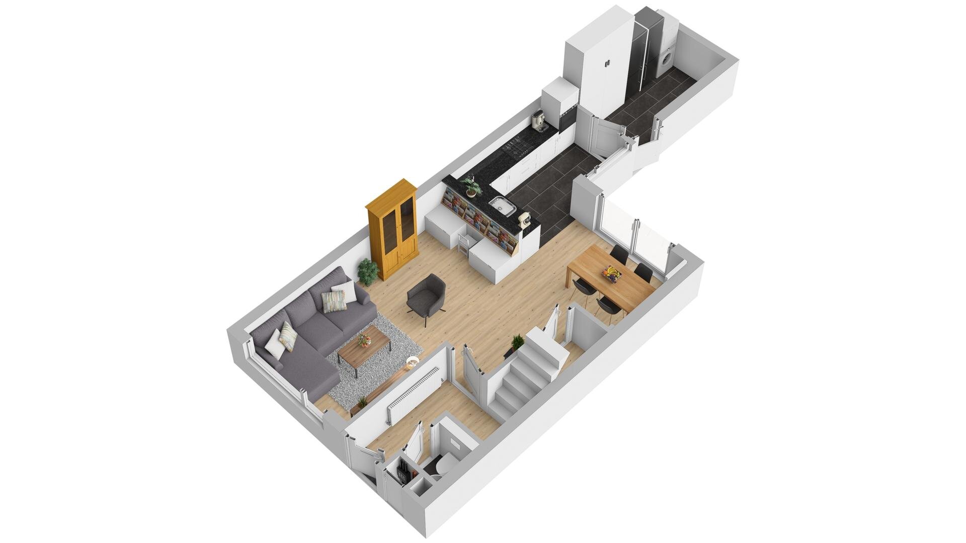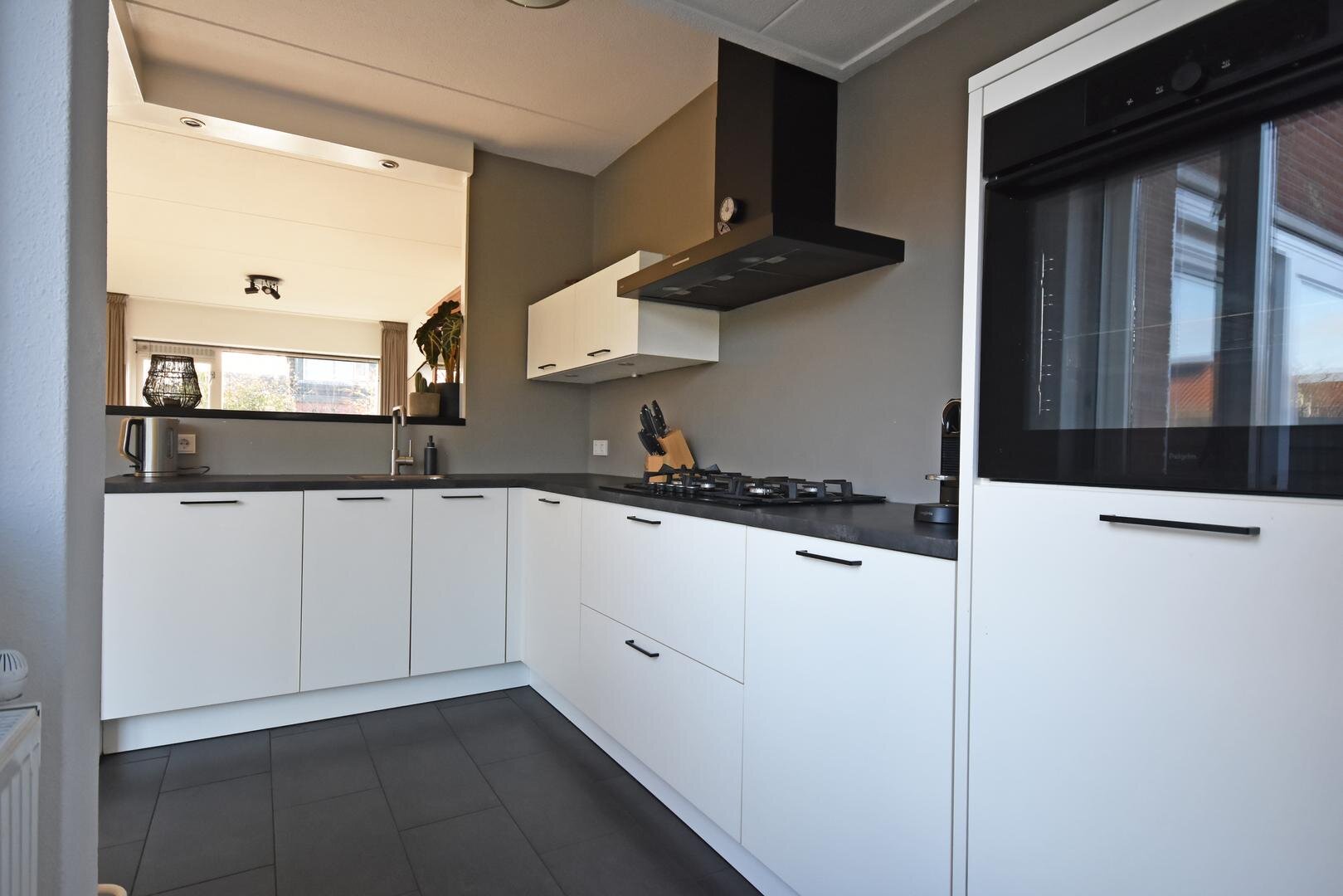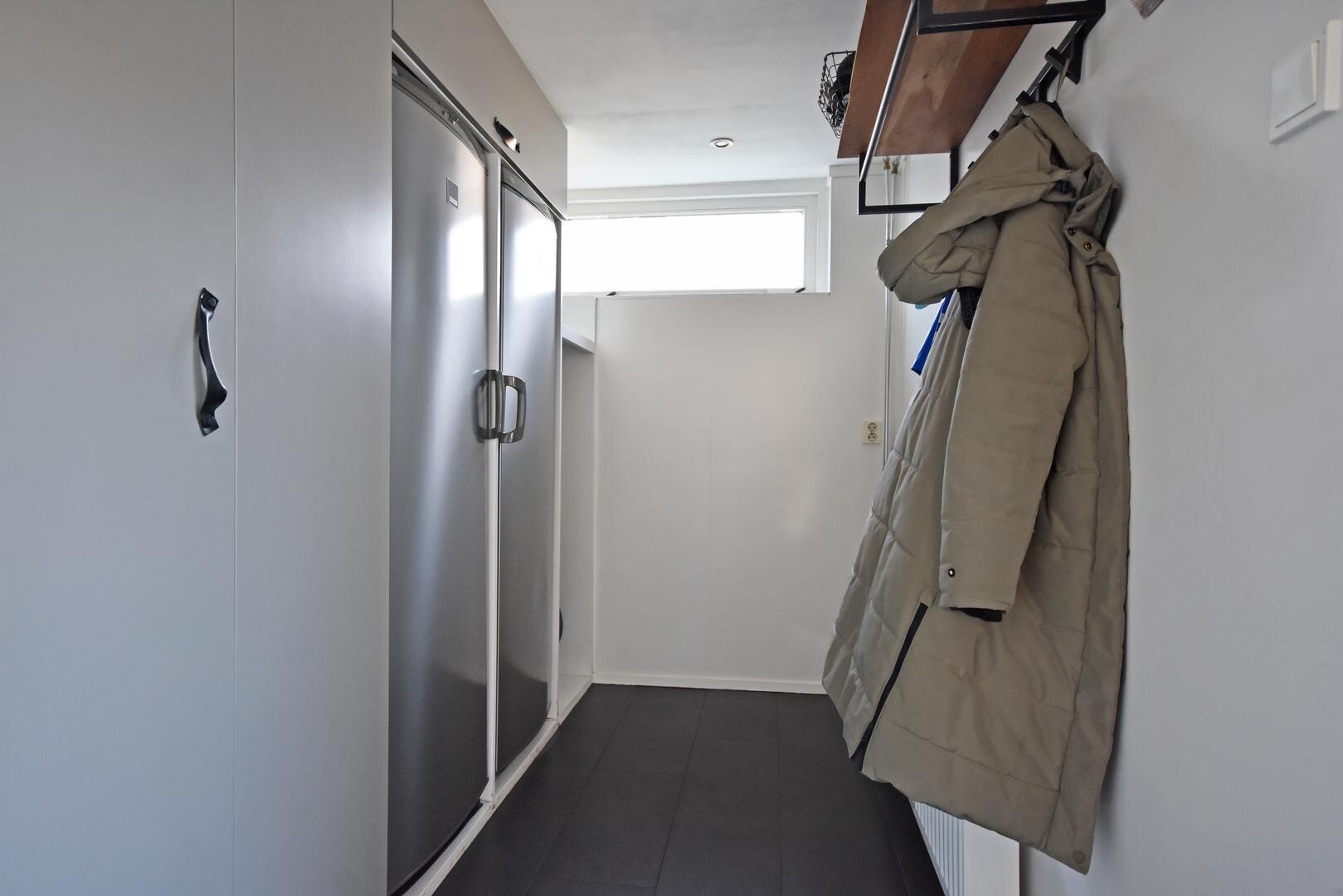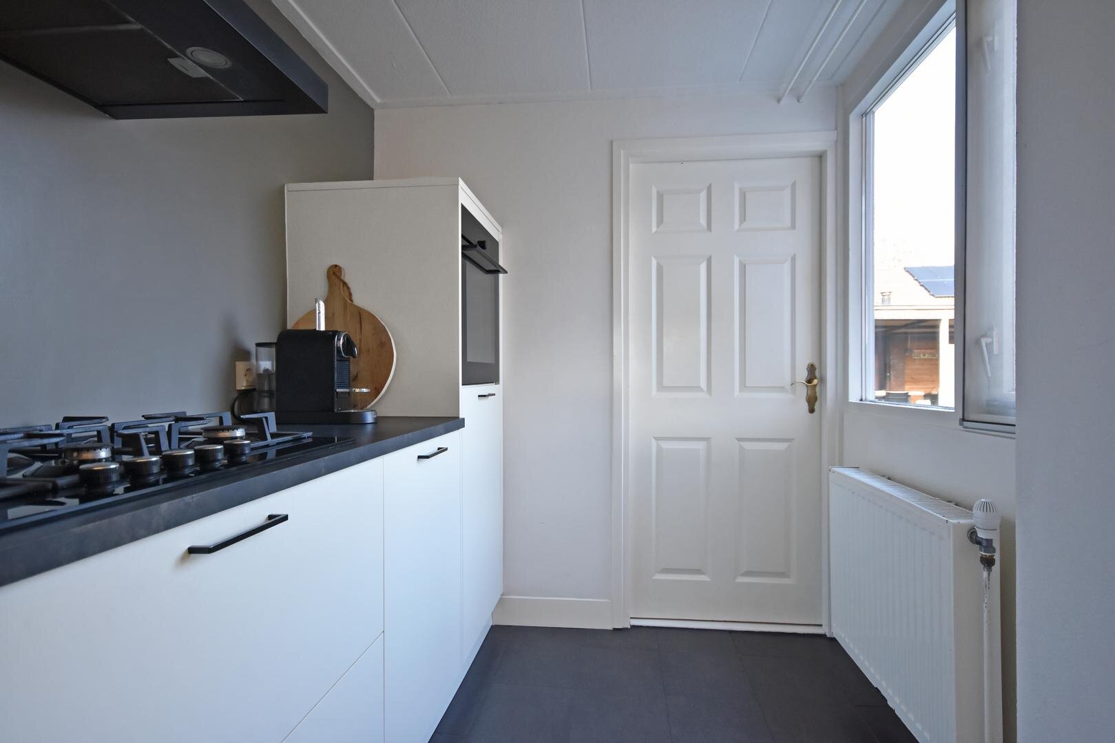 Begane grond: voor-entree, hal met laminaatvloer, modern vrijdragend toilet met fonteintje, zonnige Z-vormige woonkamer met laminaatvloer, schuifpui en praktische trapkast, halfopen deels uitpandige keuken met plavuizenvloer en moderne hoekopstelling (2022) voorzien van diverse inbouwapparatuur, aangebouwde ruime bijkeuken met plavuizenvloer, achter-entree en vaste kastenwand met witgoedaansluitingen.