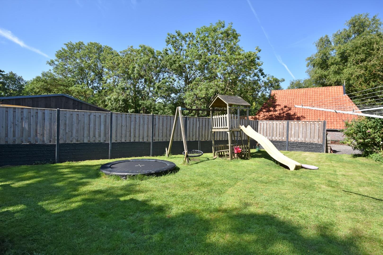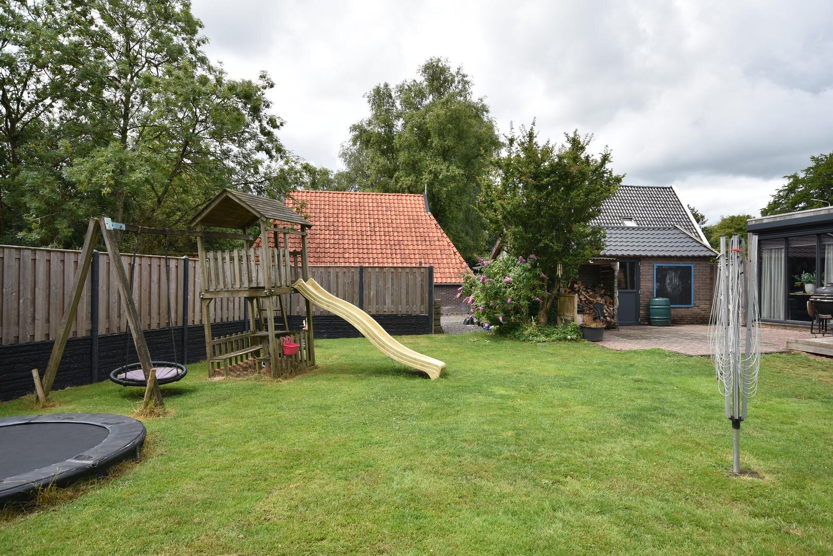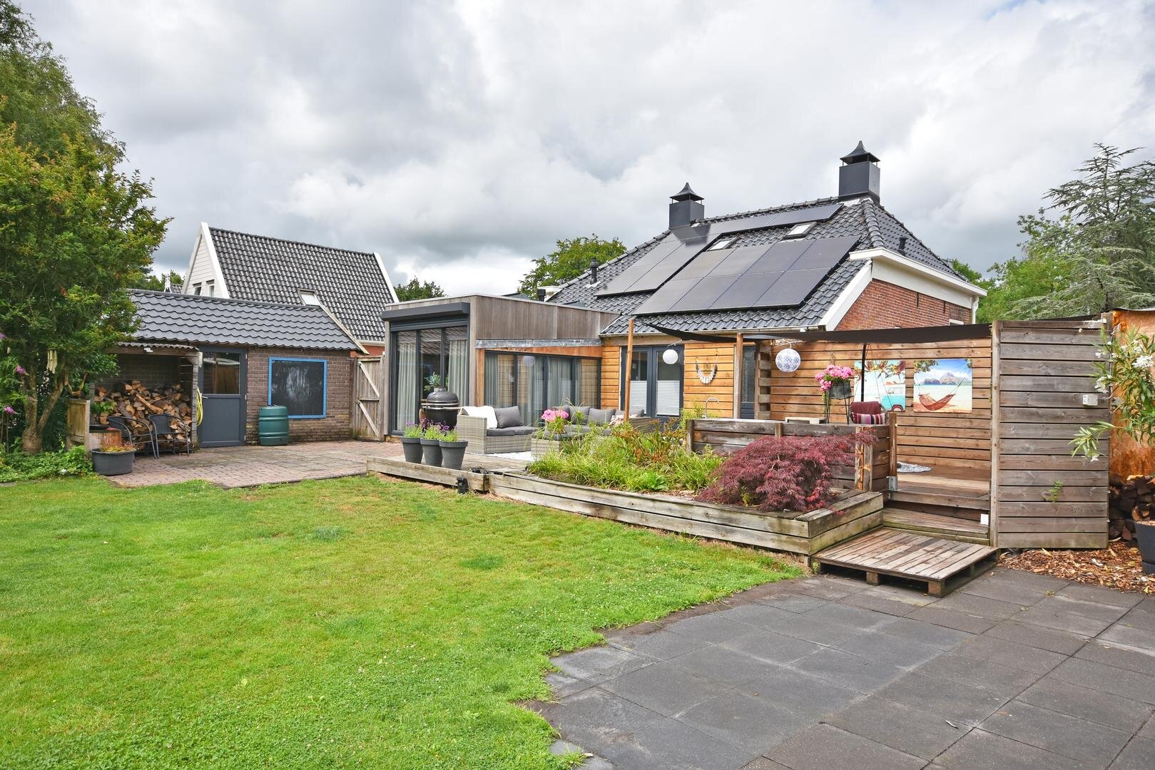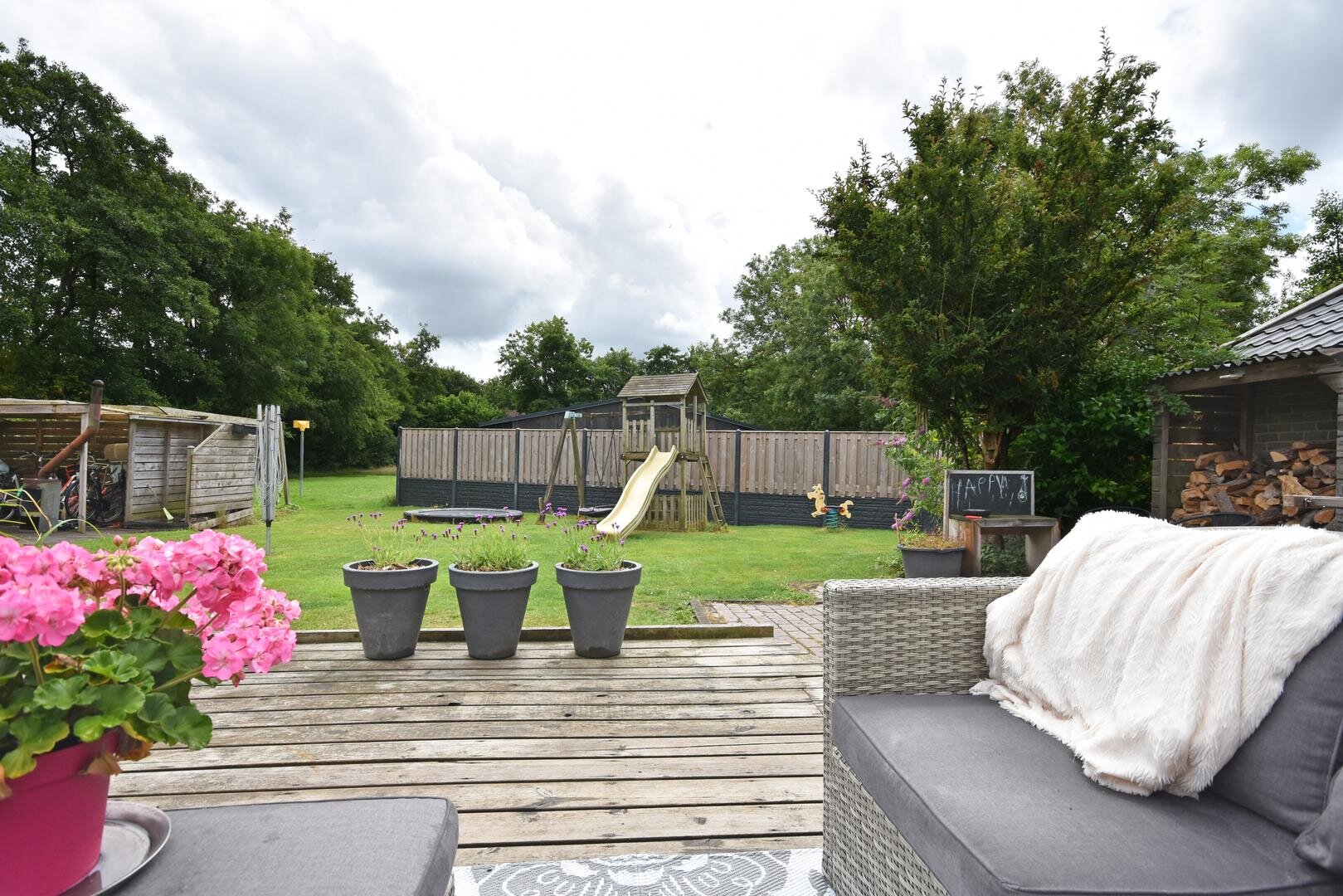 Rondom de woning vind je een zonnige en zeer royale tuin met onder andere groot speel/grasveld, meerdere terrassen, (deels geïsoleerde) stenen garage en (stalen) overkapping met opslagruimtes.