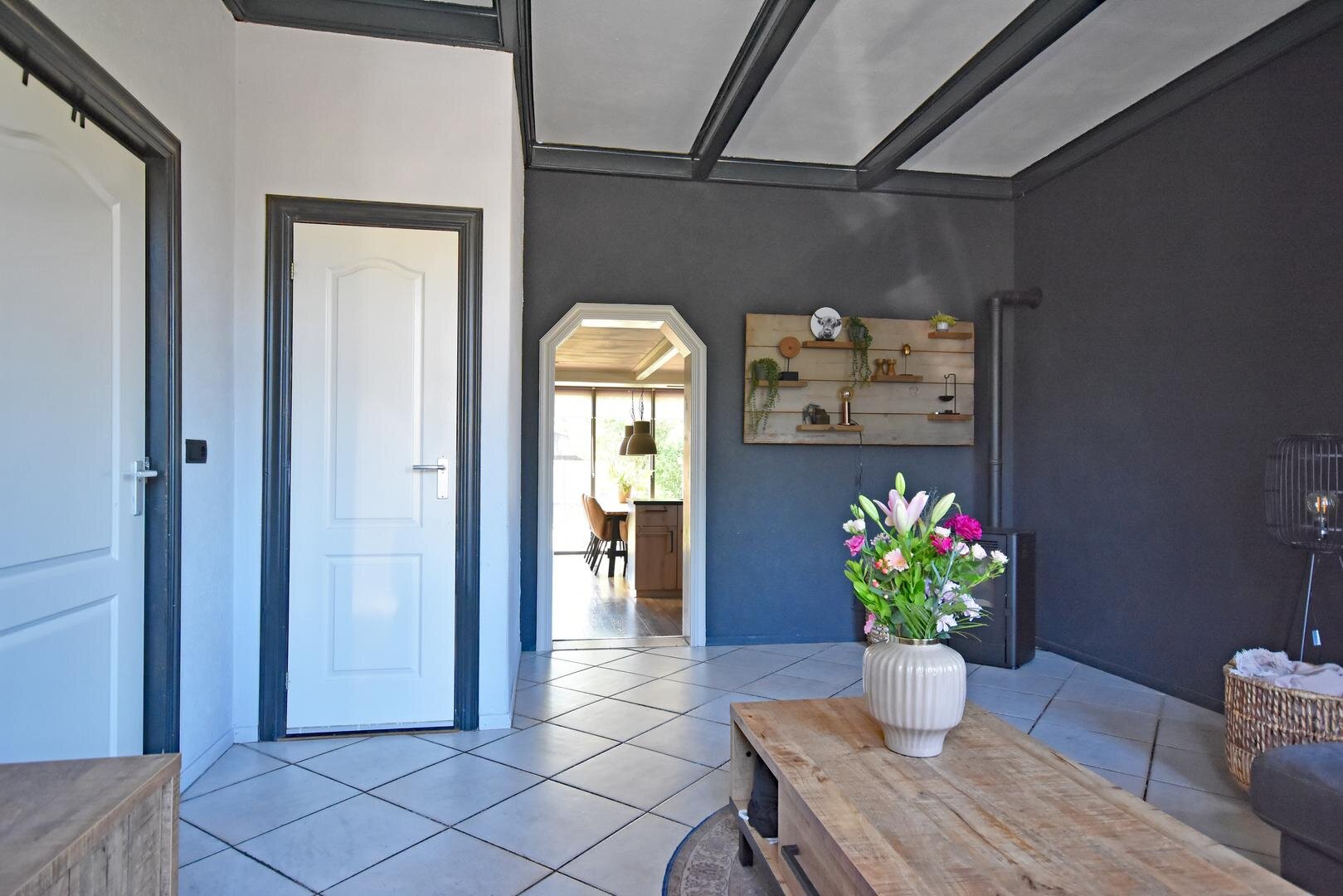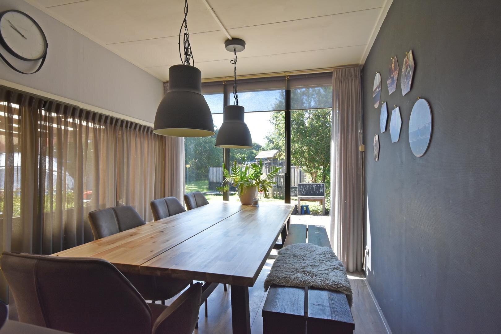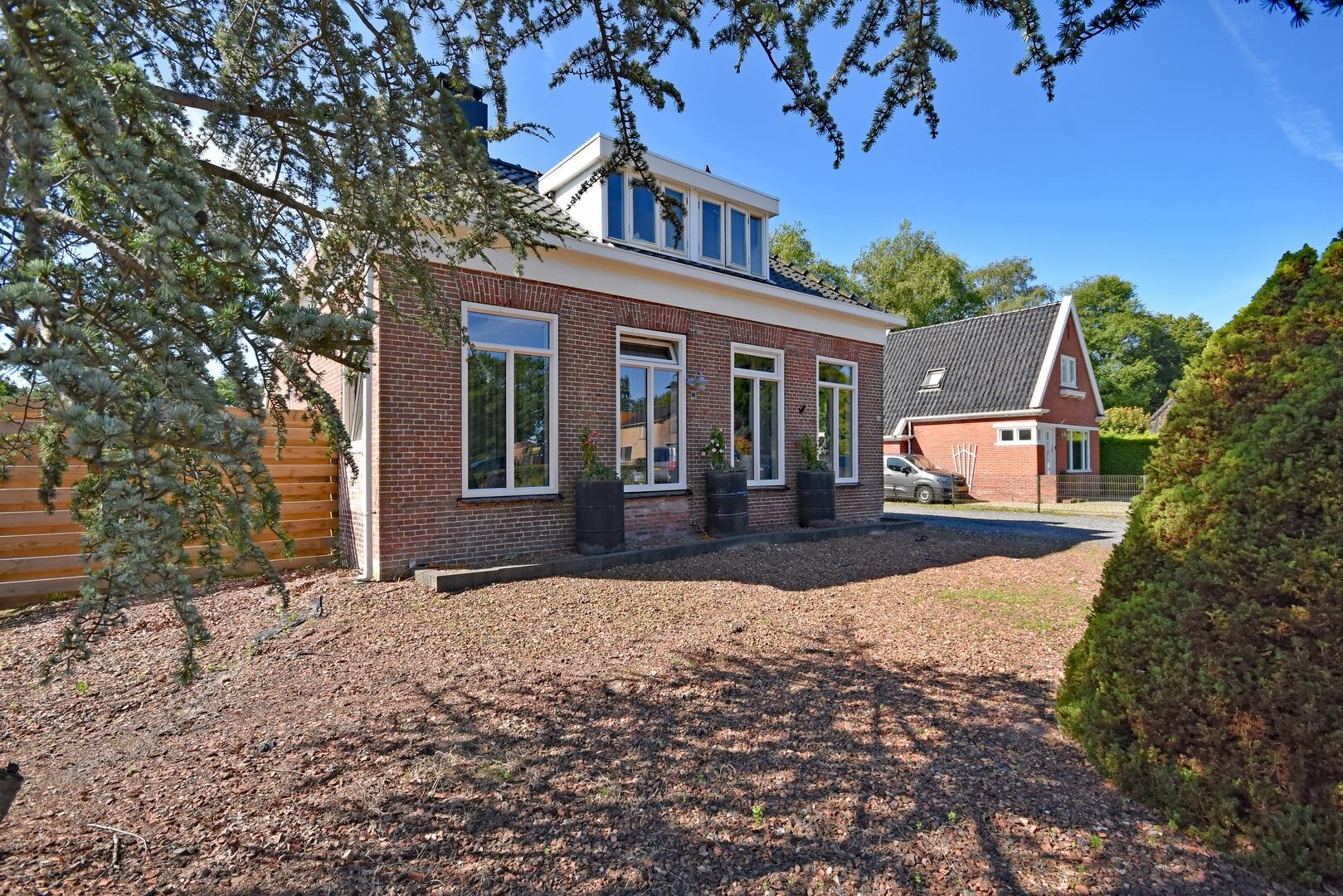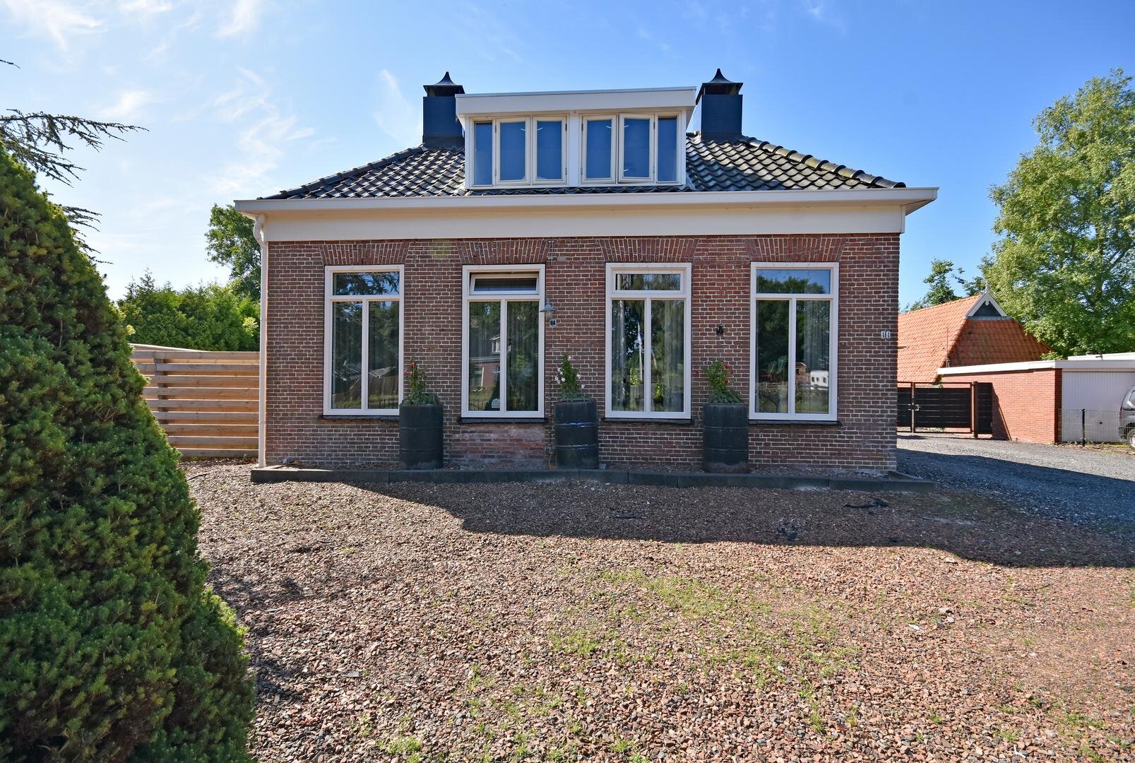 Rondom de woning vind je een zonnige en zeer royale tuin met onder andere groot speel/grasveld, meerdere terrassen, (deels geïsoleerde) stenen garage en (stalen) overkapping met opslagruimtes.