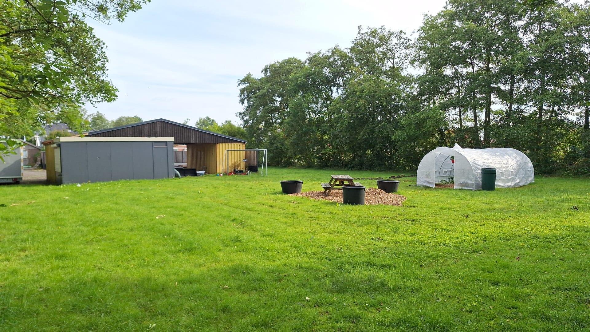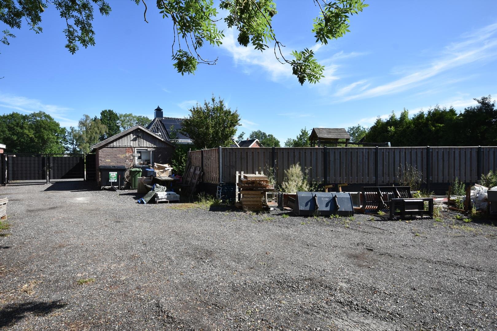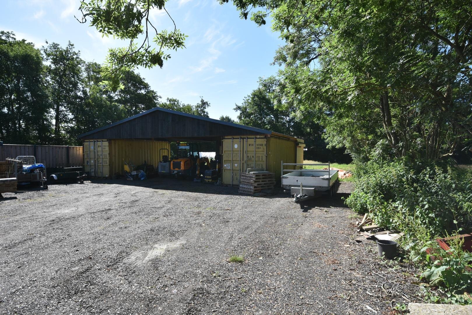 De ruime stalen overkapping met opslagruimtes (zeecontainers) en het semi-verhard voorterrein zijn momenteel bedrijfsmatig in gebruik en ideaal voor diegenen die veel stalling/hobbyruimte(s) benodigd zijn. Deze locatie is gezien het ruime perceel uitermate geschikt voor aan-huis-gebonden bedrijven maar ook voor bijvoorbeeld het hobbymatig houden van dieren.