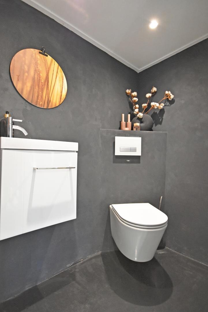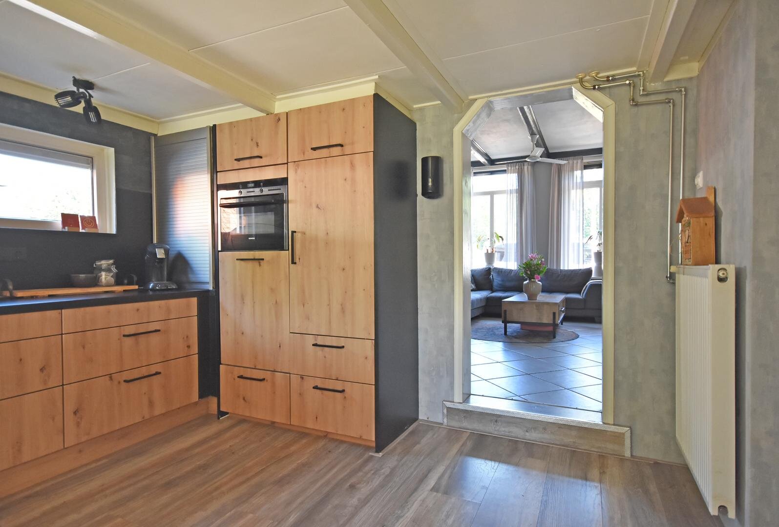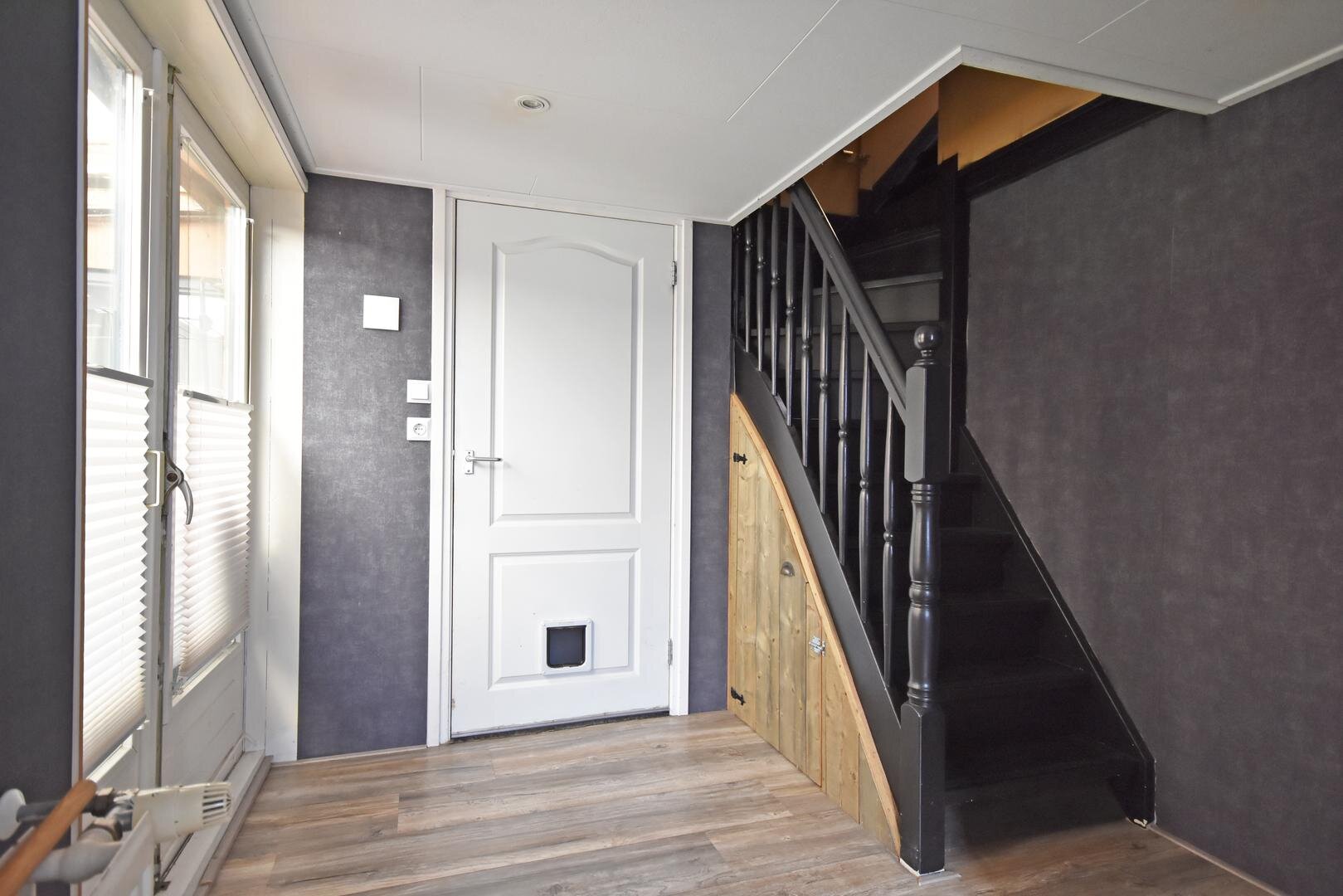 Begane grond: entree/hal met vaste trap naar verdieping, witgoed-aansluitingen en tuindeuren, modern vrijdragend toilet met fonteintje, zonnige, uitgebouwde en tuingerichte half open eet/woonkeuken met moderne speelse opstelling v.v. diverse inbouwapparatuur, woonkamer met plavuizenvloer, balkenplafond en praktische trapkast, slaapkamer met vaste kastenwand, gemoderniseerde badkamer met inloopdouche, vrijdragend toilet en wastafelmeubel.