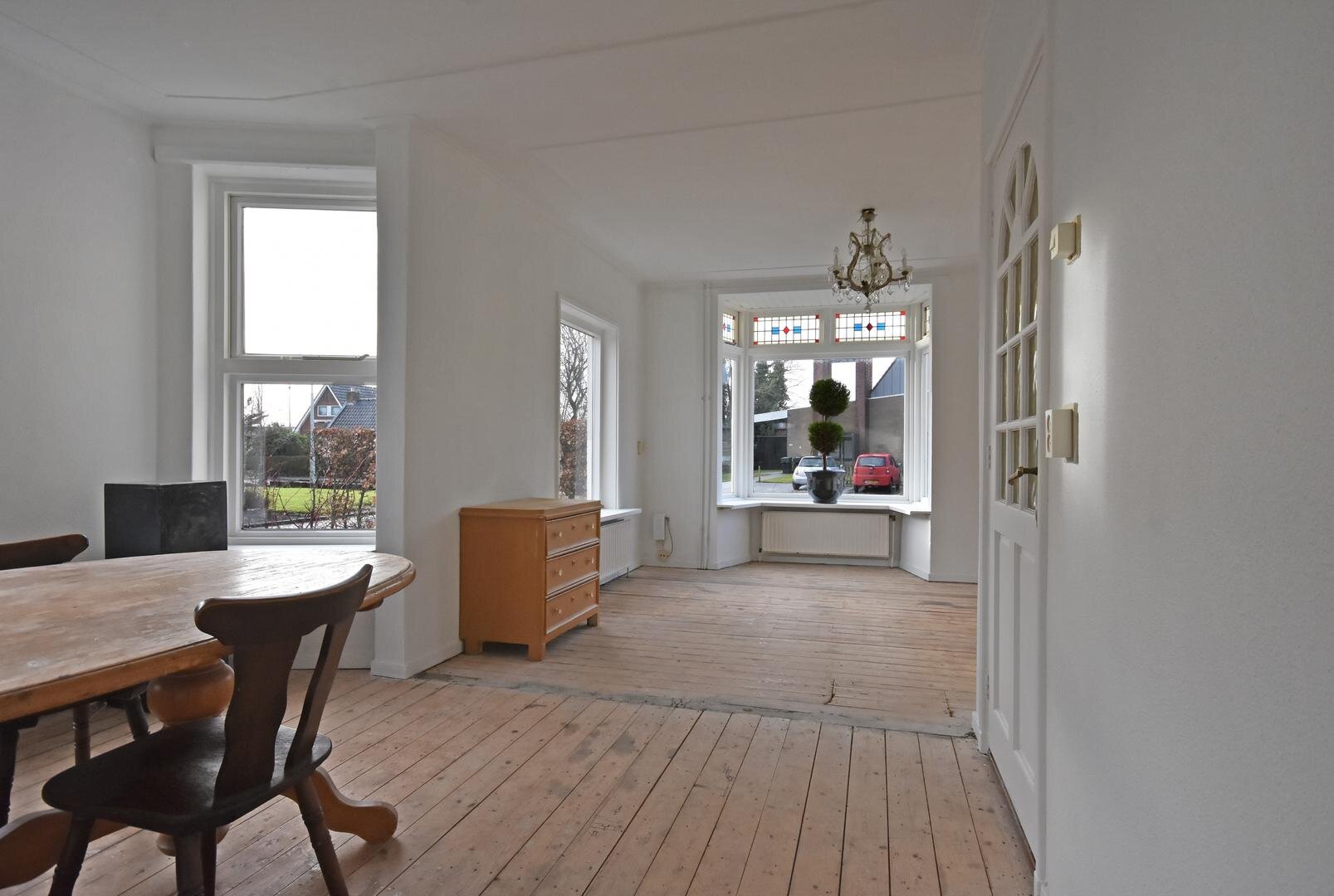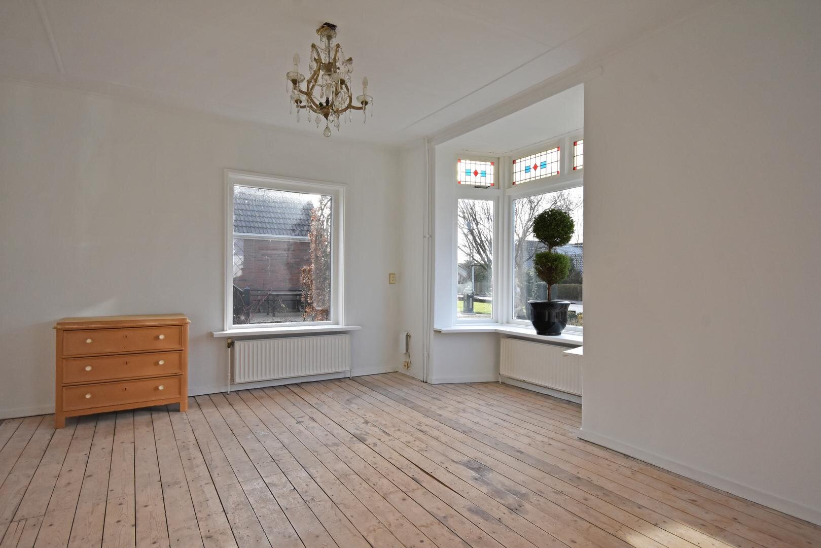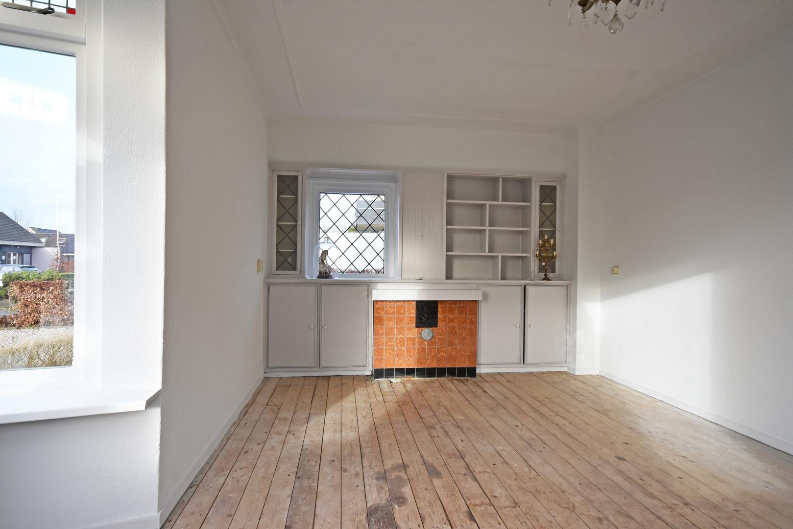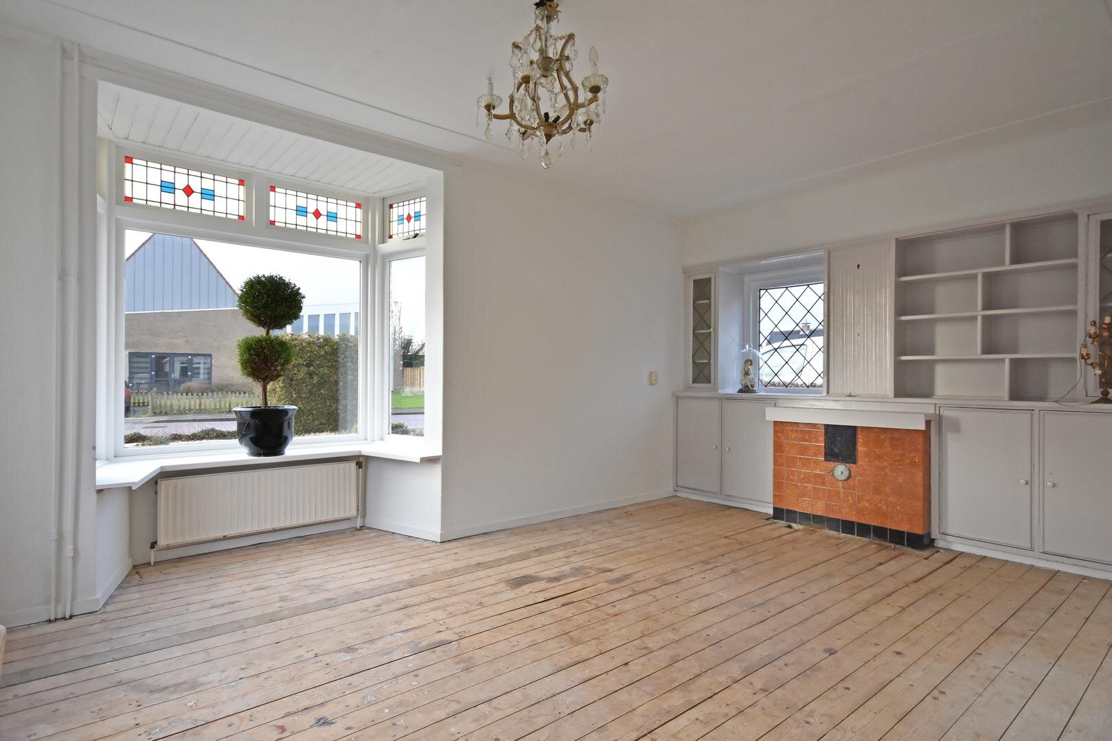 Begane grond: zij-entree, hal met garderobe, sfeervolle en zonnige woonkamer met erker, prachtige glas-in-lood ramen en vaste kasten, suitedeuren naar tuin/achterkamer met tuindeuren, eetkeuken met vaste kast, kelder en eenvoudige opstelling, bijkeuken met plavuizenvloer, achter-entree, witgoed-aansluiting en c.v.-opstelling, toilet met fonteintje, lichte badkamer met douche en wastafel.