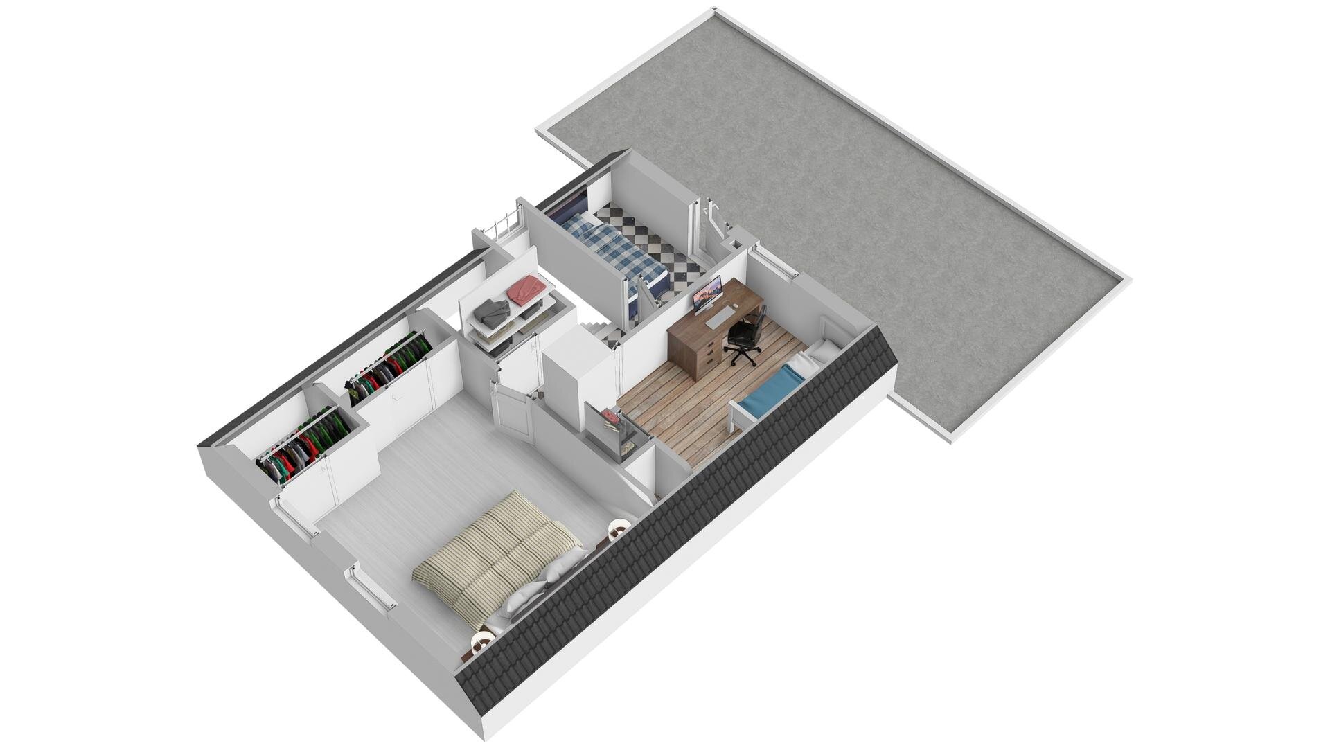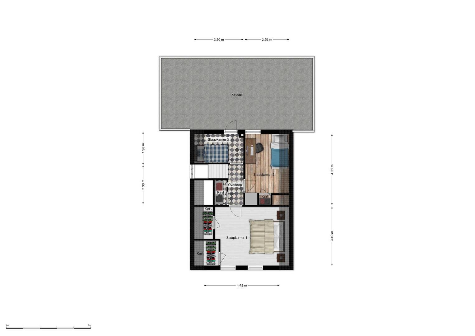 1e verdieping: overloop met vaste kast, 3 slaapkamers waarvan 2 met vaste kasten en 1 met deur naar platdak.