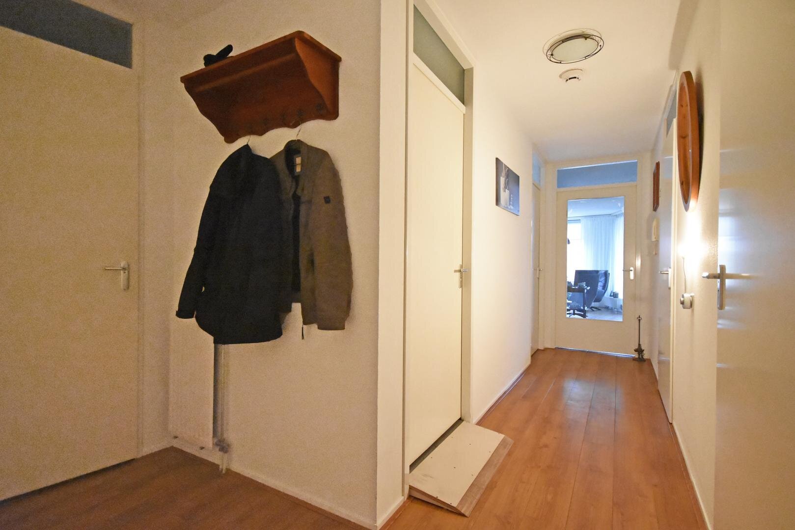 Begane grond: nette entree met hal, modern vrijdragend toilet met fonteintje (2018), een berging met witgoedaansluiting(en) en technische ruimte, twee slaapkamers en een moderne badkamer (2018) met inloopdouche en badkamermeubel met dubbele wastafel, zonnige woonkamer met dubbele deuren naar ruim balkon en open keuken met moderne hoekopstelling voorzien van diverse inbouwapparatuur.