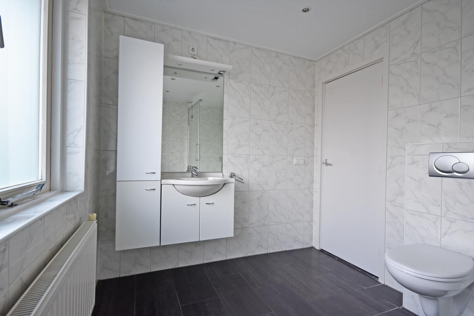 1e verdieping: overloop met laminaatvloer, 3 ruime slaapkamers met laminaatvloer waarvan 1 met balkon en 1 met wastafelmeubel, ruime, nette en lichte badkamer met vernieuwde douche, vrijdragend toilet, wastafelmeubel en wasmachine-aansluiting.