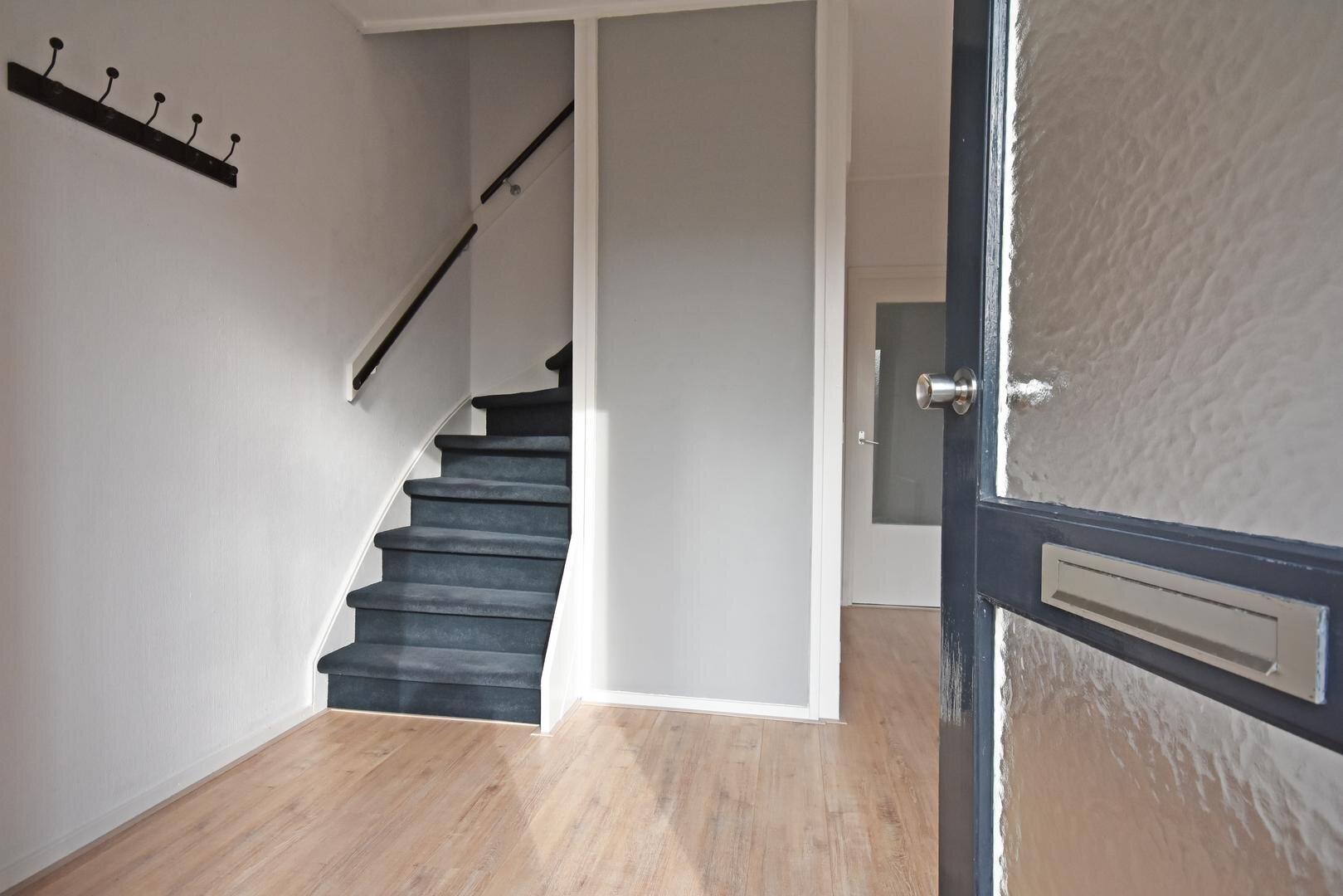 Begane grond: voor-entree, ruime hal met laminaatvloer, trapkast en vernieuwde meterkast, vrijdragend toilet met fonteintje, ruime en zonnige woonkamer met laminaatvloer, ruim groen/vrij uitzicht en erkerkozijn, open keuken met laminaatvloer en moderne hoekopstelling v.v. diverse inbouwapparatuur, ruime bijkeuken met achter-entree, aangebouwde stenen berging met c.v.-opstelling.