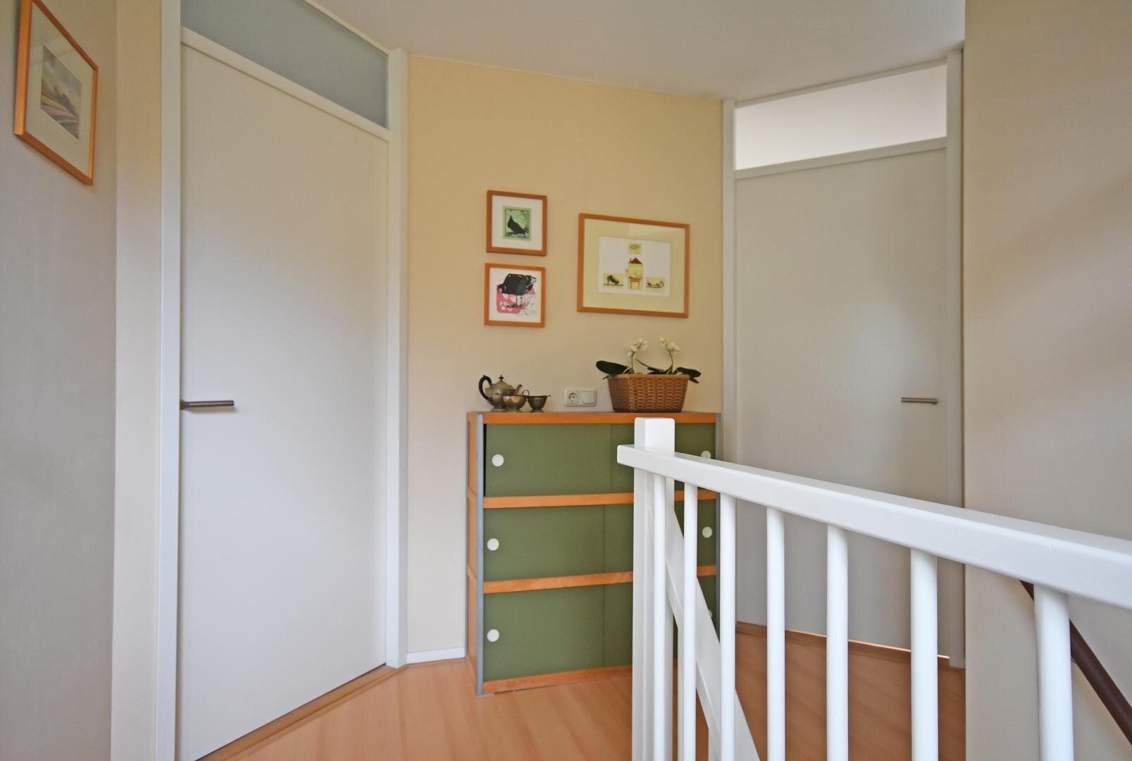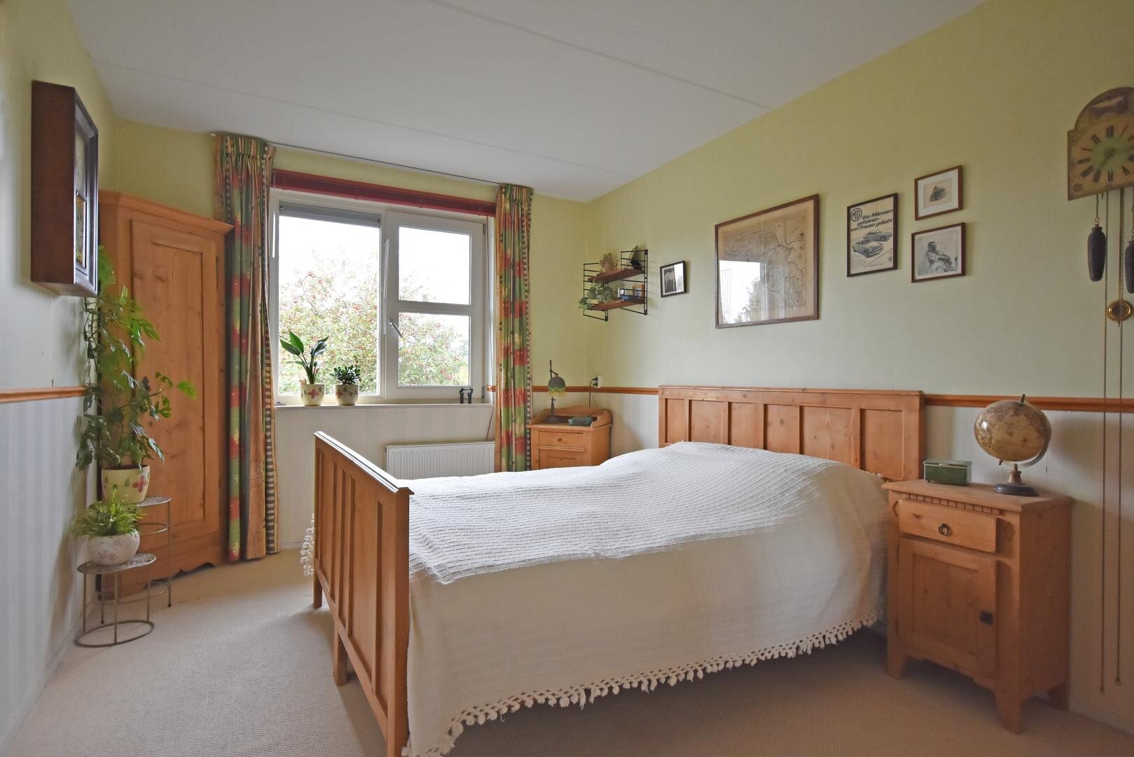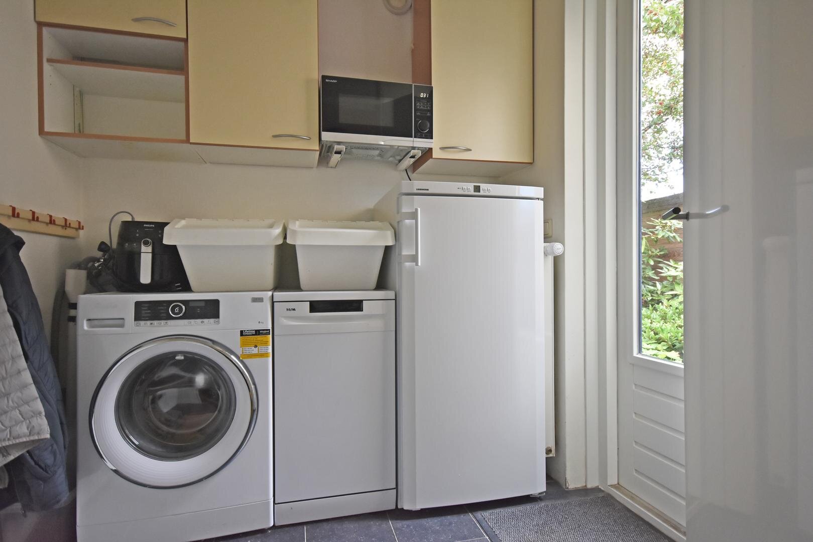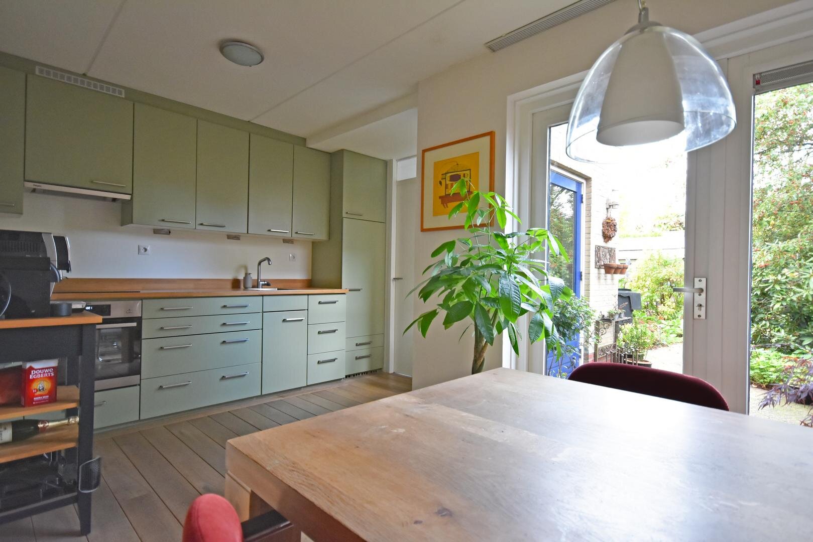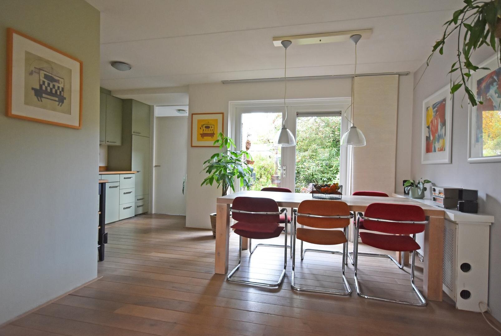 Begane grond: zij-entree, hal met duurzame kurkvloer, vrijdragend toilet met fonteintje, ruime zonnige woonkamer met warme massief houten (eiken) vloerdelen en deels vrij groen landelijk uitzicht (westzijde), open keuken met massief houten (eiken) vloerdelen, tuindeuren en nette opstelling v.v. diverse (deels vernieuwde) inbouwapparatuur en veel kastruimte, uitpandige bijkeuken met plavuizenvloer, witgoed-aansluiting, tuindeur en doorgang naar verlengde garage van ca. 3 x 8 meter met achter-entree.
