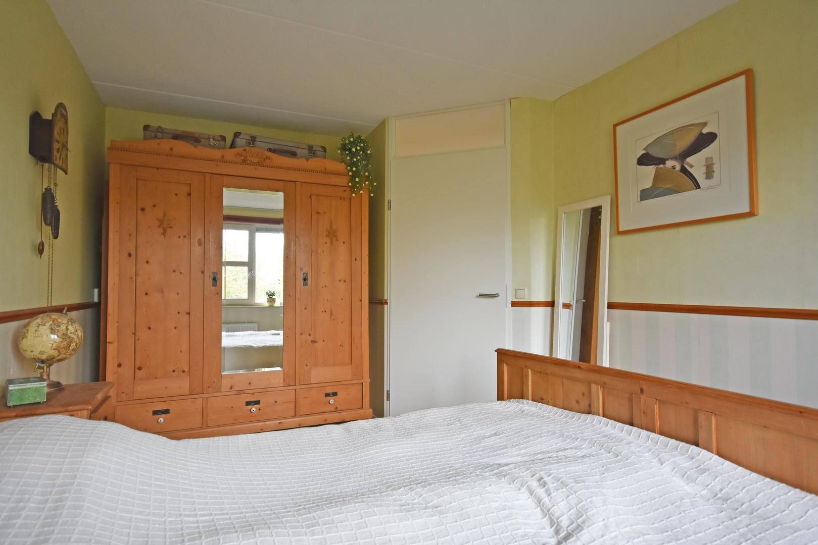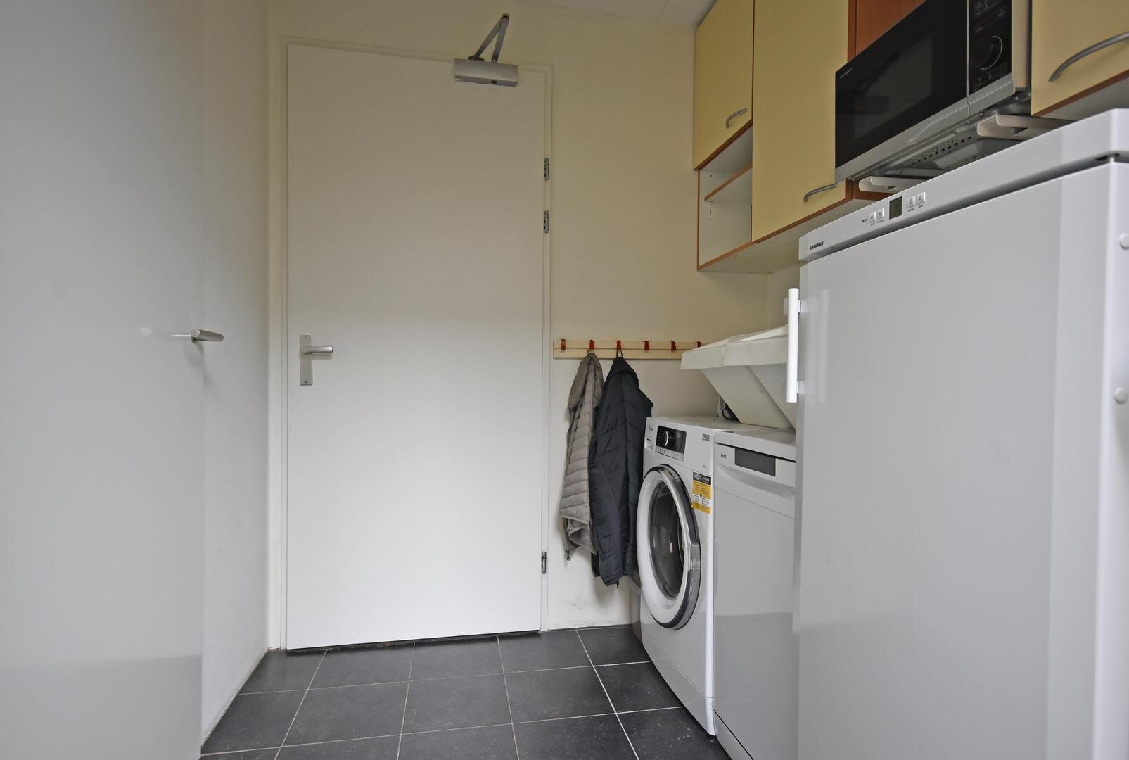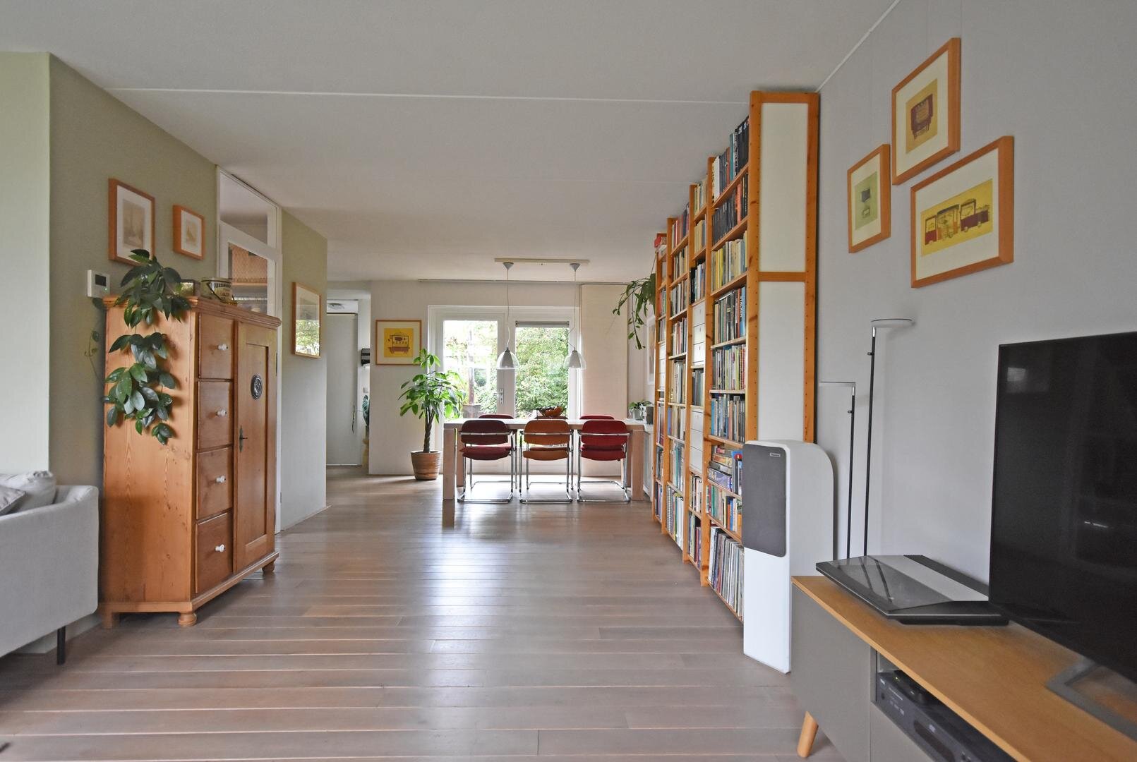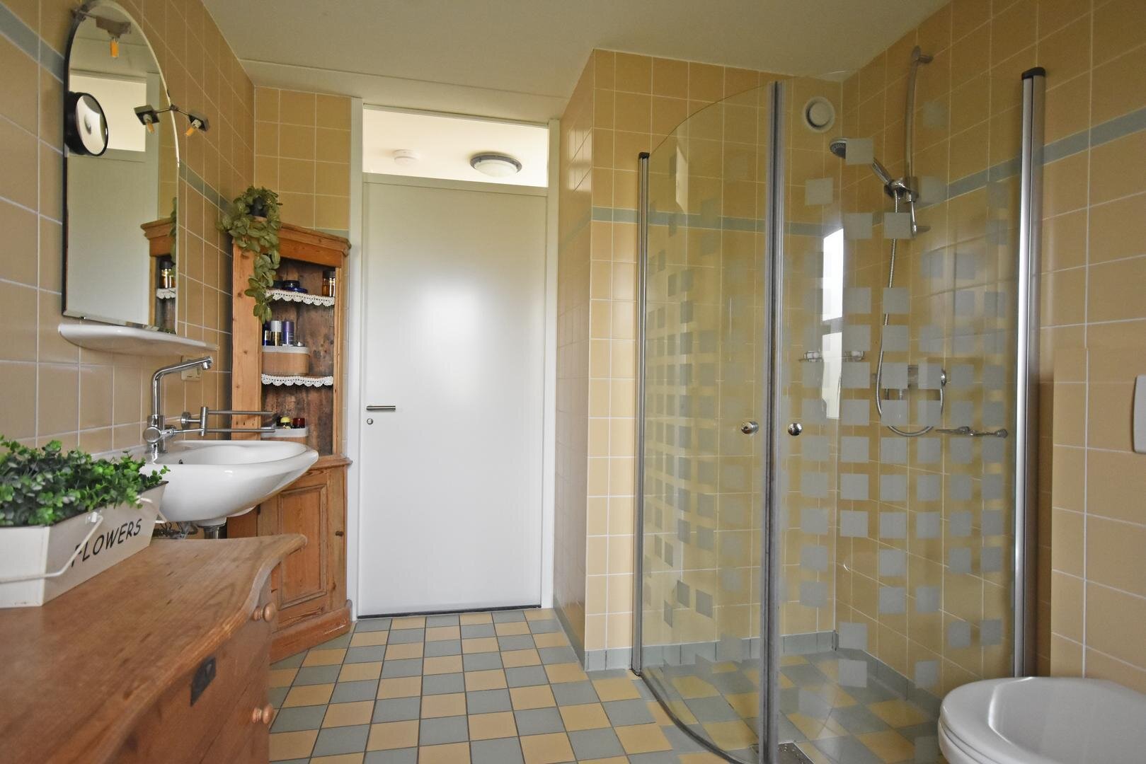 Begane grond: zij-entree, hal met duurzame kurkvloer, vrijdragend toilet met fonteintje, ruime zonnige woonkamer met warme massief houten (eiken) vloerdelen en deels vrij groen landelijk uitzicht (westzijde), open keuken met massief houten (eiken) vloerdelen, tuindeuren en nette opstelling v.v. diverse (deels vernieuwde) inbouwapparatuur en veel kastruimte, uitpandige bijkeuken met plavuizenvloer, witgoed-aansluiting, tuindeur en doorgang naar verlengde garage van ca. 3 x 8 meter met achter-entree.