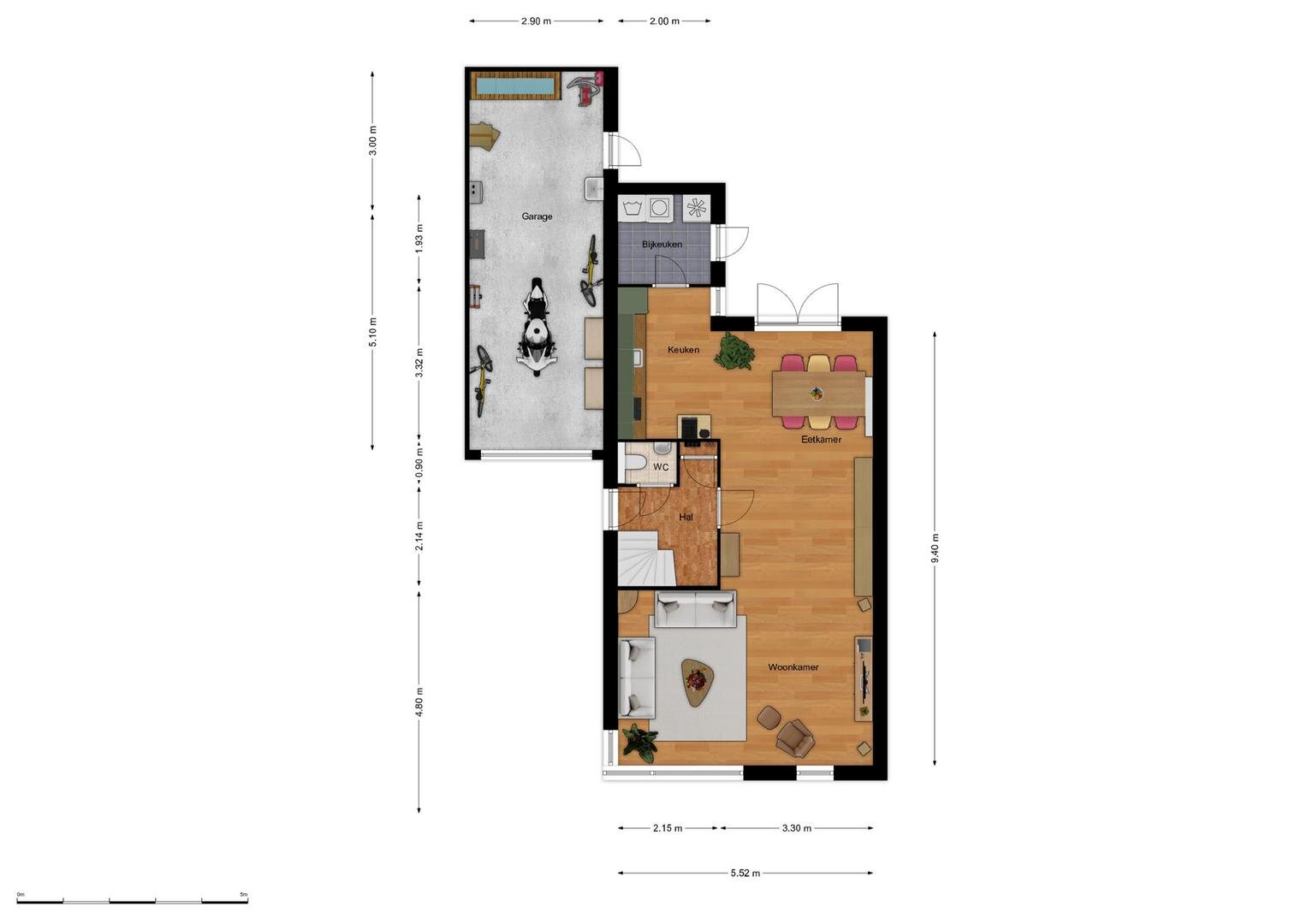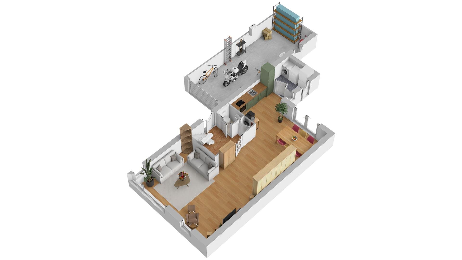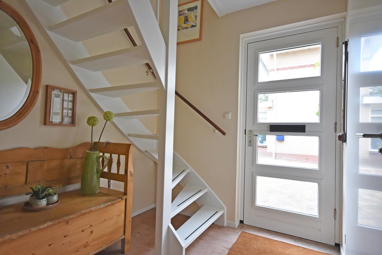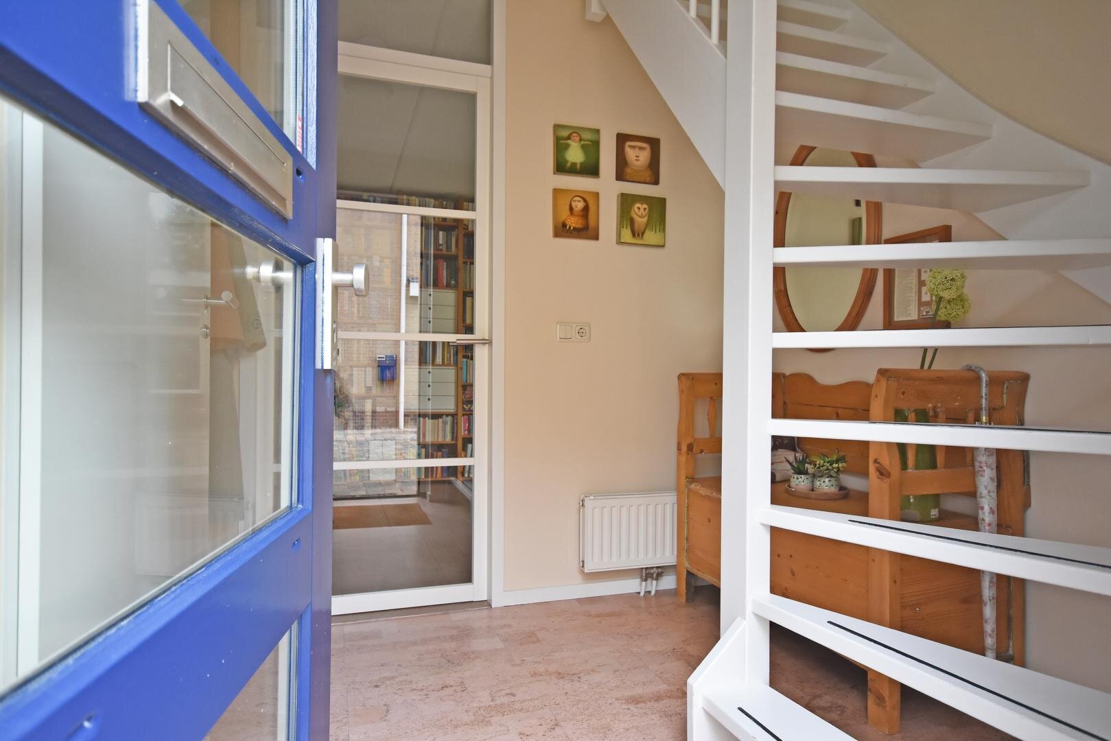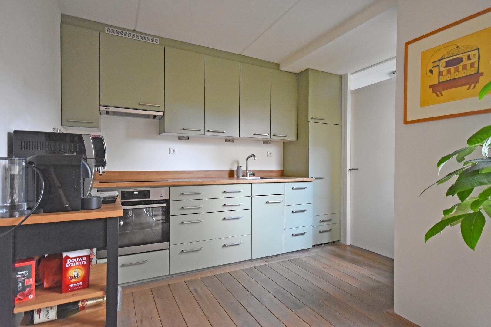 Begane grond: zij-entree, hal met duurzame kurkvloer, vrijdragend toilet met fonteintje, ruime zonnige woonkamer met warme massief houten (eiken) vloerdelen en deels vrij groen landelijk uitzicht (westzijde), open keuken met massief houten (eiken) vloerdelen, tuindeuren en nette opstelling v.v. diverse (deels vernieuwde) inbouwapparatuur en veel kastruimte, uitpandige bijkeuken met plavuizenvloer, witgoed-aansluiting, tuindeur en doorgang naar verlengde garage van ca. 3 x 8 meter met achter-entree.