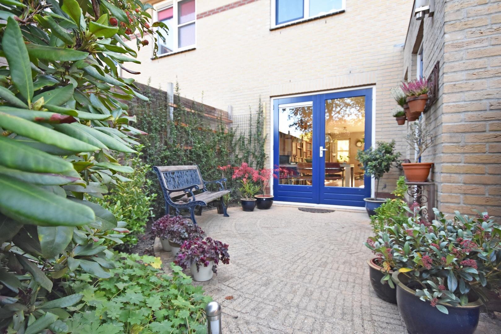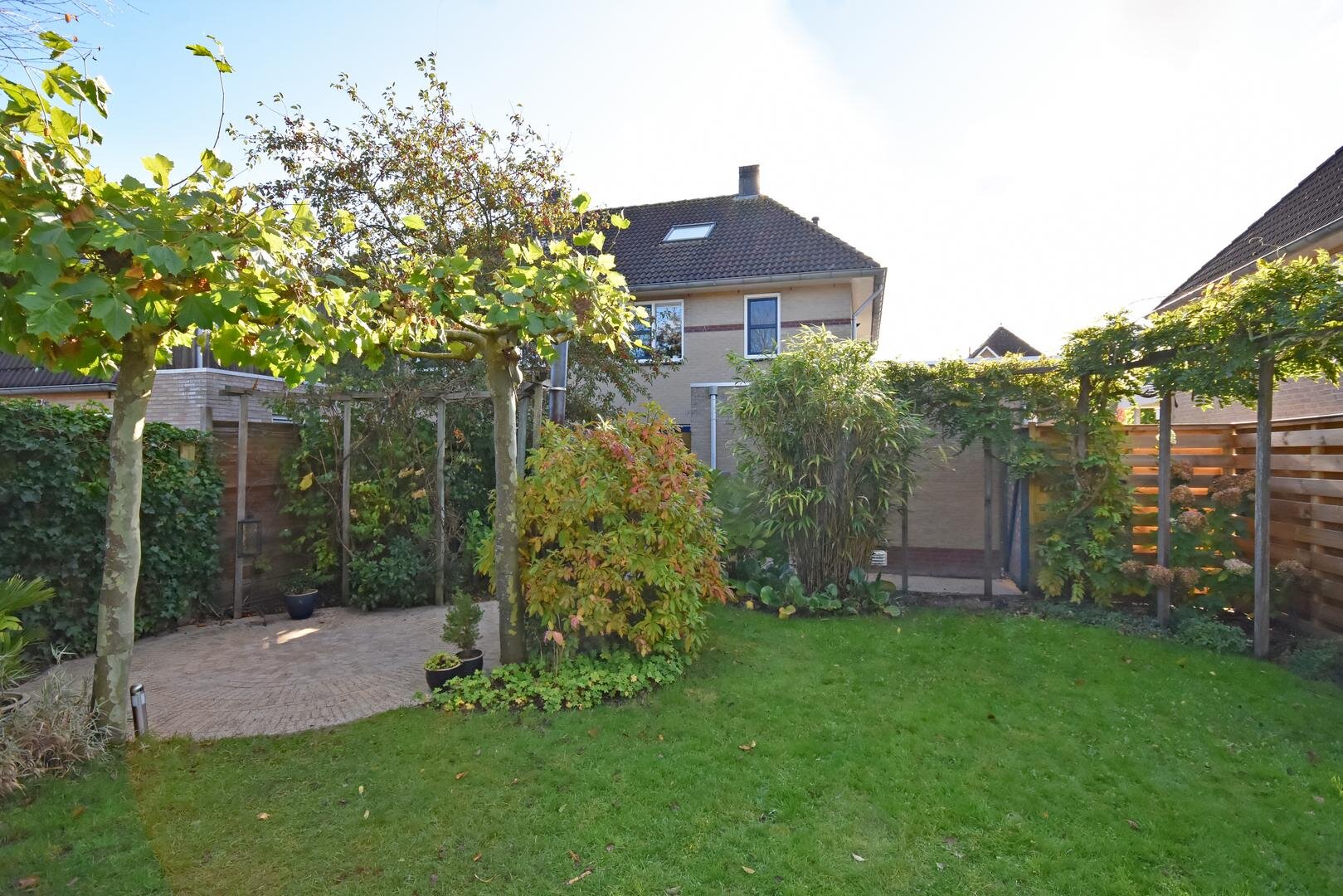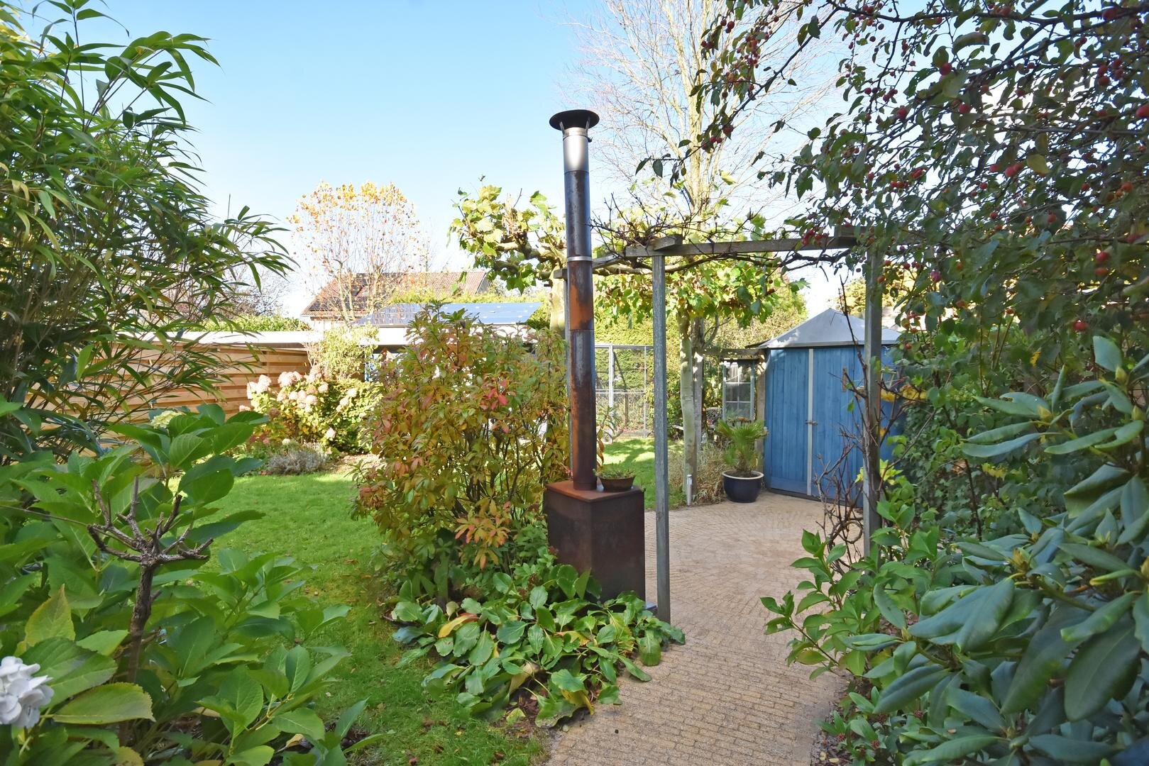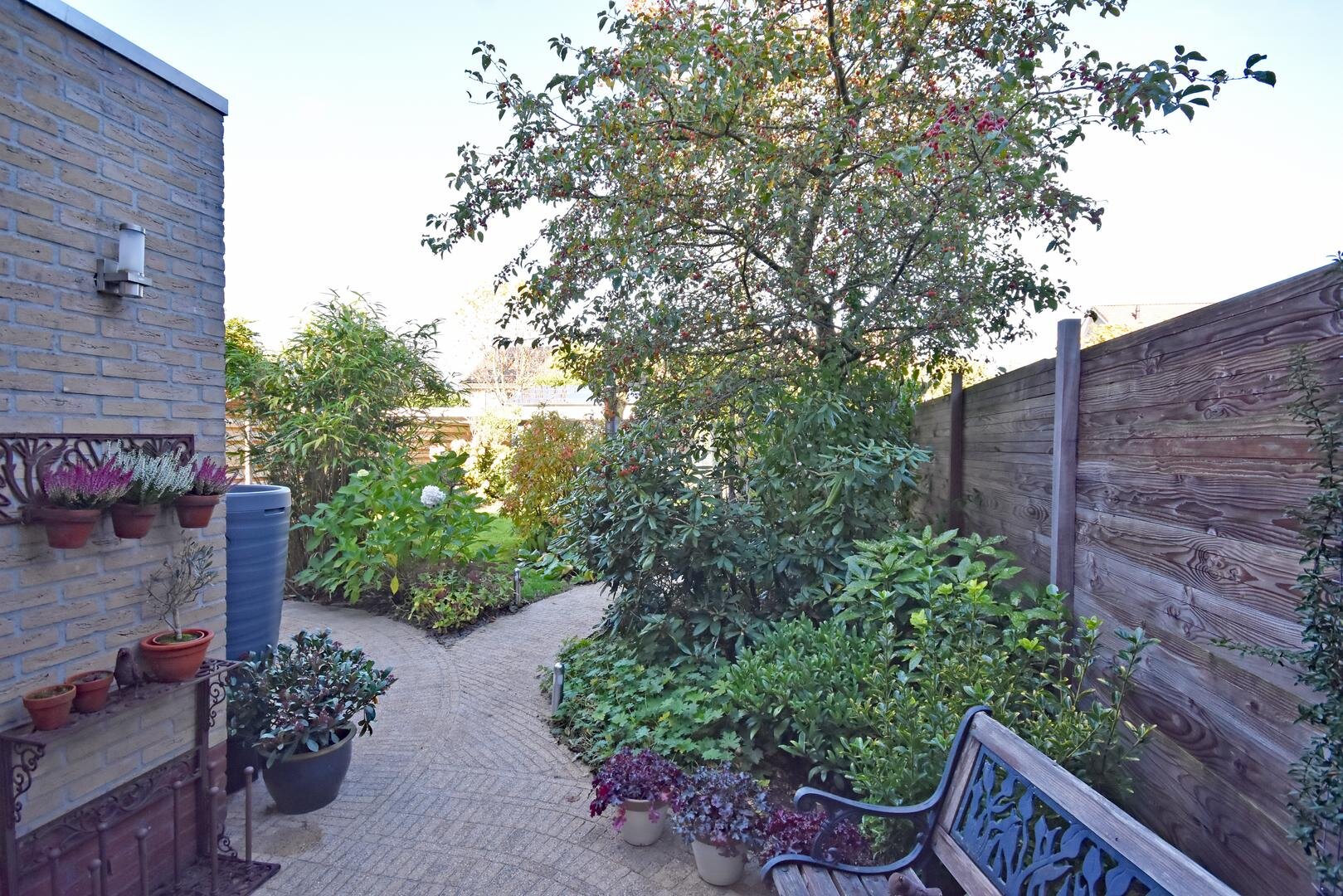 Aan de achterzijde bevindt zich een royale, diepe en zonnige tuin (ca. 20 meter diep) op het noordwesten met meerdere zonneterrassen, afsluitbare achterom en houten berging. De groene privacy volle tuin is fraai aangelegd en een lust voor het oog.