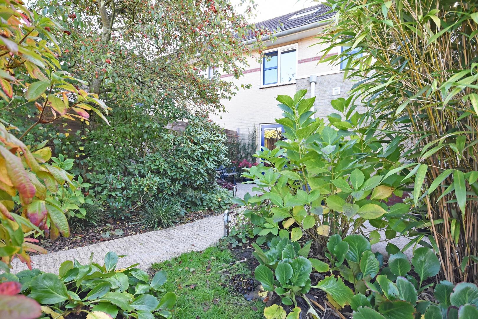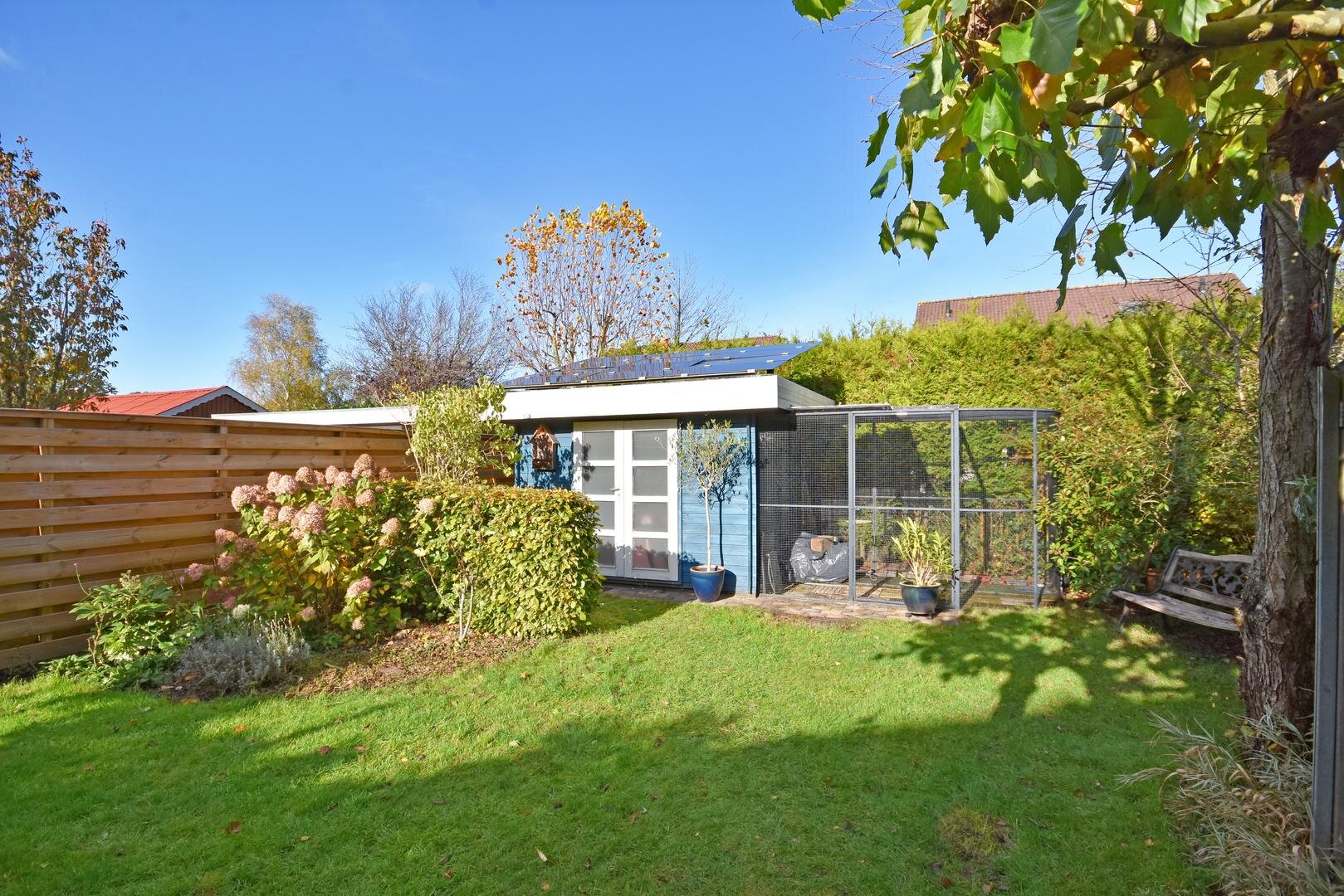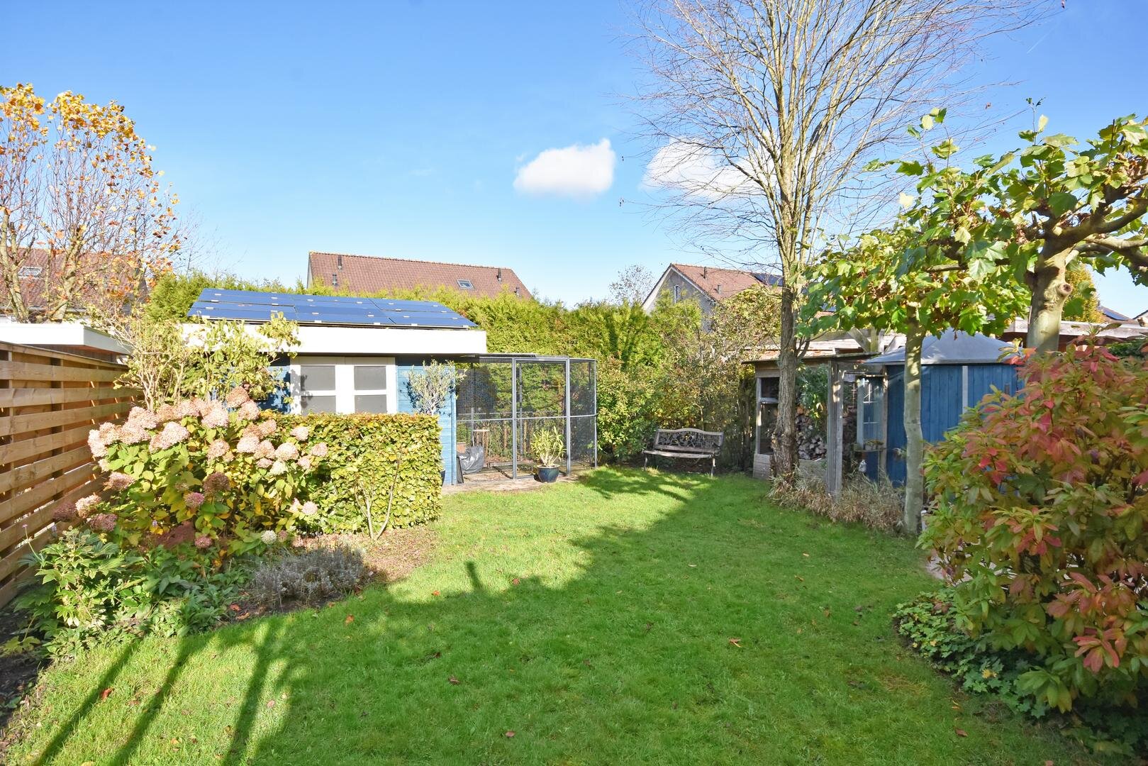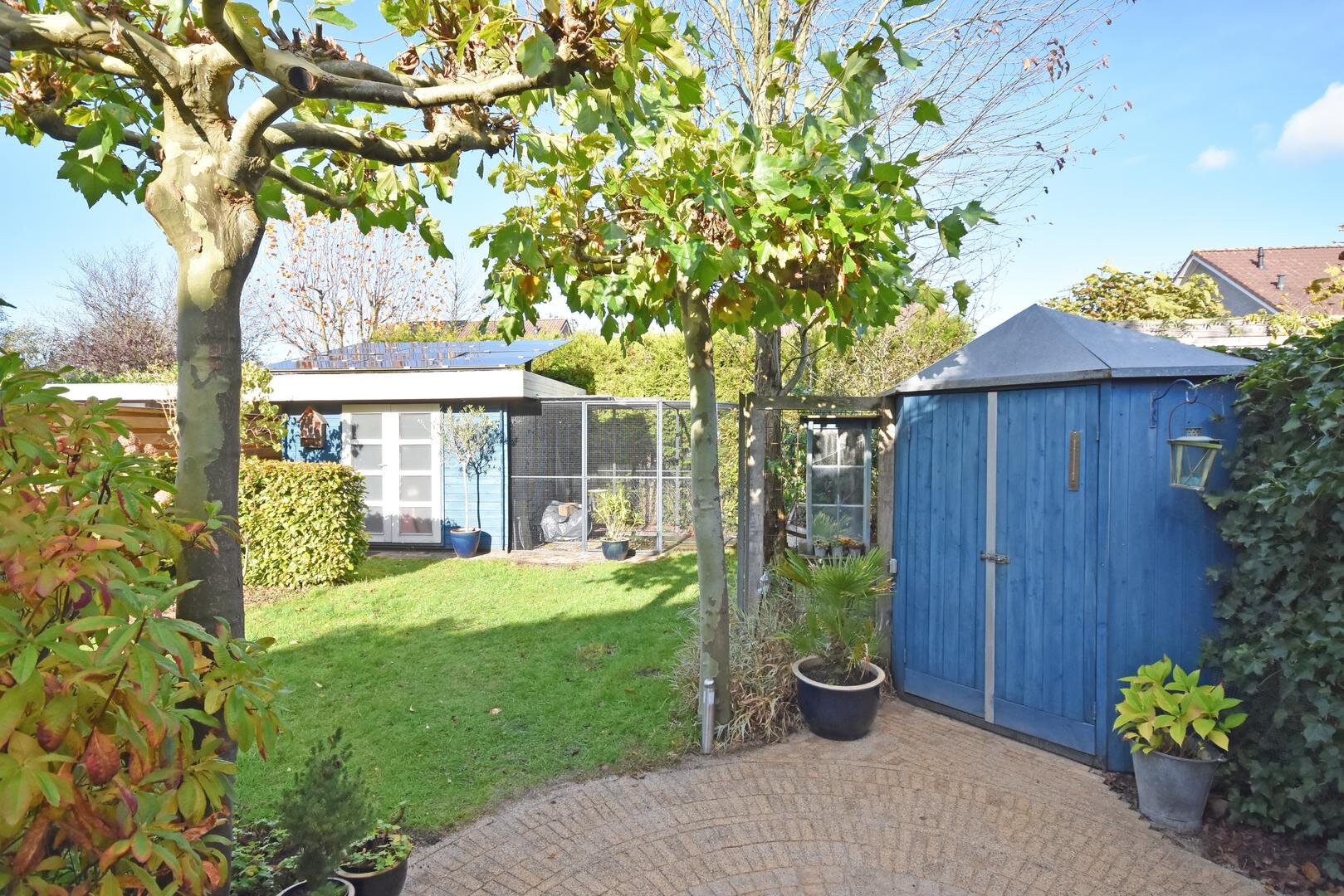 Aan de achterzijde bevindt zich een royale, diepe en zonnige tuin (ca. 20 meter diep) op het noordwesten met meerdere zonneterrassen, afsluitbare achterom en houten berging. De groene privacy volle tuin is fraai aangelegd en een lust voor het oog.