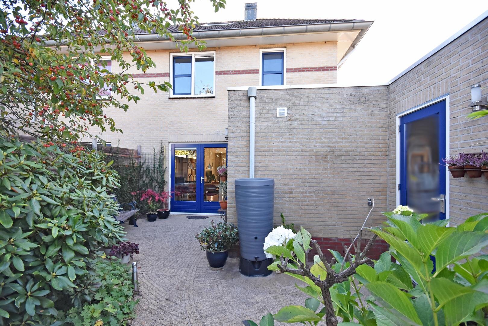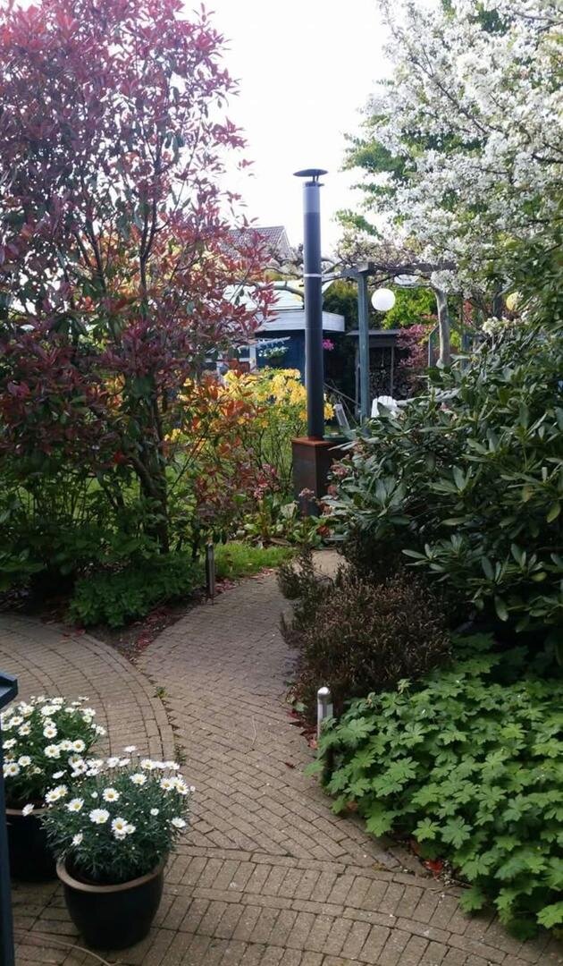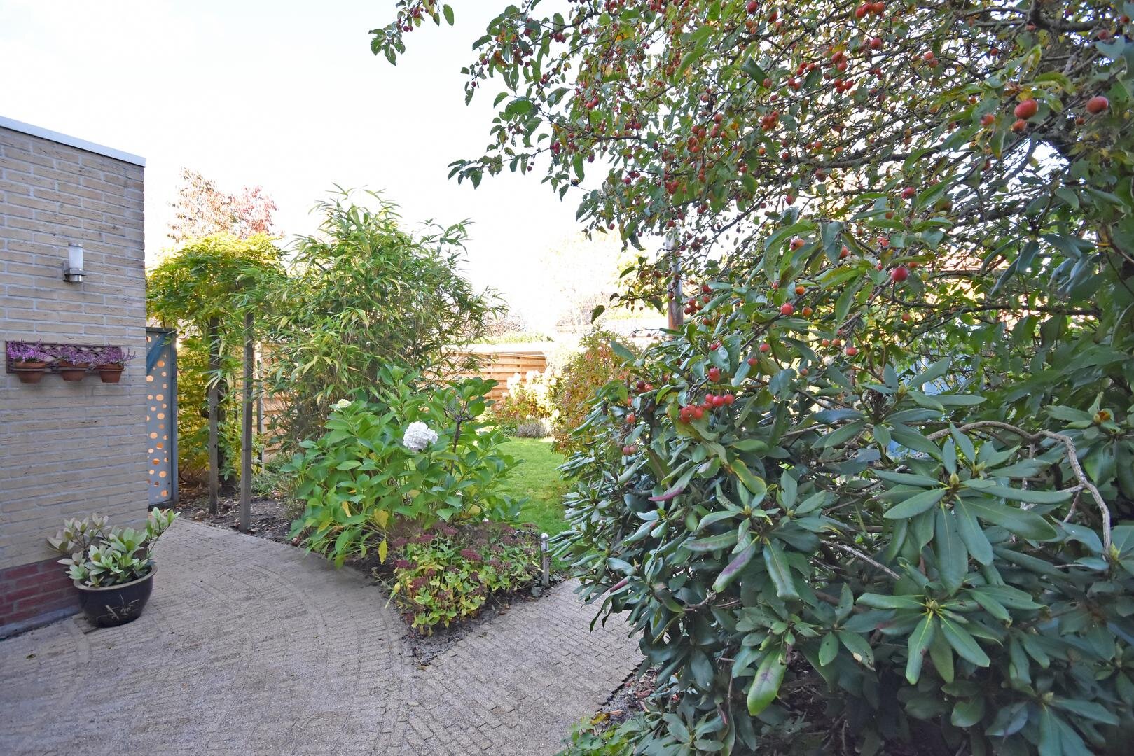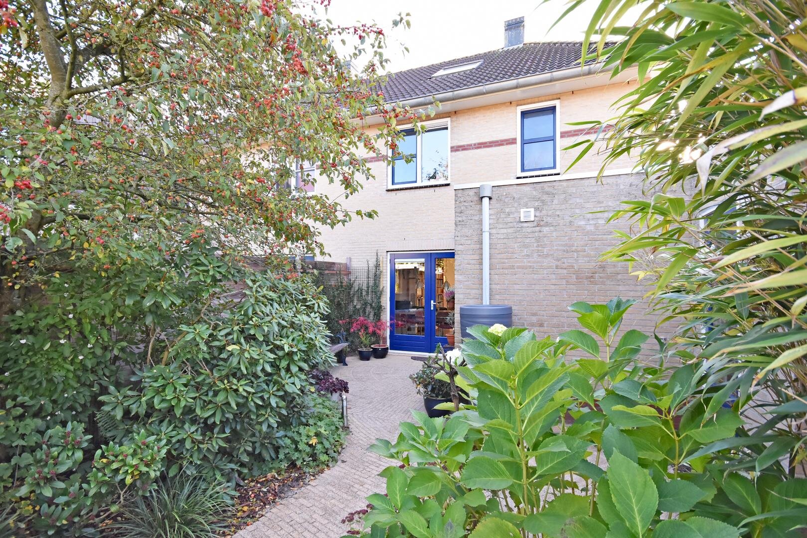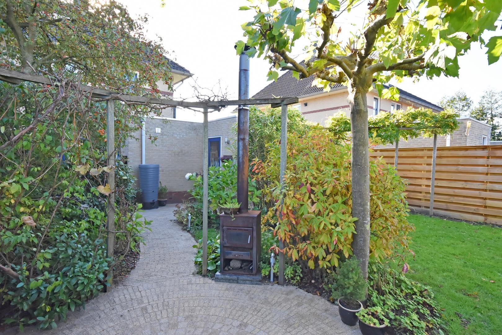 Aan de achterzijde bevindt zich een royale, diepe en zonnige tuin (ca. 20 meter diep) op het noordwesten met meerdere zonneterrassen, afsluitbare achterom en houten berging. De groene privacy volle tuin is fraai aangelegd en een lust voor het oog.
