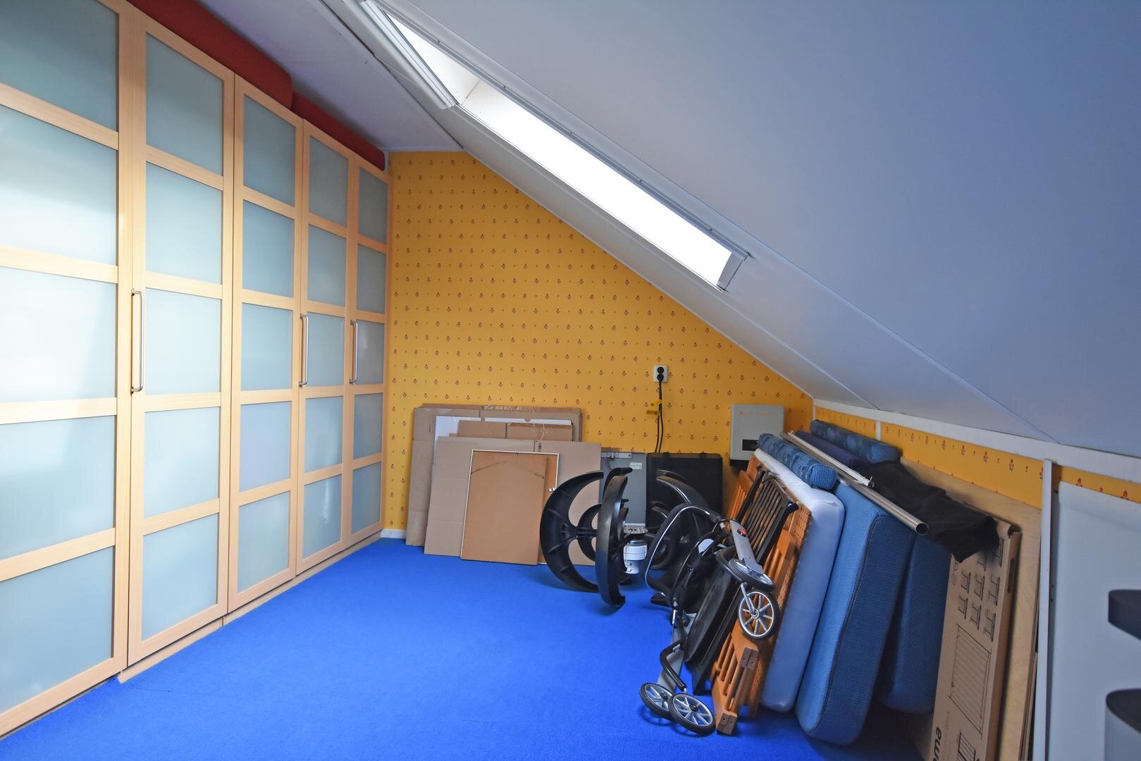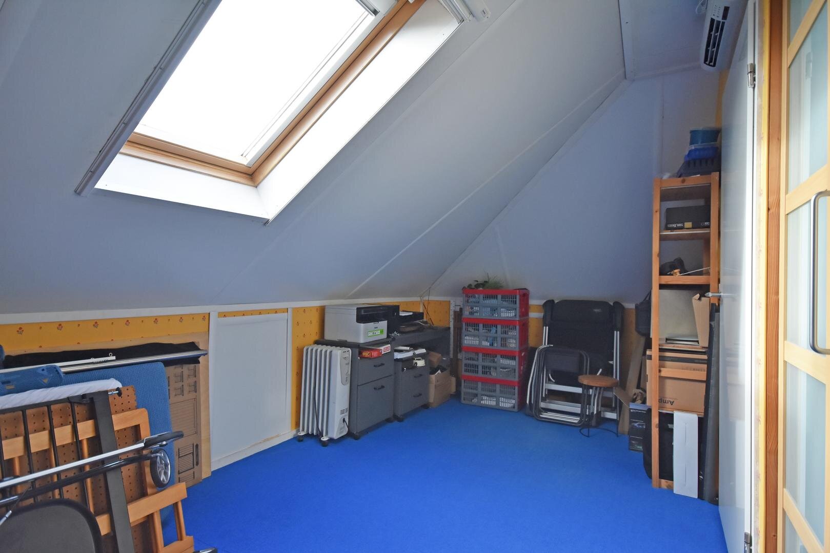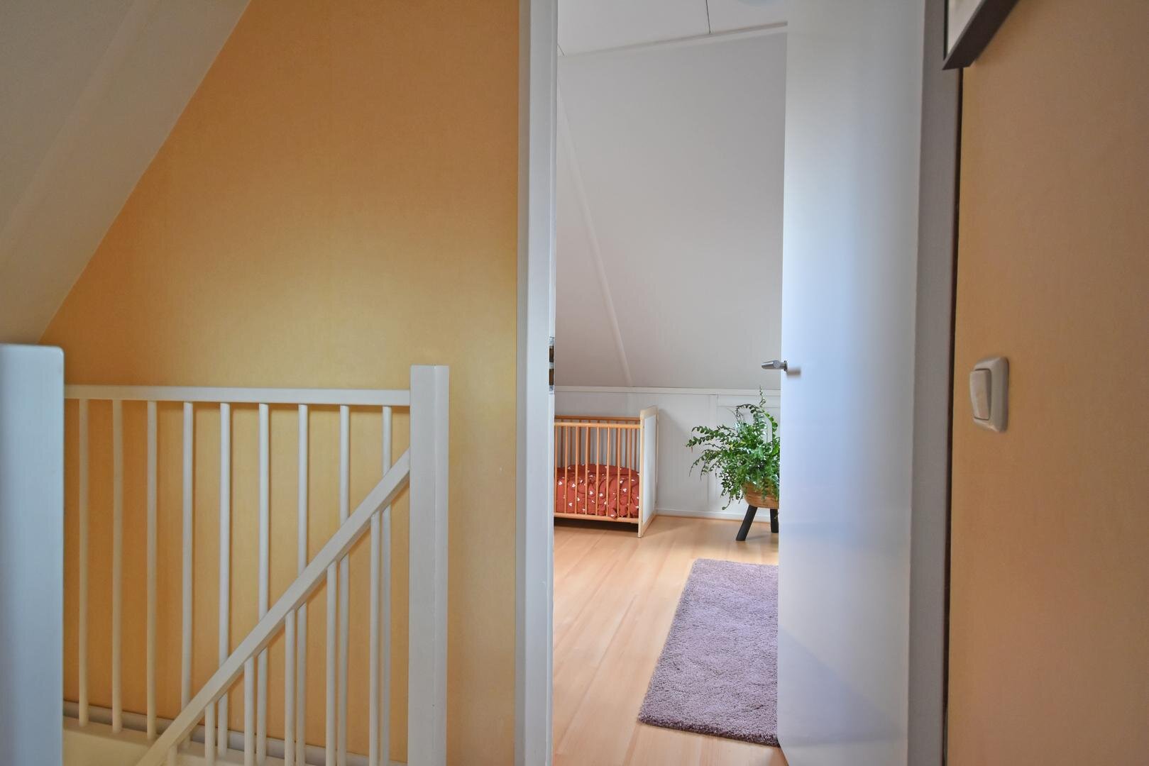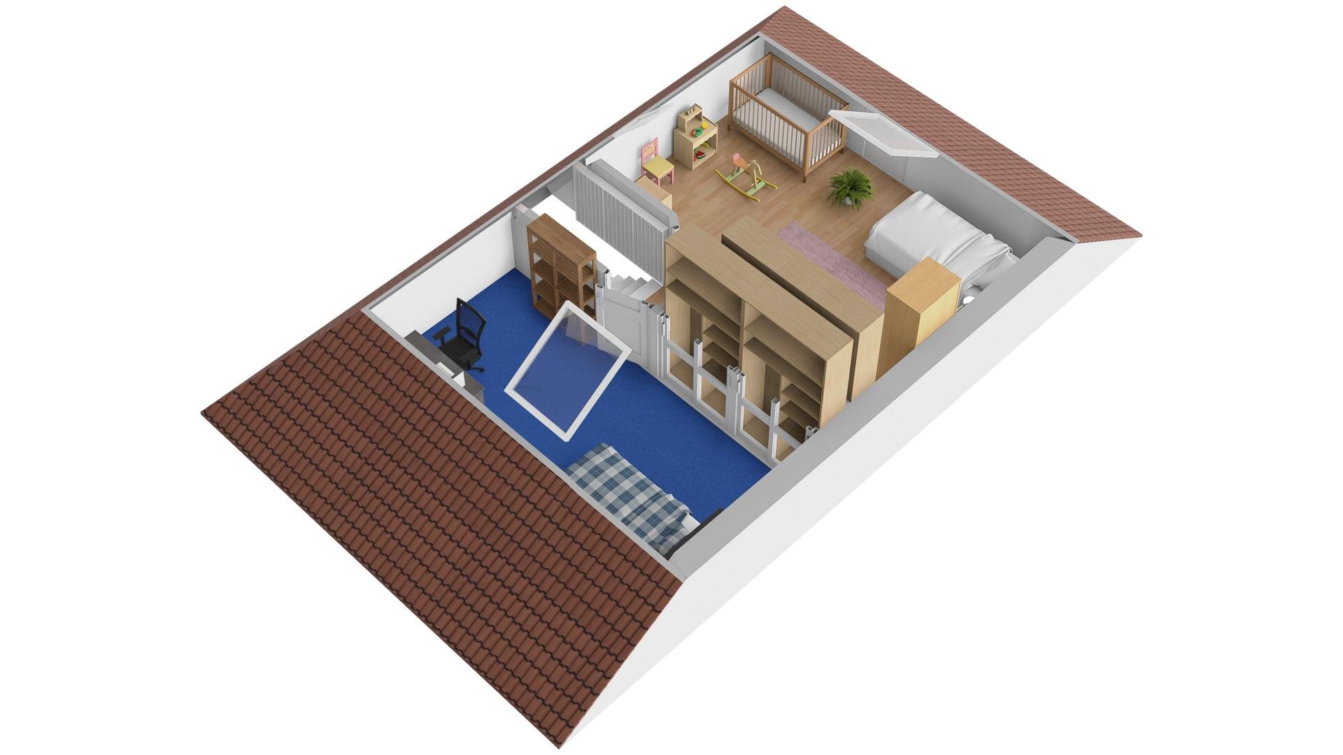 2e verdieping: vaste trap naar overloop, 2 slaapkamers met bergruimte achter knieschotten waarvan 1 met laminaatvloer.