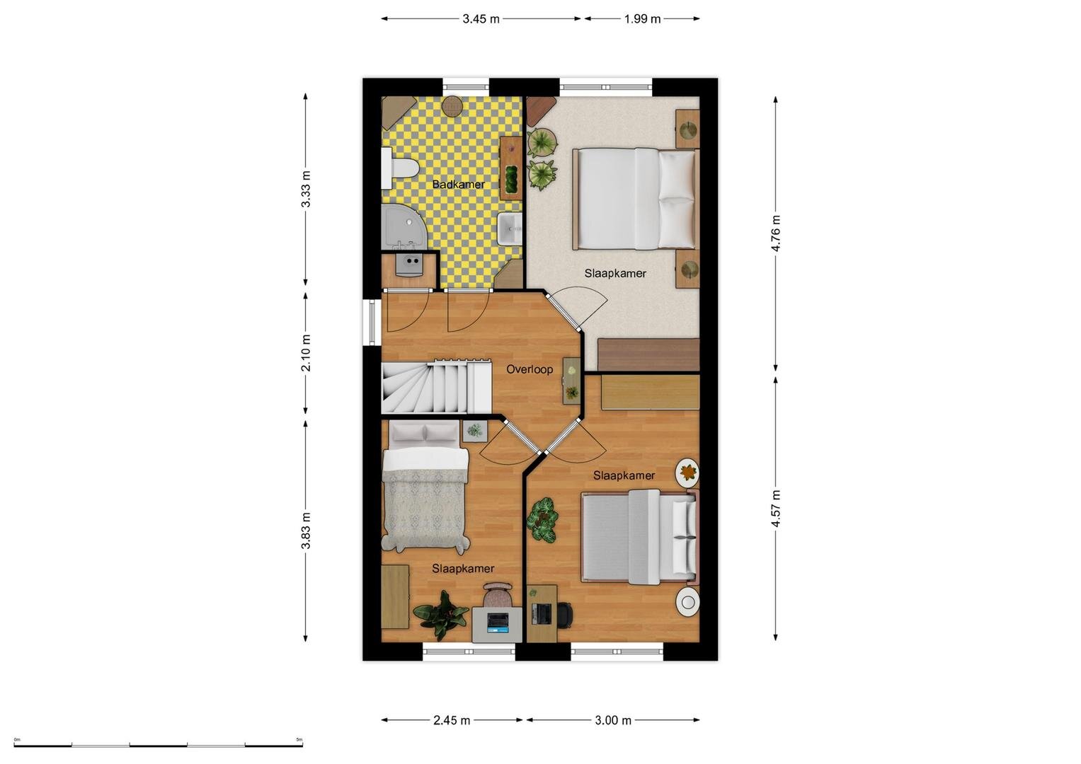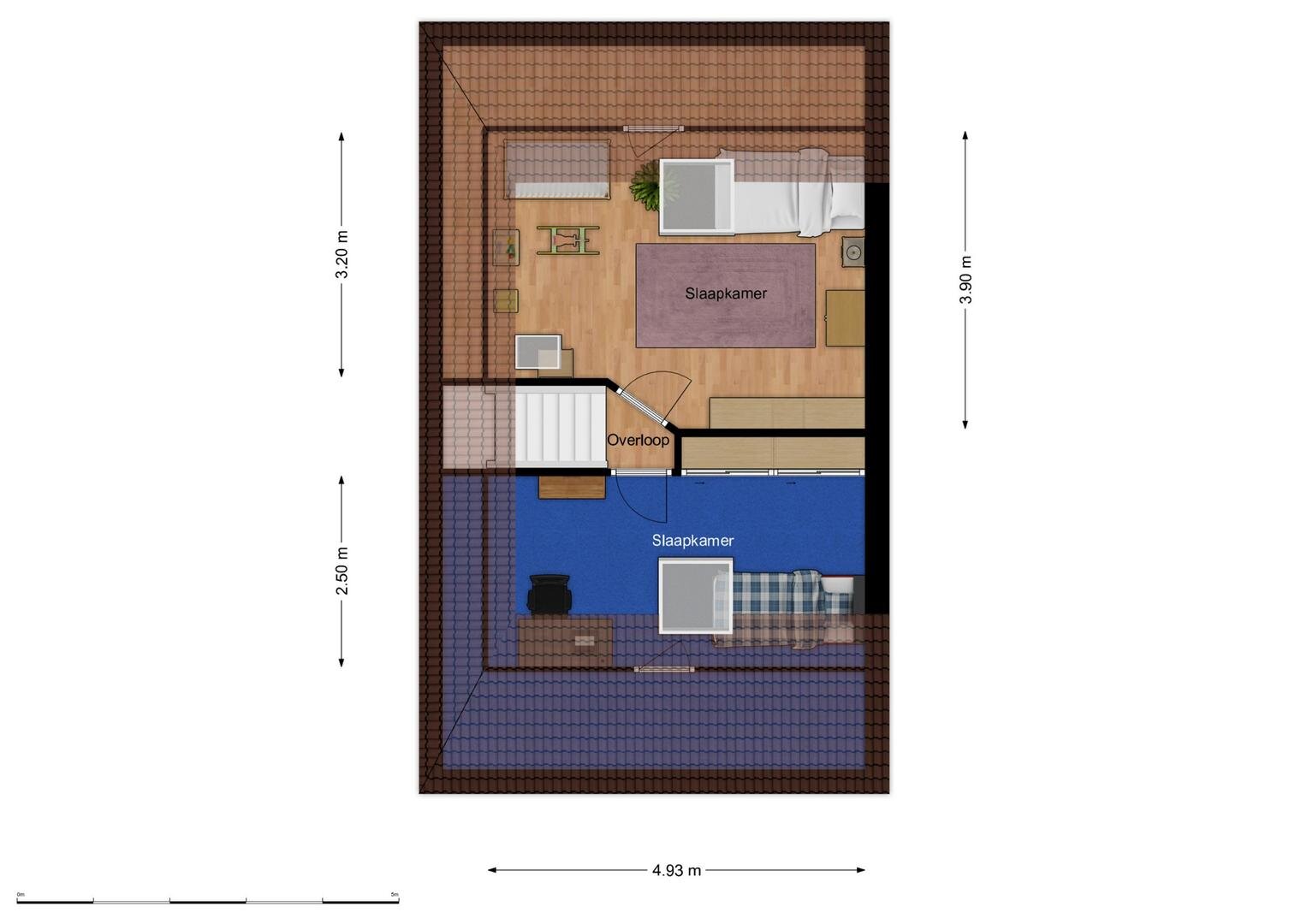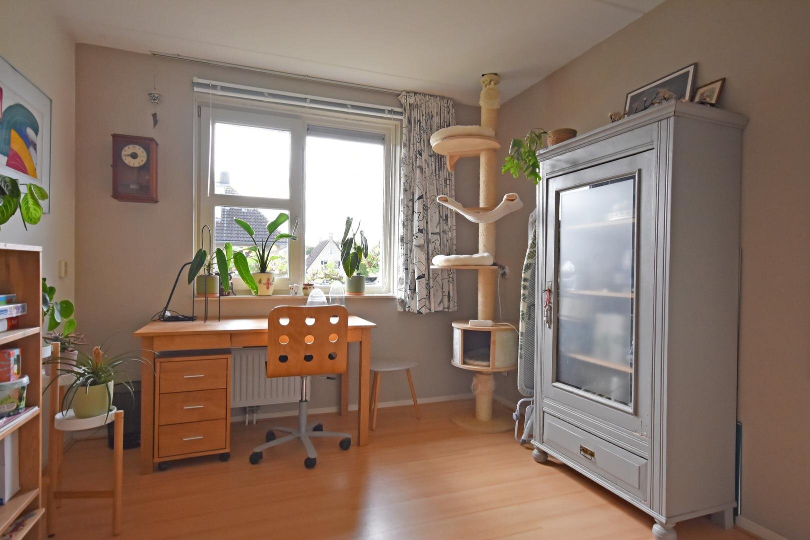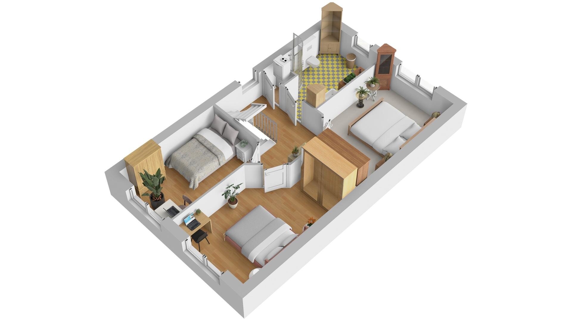 2e verdieping: vaste trap naar overloop, 2 slaapkamers met bergruimte achter knieschotten waarvan 1 met laminaatvloer.